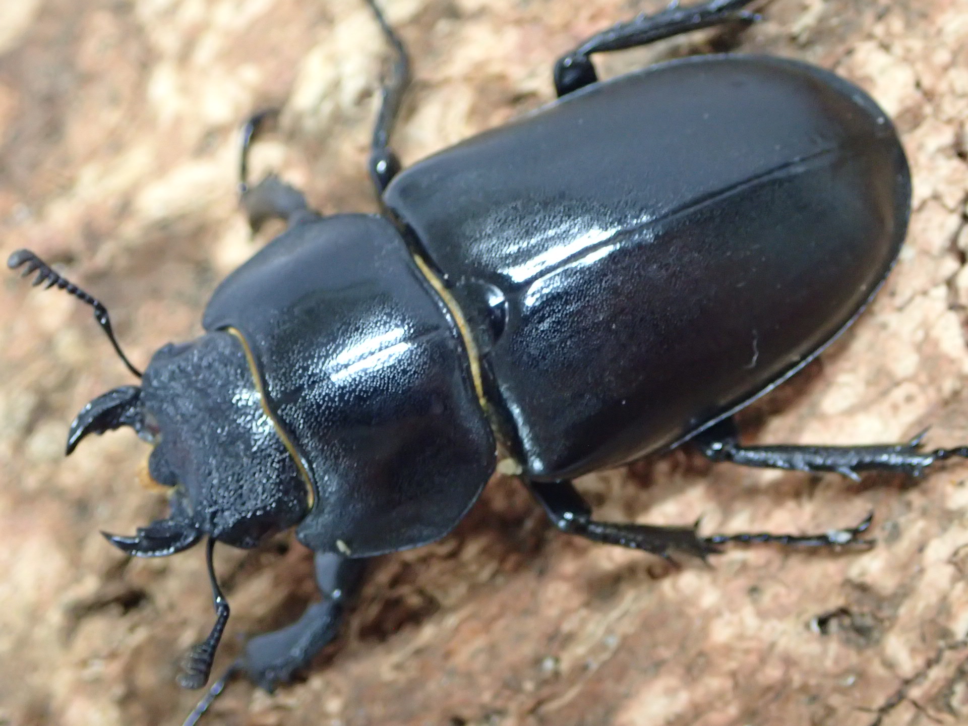 稀に全身黒色の型がみられ、大アゴは太く強壮で光沢があり、先端は大きく二又に分かれます。