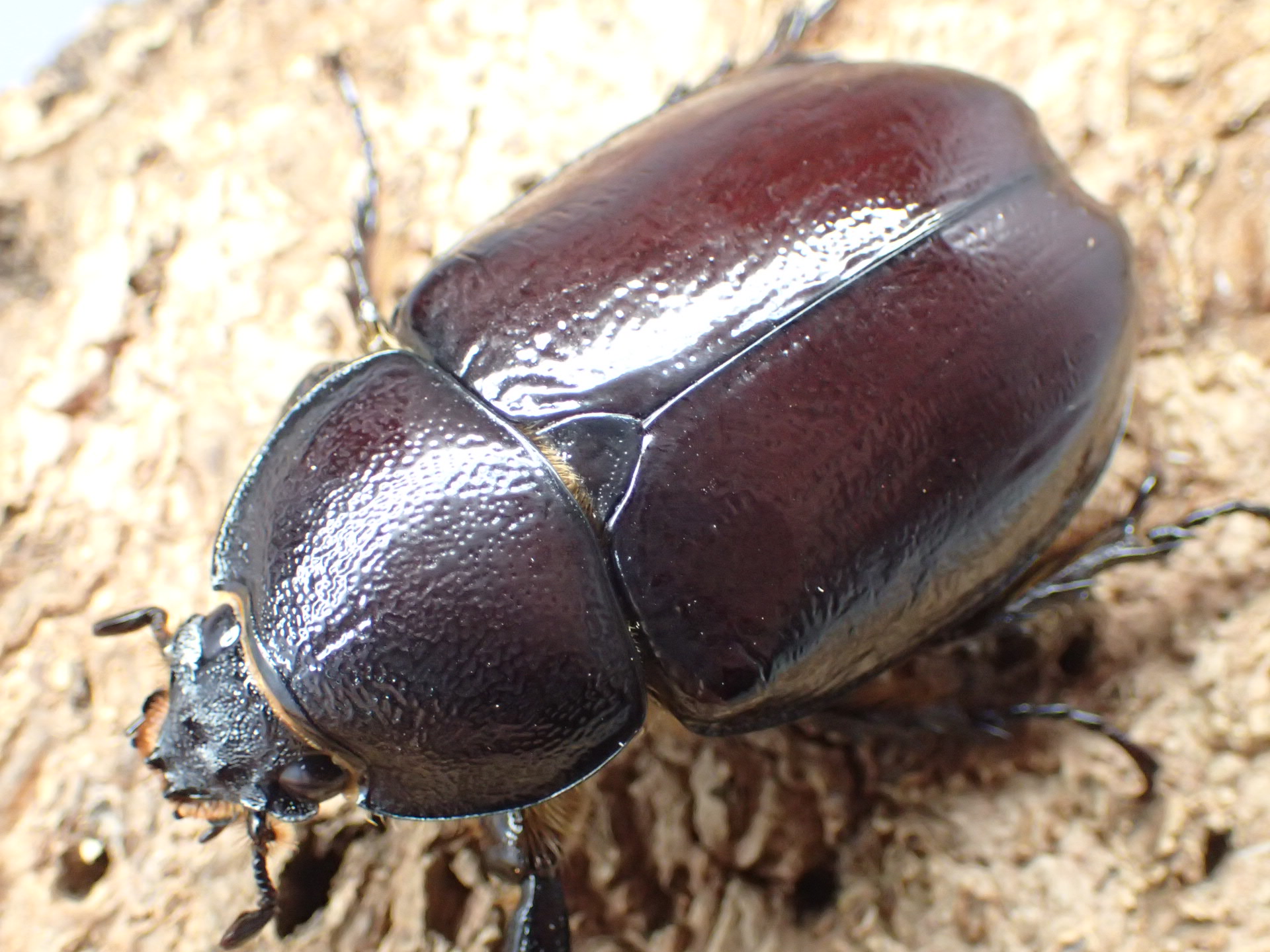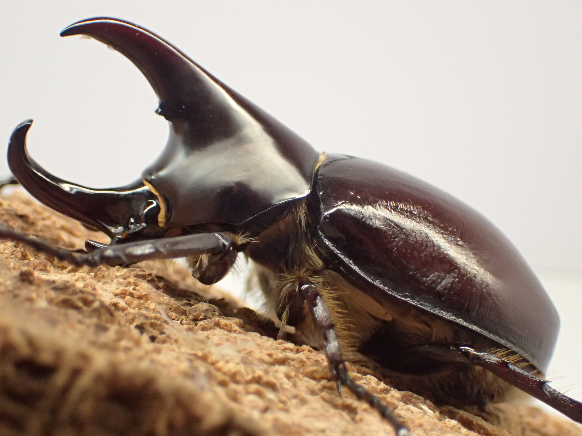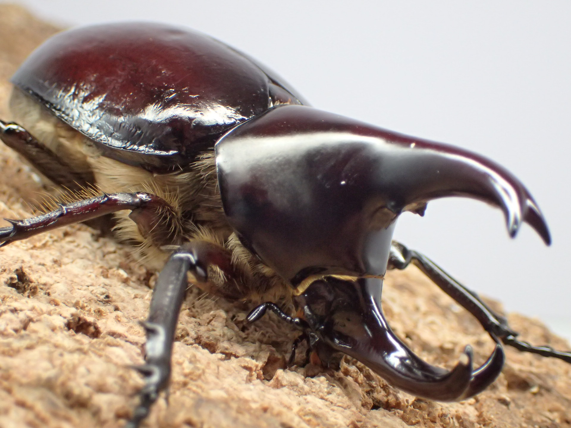 頭角と胸角が長く伸び、強い光沢と赤味を帯びたカブトムシです。