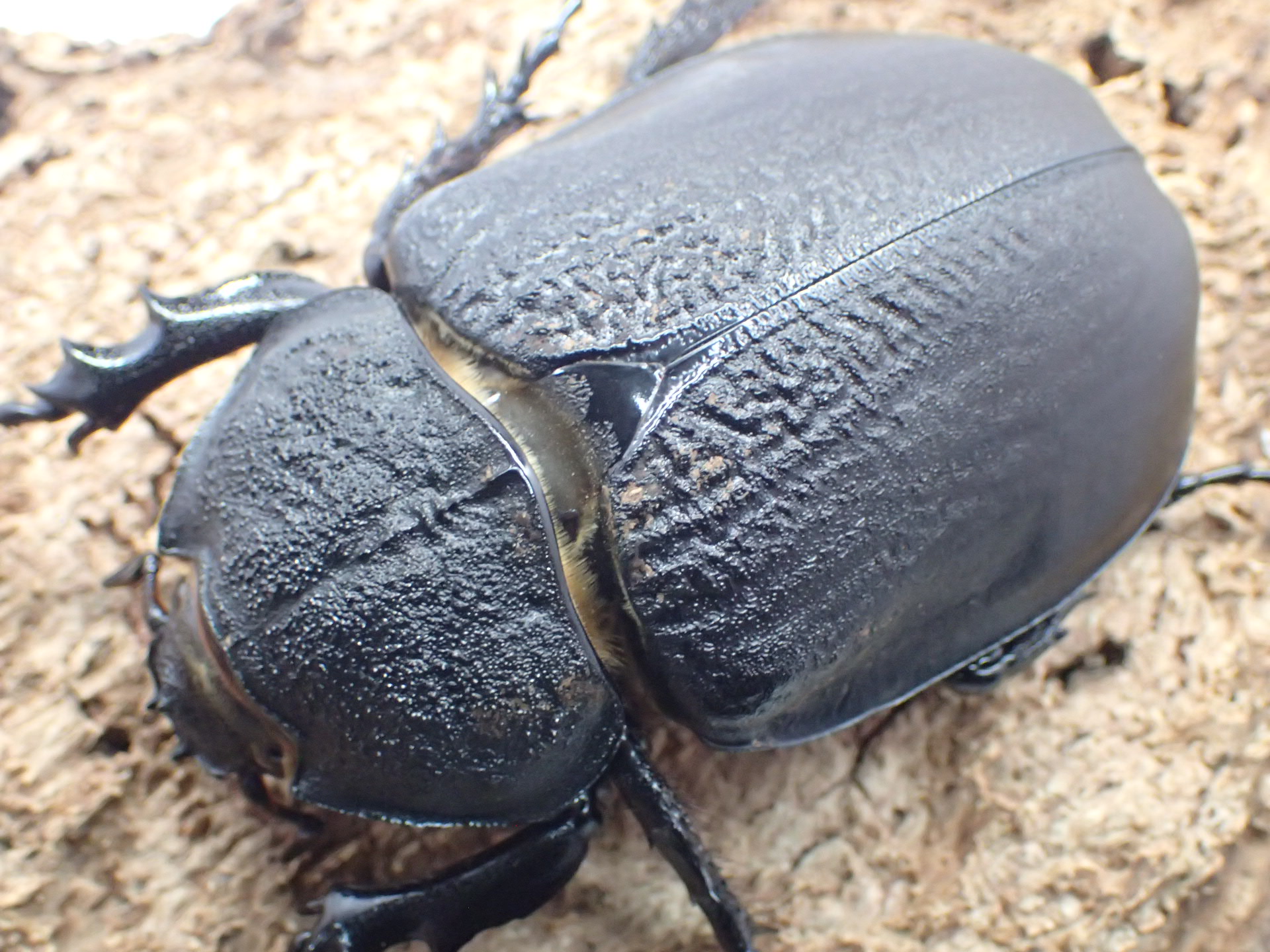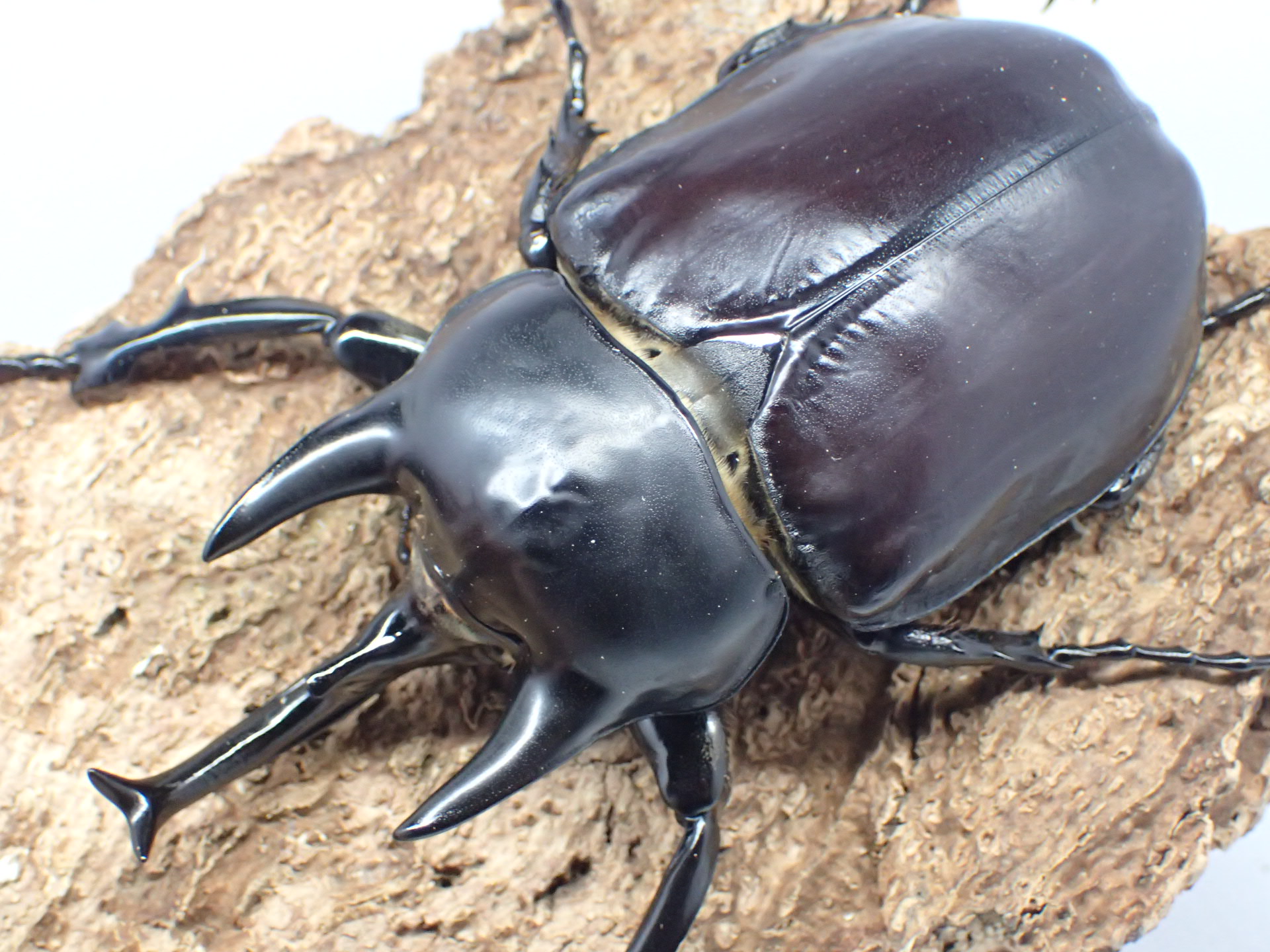 太短い頭角と、発達した胸部前縁胸角、重量感あふれる巨体で、最も力強さを感じさせるゾウカブトです。