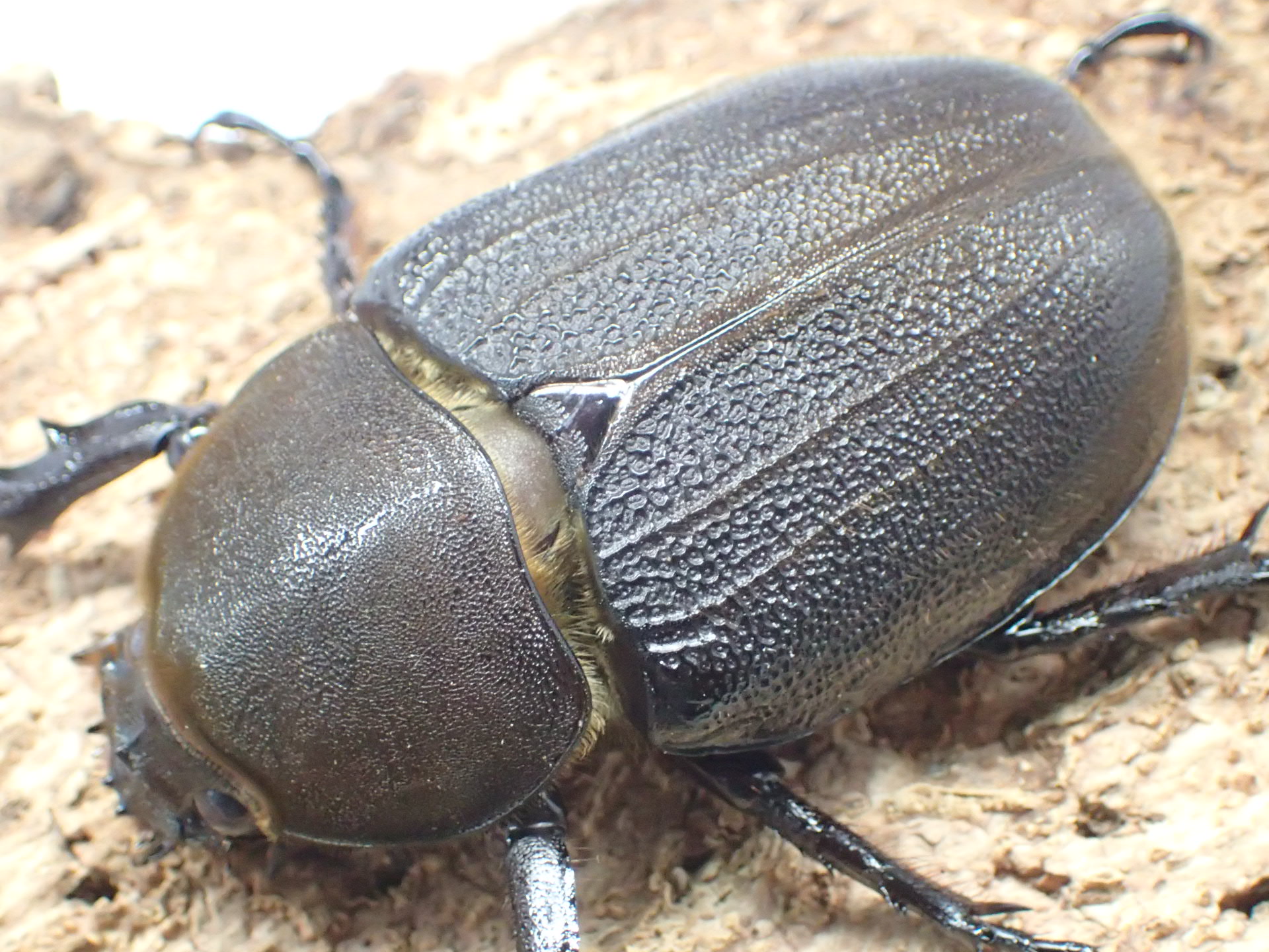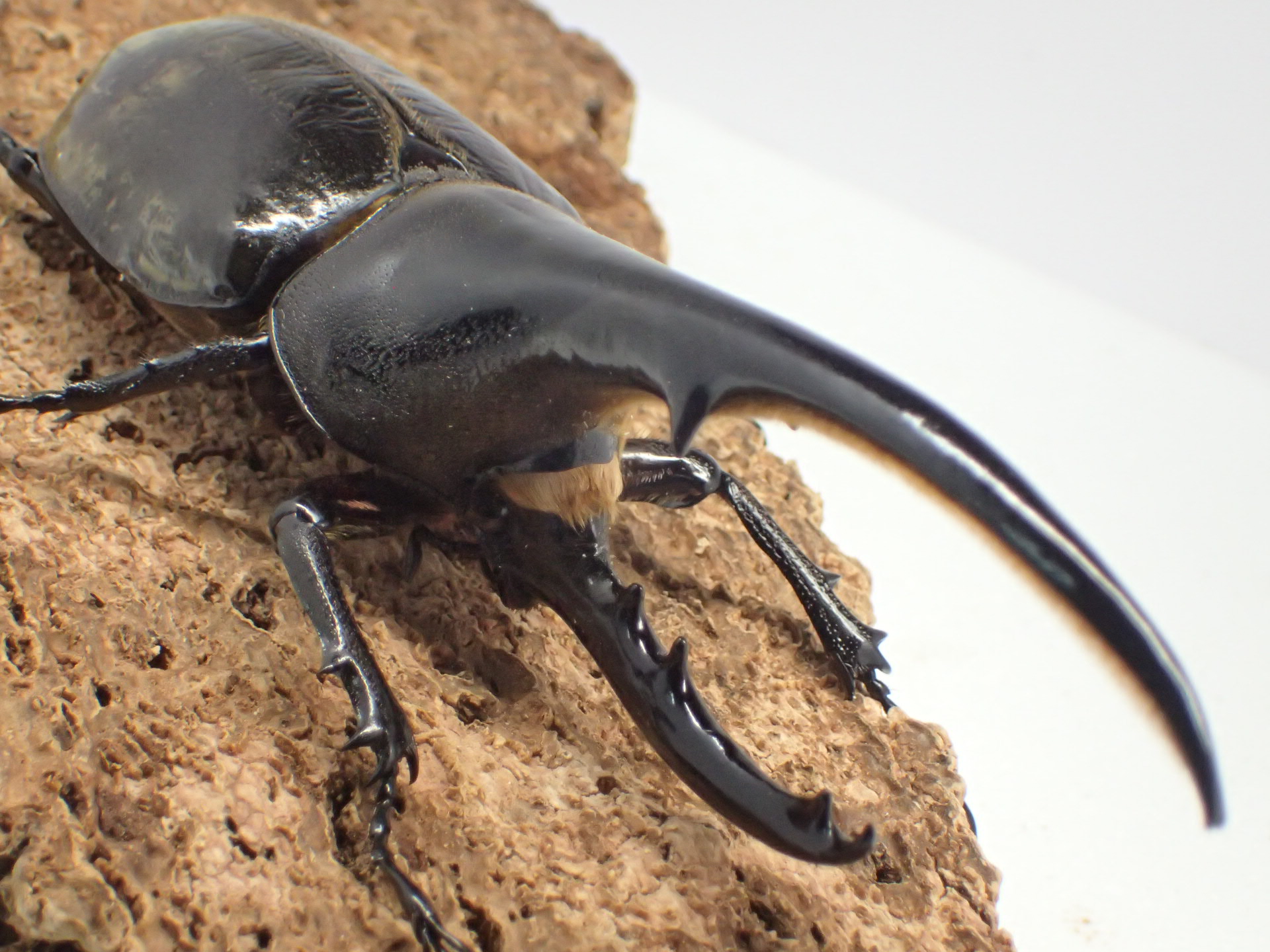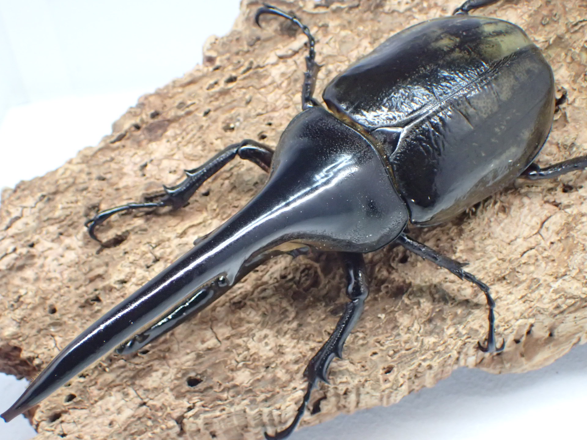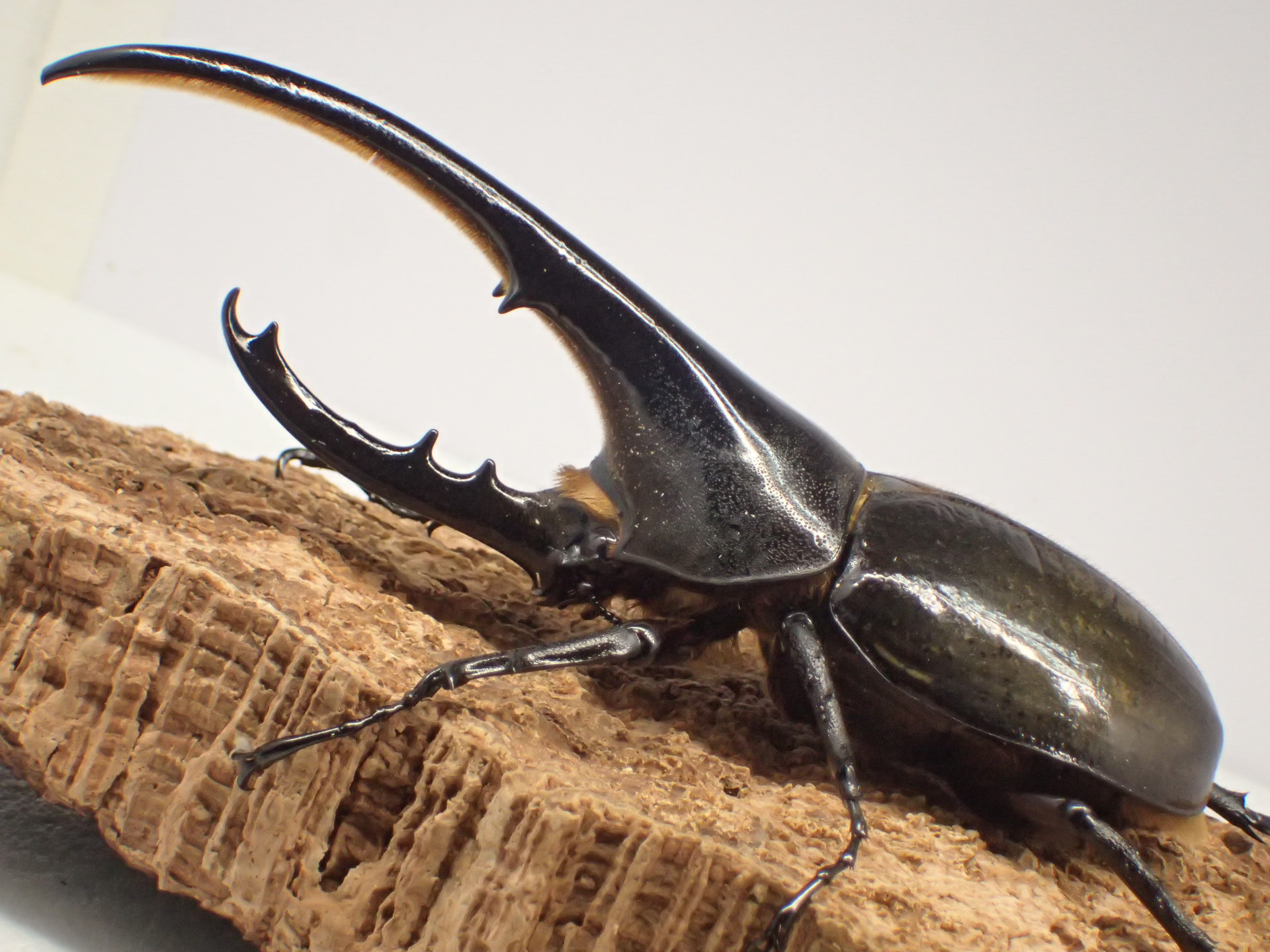 長い頭角と胸角をもち、黄色い上翅の世界最大のカブトムシ。