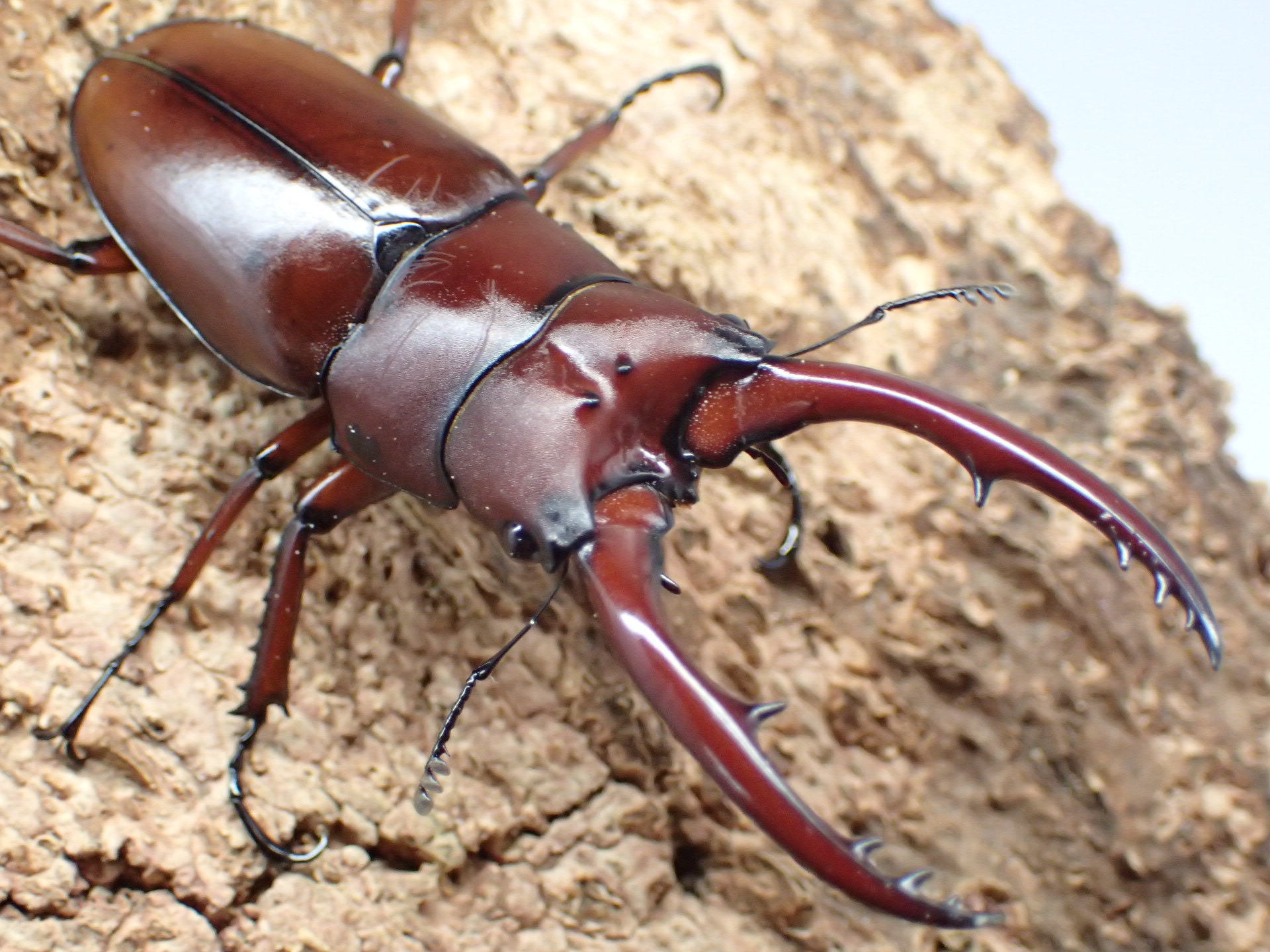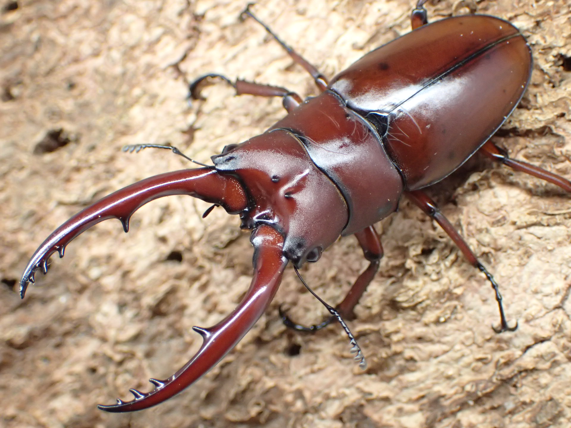 ミャンマー北部(カチン州・チン州)、中国西部(雲南省南部)、ラオス北部、ベトナム北部に分布する亜種fraternusは赤色味がかった褐色で、大アゴは基部で小さく湾曲してほぼ真っすぐ伸びて先端でやや湾曲します。