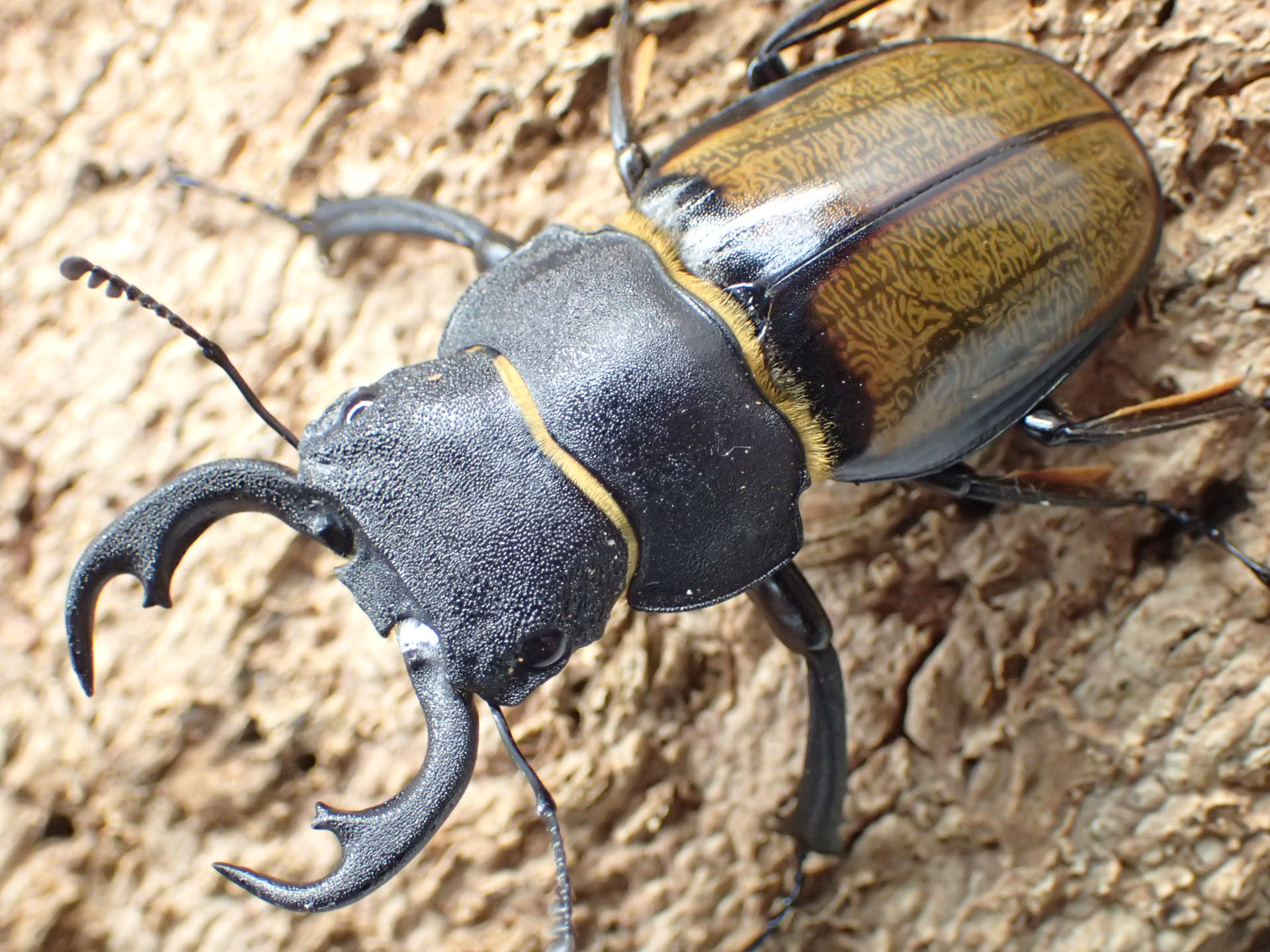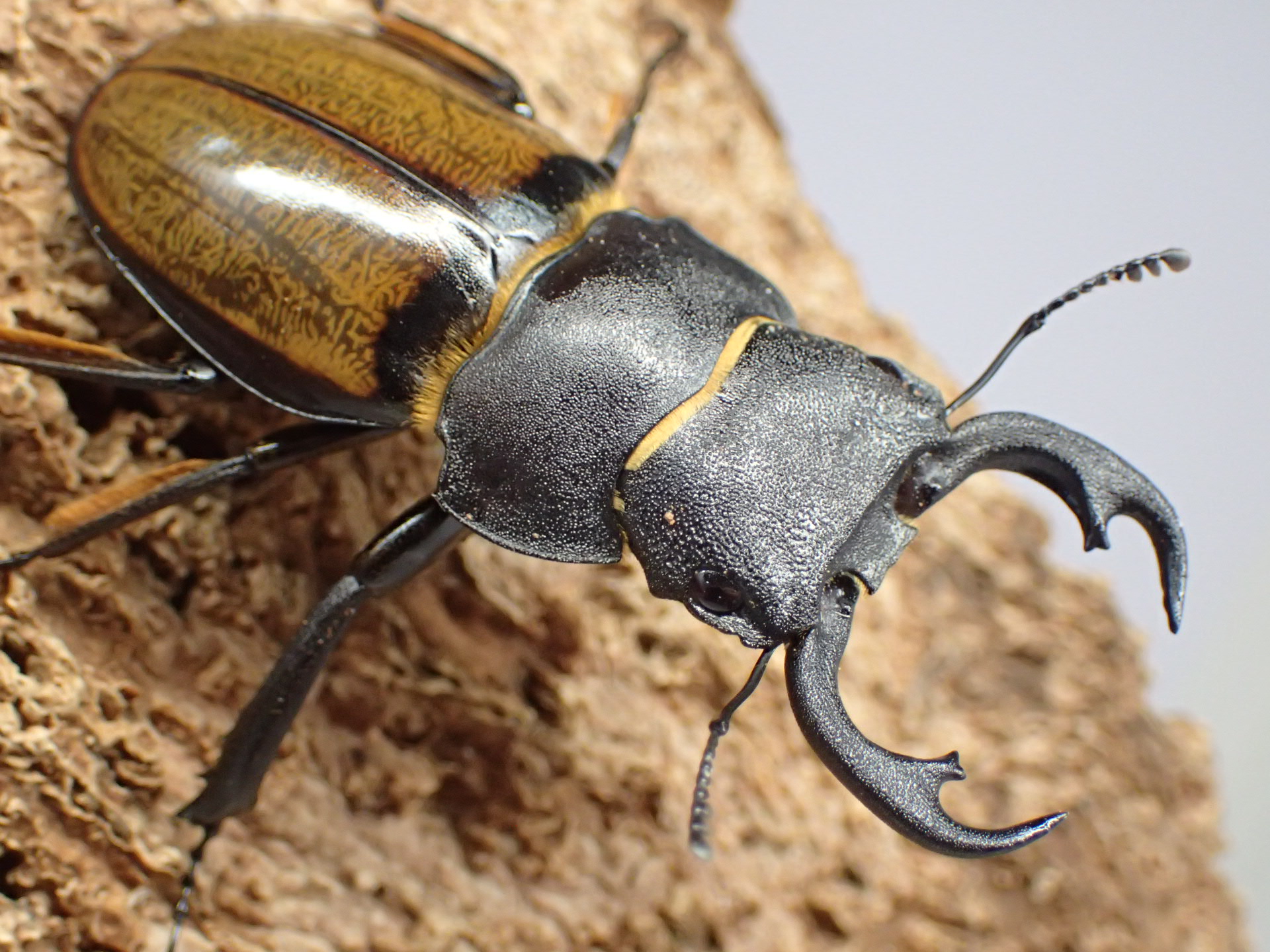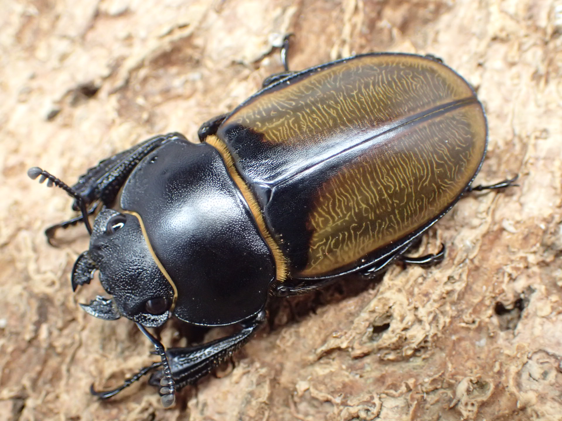 ボルネオ特産の中型種で、オスの大アゴ・頭部・前胸背板・脚はツヤ消し状の黒色で、上翅は黄褐色~褐色で光沢があり、上翅基部前縁部と周縁部は黒く縁どられます。