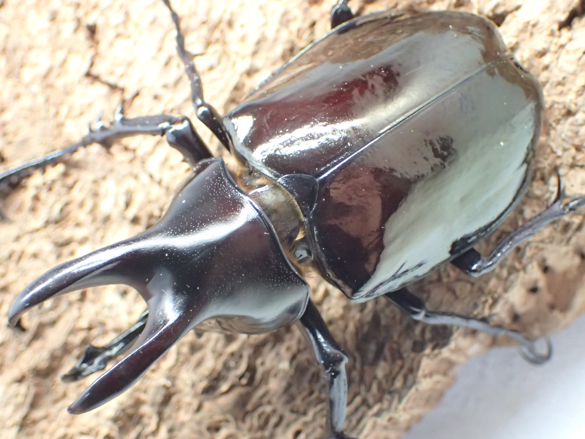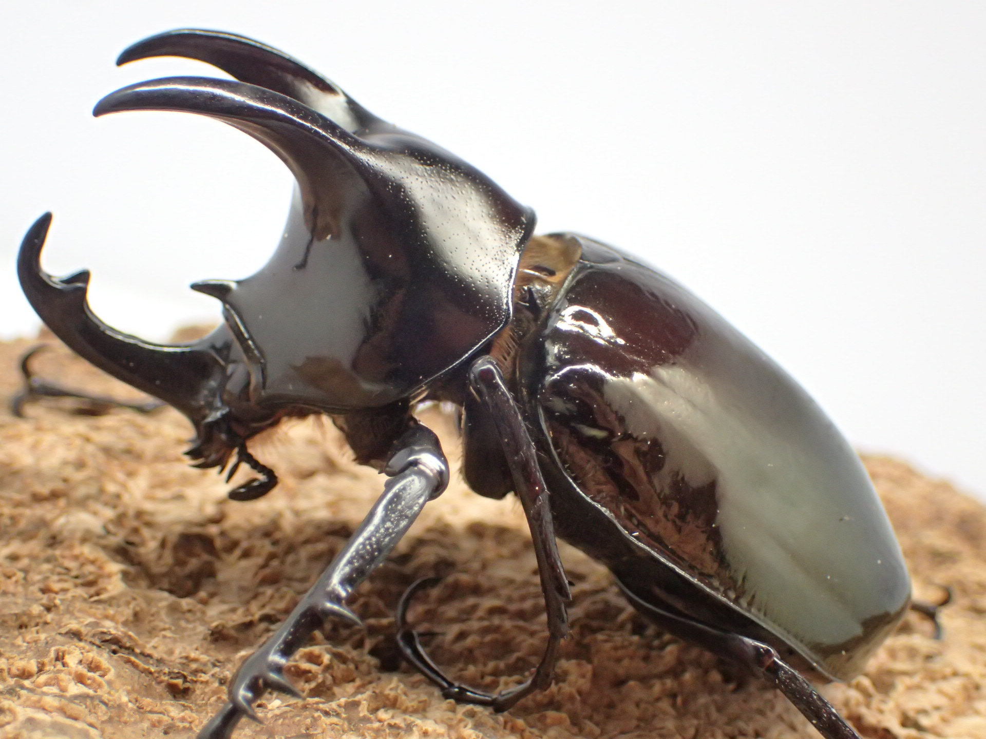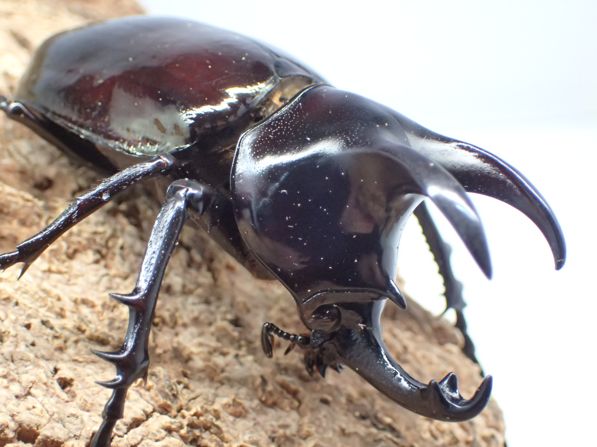 胸角は基部が狭く前方を向き、アトラスオオカブトやコーカサスオオカブトに比べ明らかに短く、全体に太くなります。