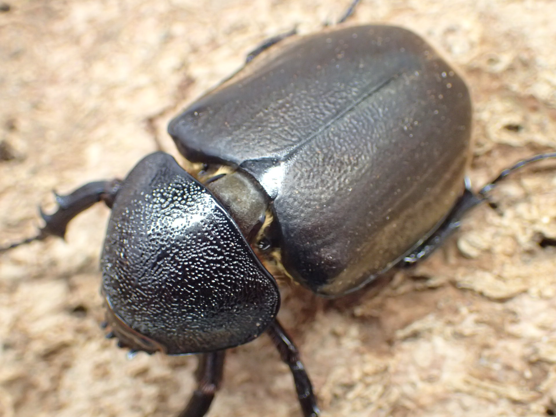 頭角は細長くて比較的に湾曲が弱く、中央より根本寄りに小さな突起があり、前胸前縁中央の突起は発達が悪く小さくなります。