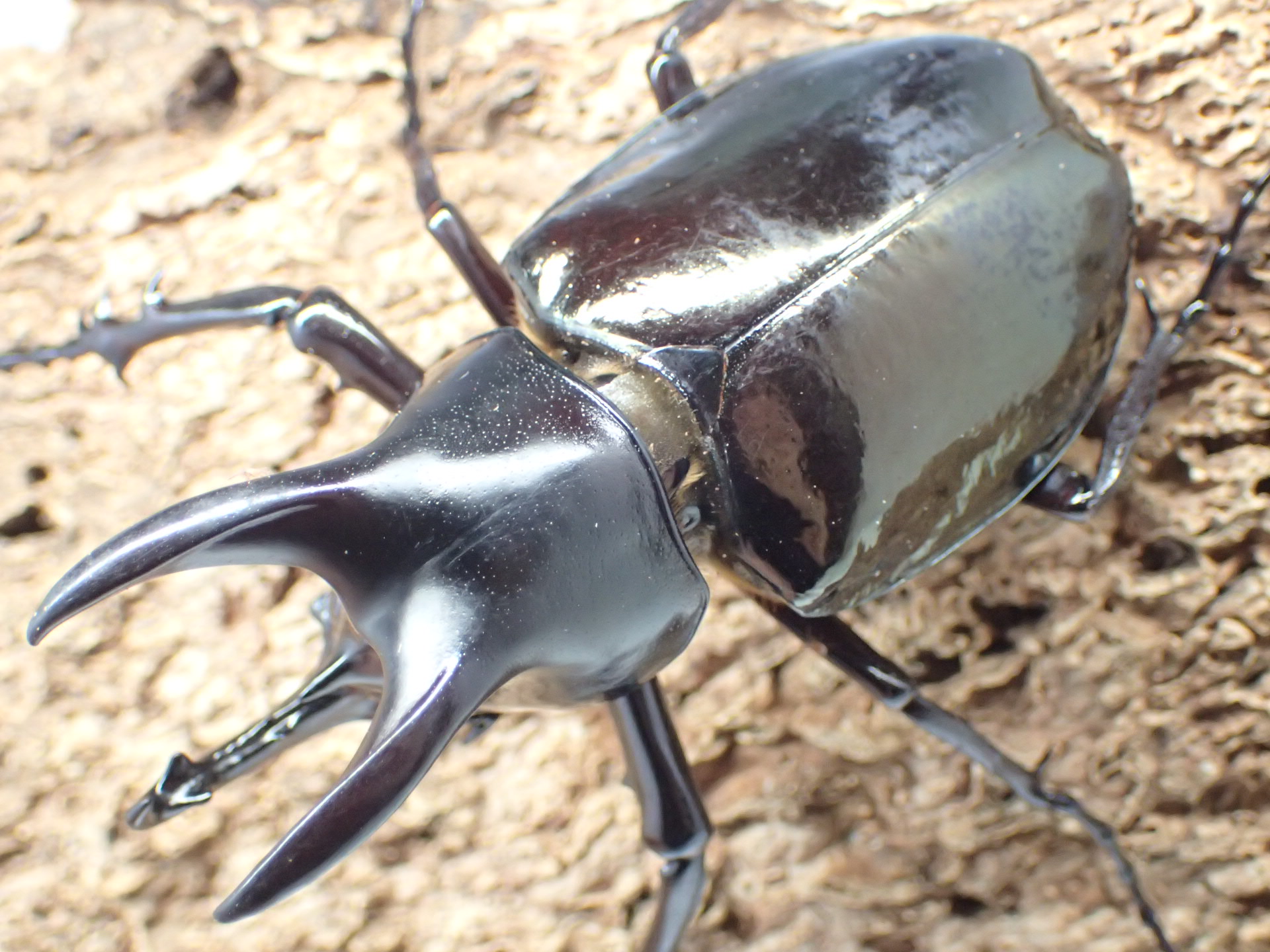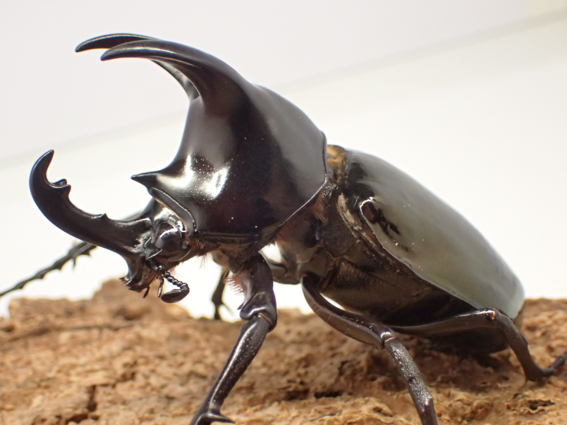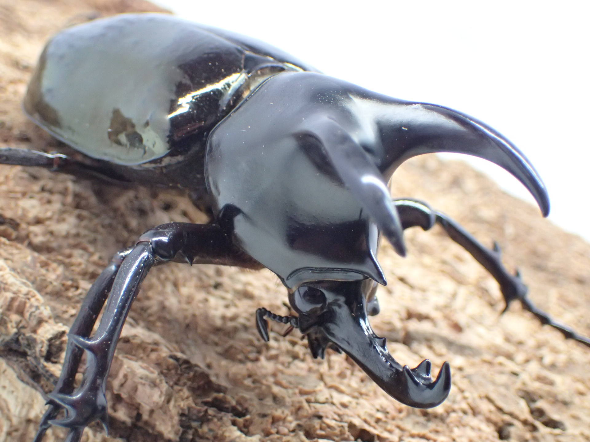 胸角は基部が狭く前方を向き、アトラスオオカブトやコーカサスオオカブトに比べ明らかに短く、全体に太くなります。