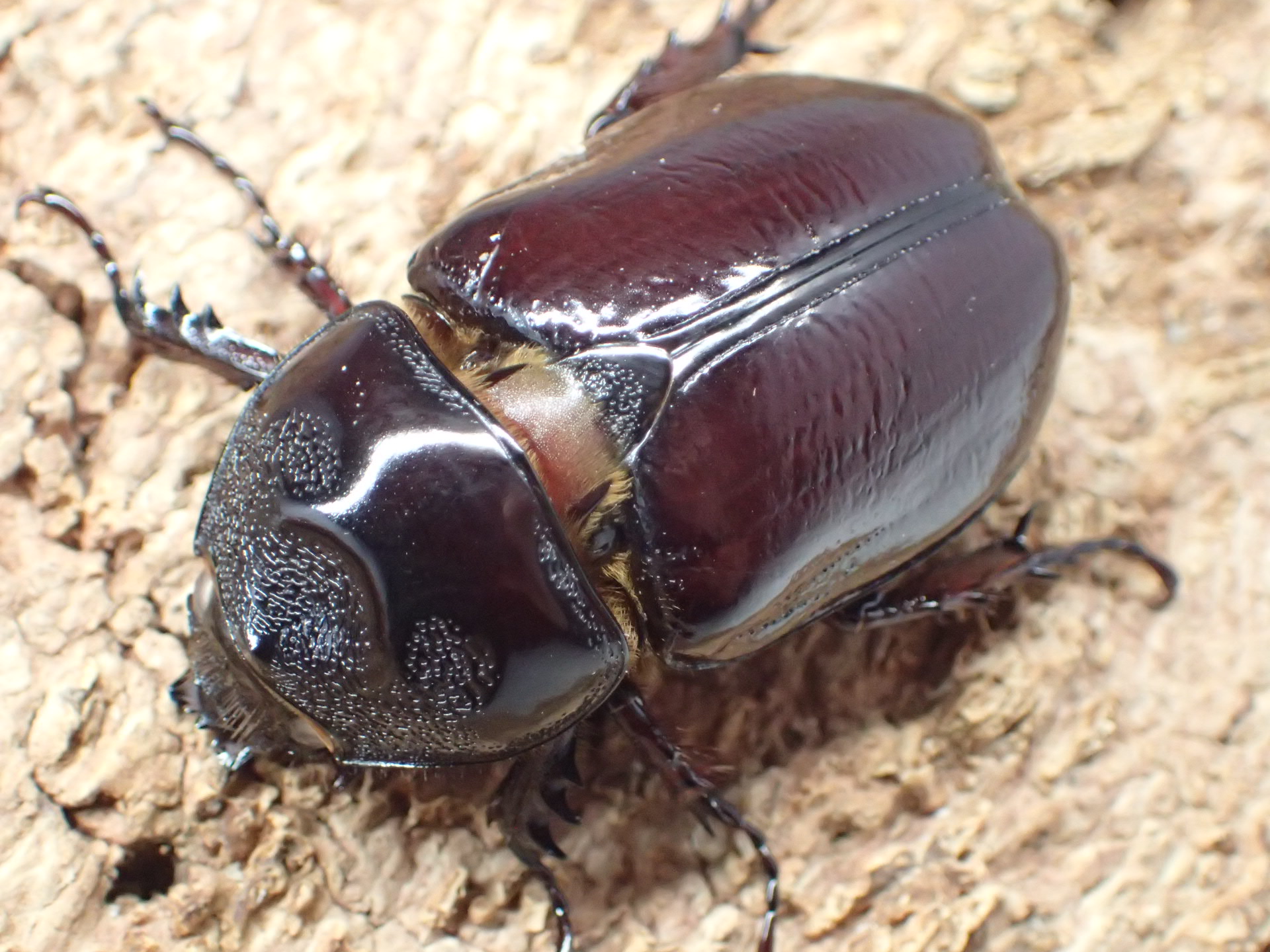 オスに頭角がなく、前胸の前方中央に一見、頭角のように見える胸角が1本、左右側方に1対の胸角があり、「ミツノ」状になる光沢の強いカブトムシです。