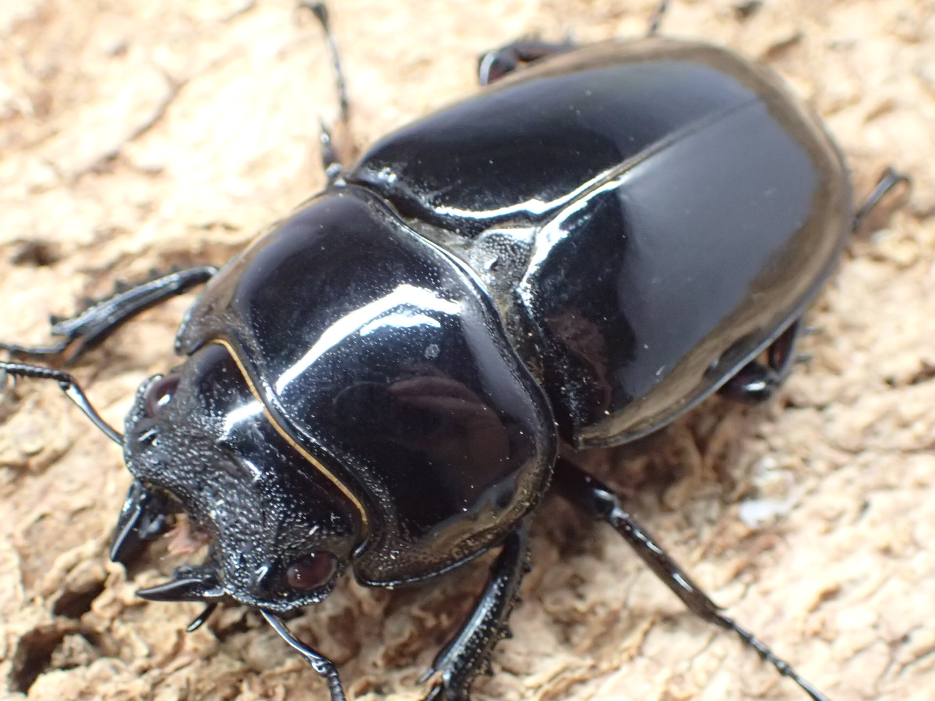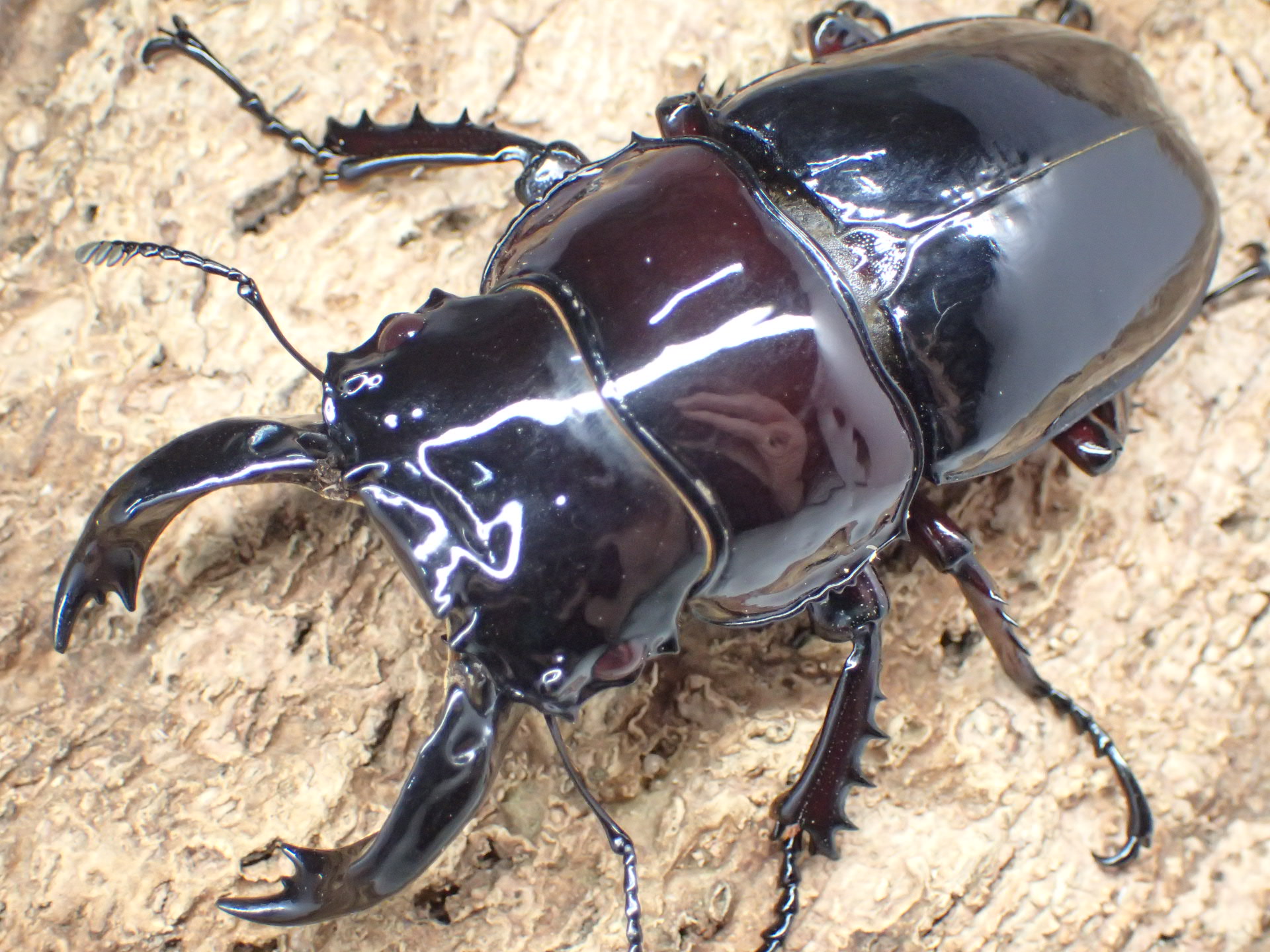 全身漆黒色でエナメルのような強い光沢をもち、タランドゥスオオツヤクワガタと並んでアフリカ最大級のクワガタです。