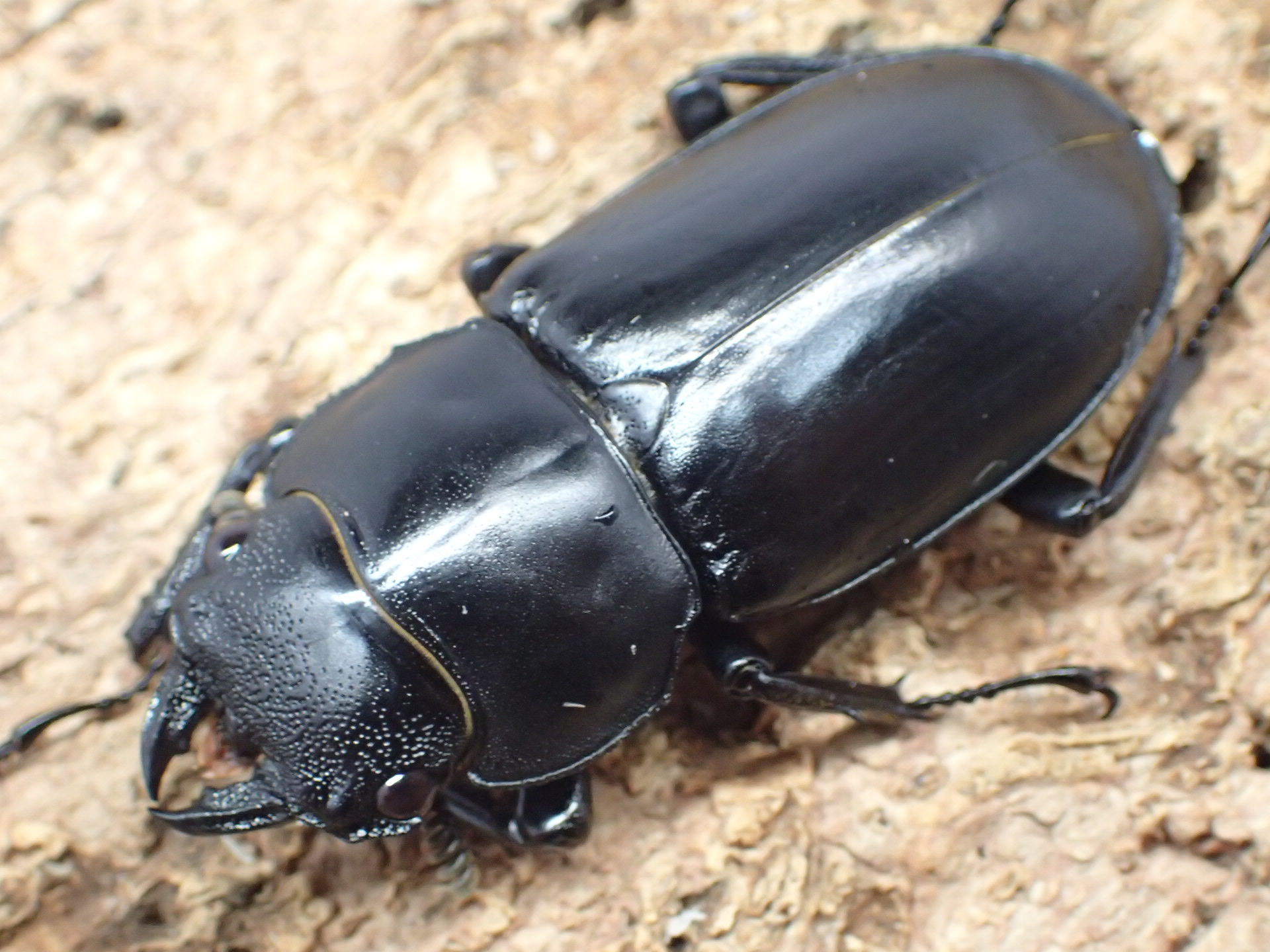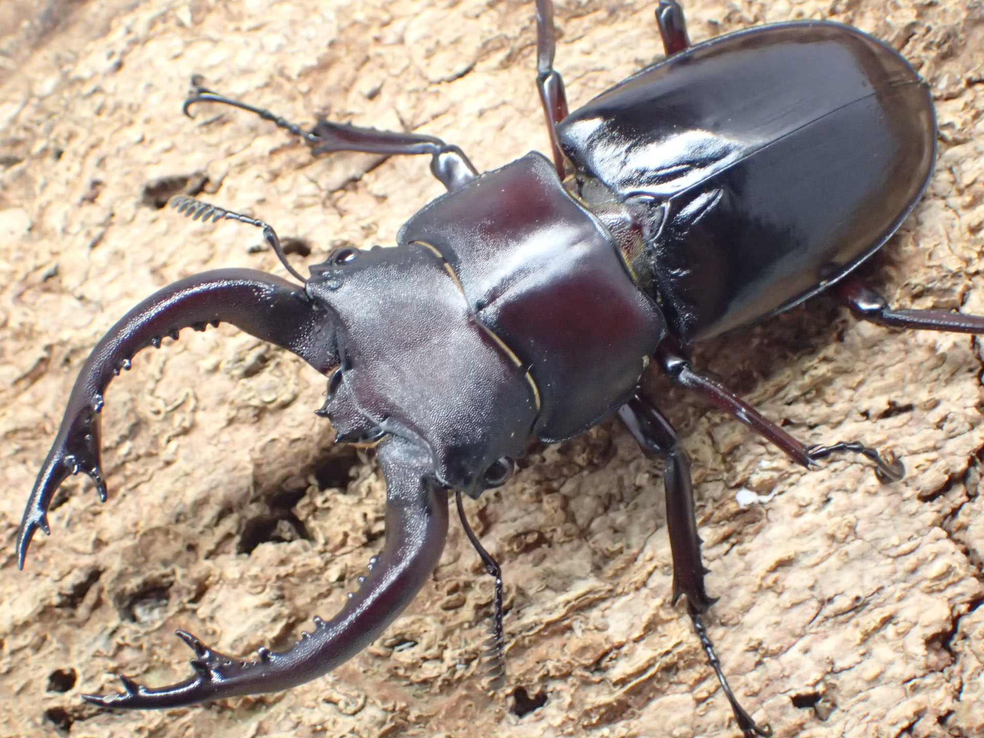 赤褐色~黒褐色で光沢があり、大アゴは立体的で、基部付近にはシカクワガタのように上下に大きく鋭い突起があります。
