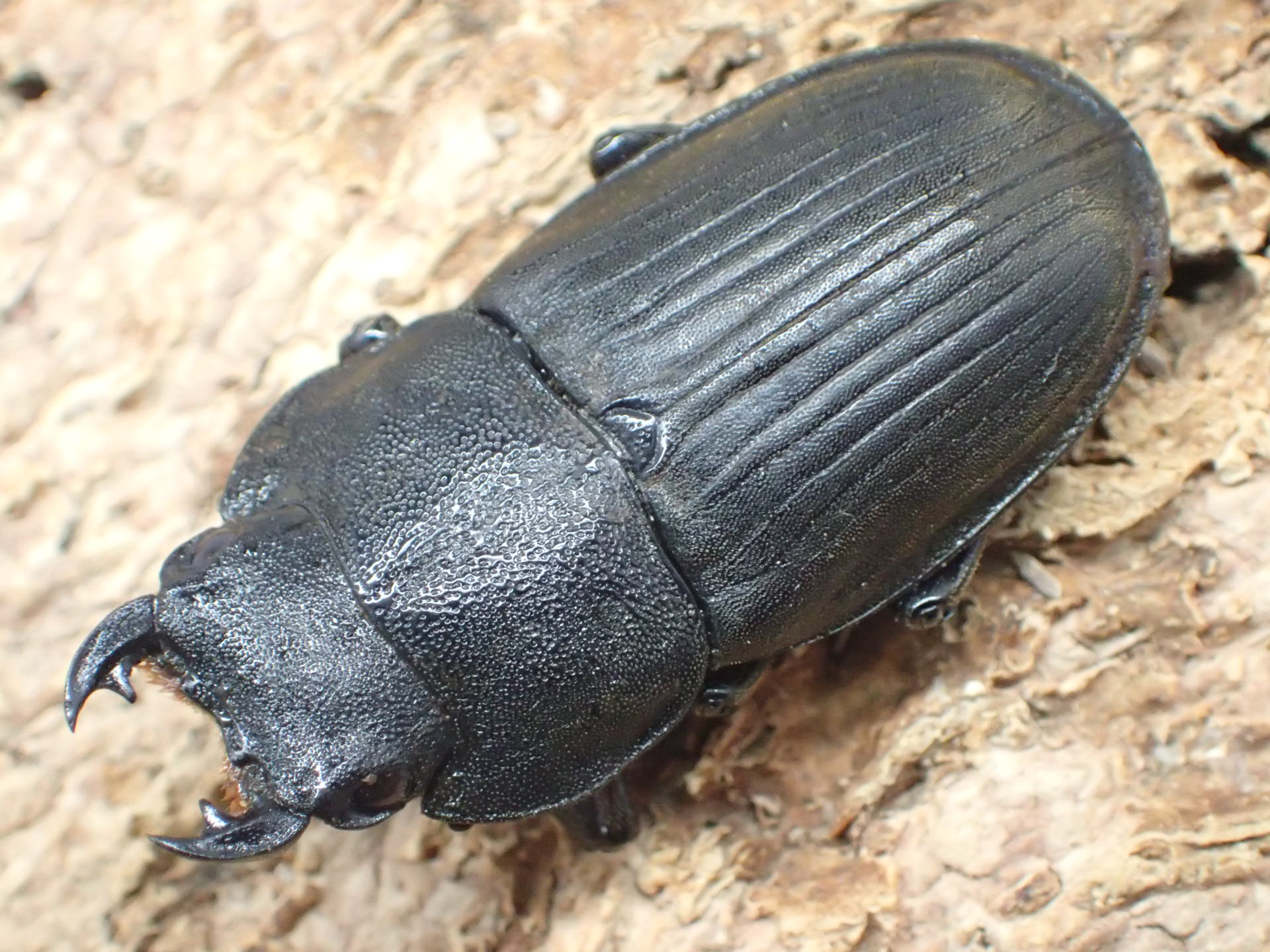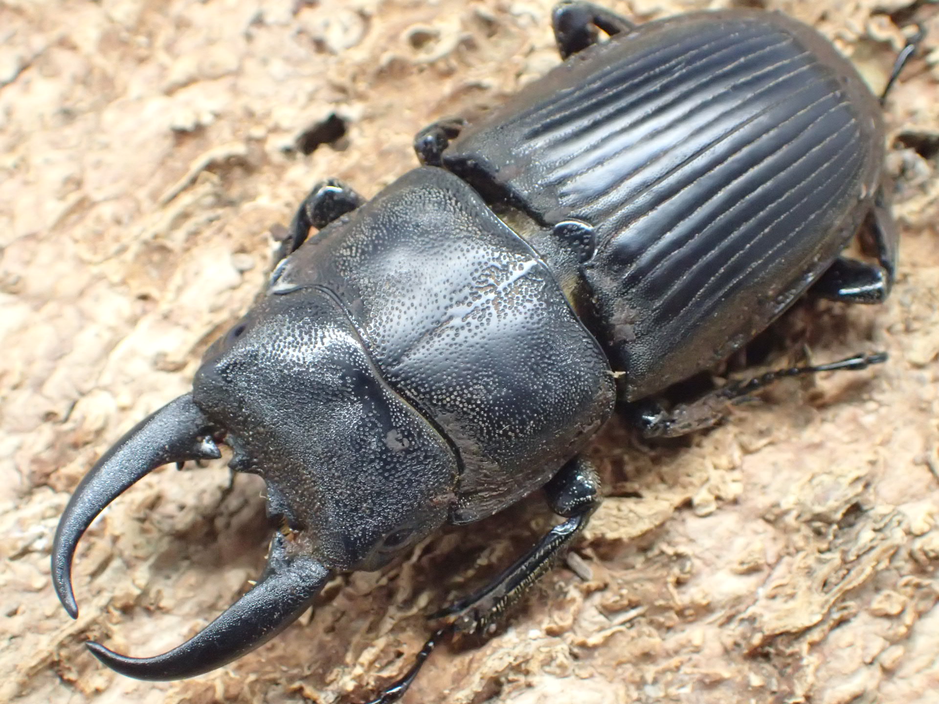 オスの大アゴ・頭部・前胸背板は粒面状で体表面はざらつき、頭楯は離れて尖った二山状で両端はやや斜め側方を向き、外側にも小さなコブ状突起があります。