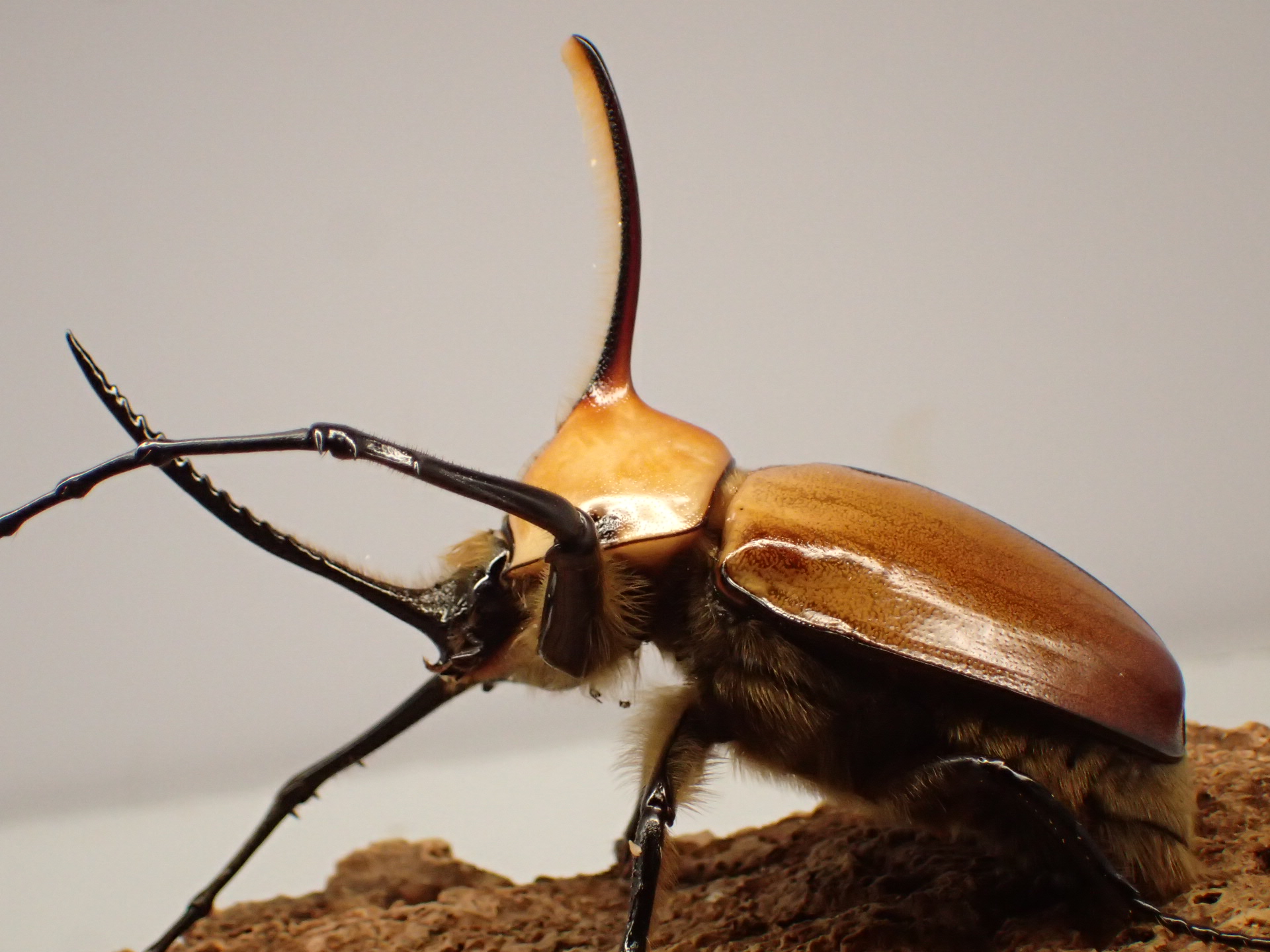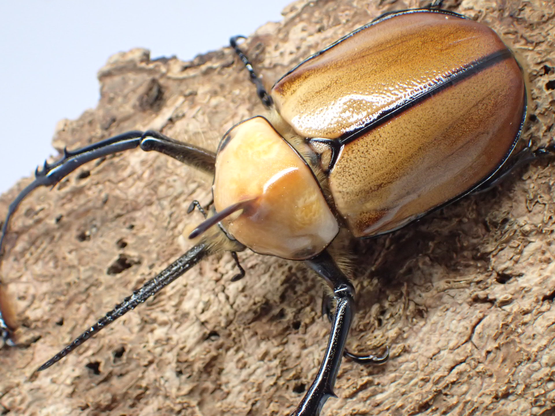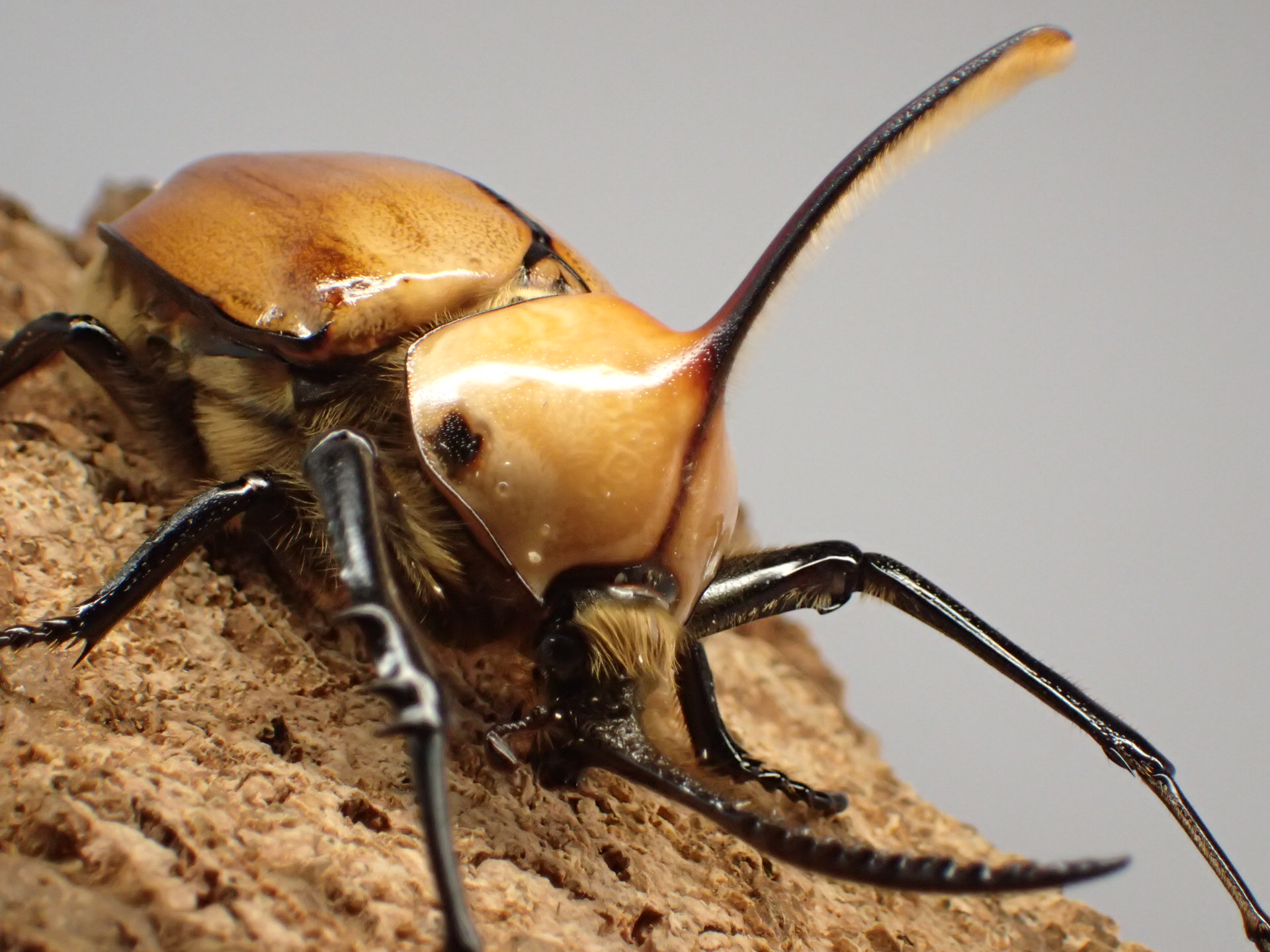タテヅノカブト(ゴロファ)属の最大種で、前脚が極端に長く、頭角の内側に鋸歯状の細かい突起列が2列あり、「ノコギリタテヅノカブト」の和名を持ちます。