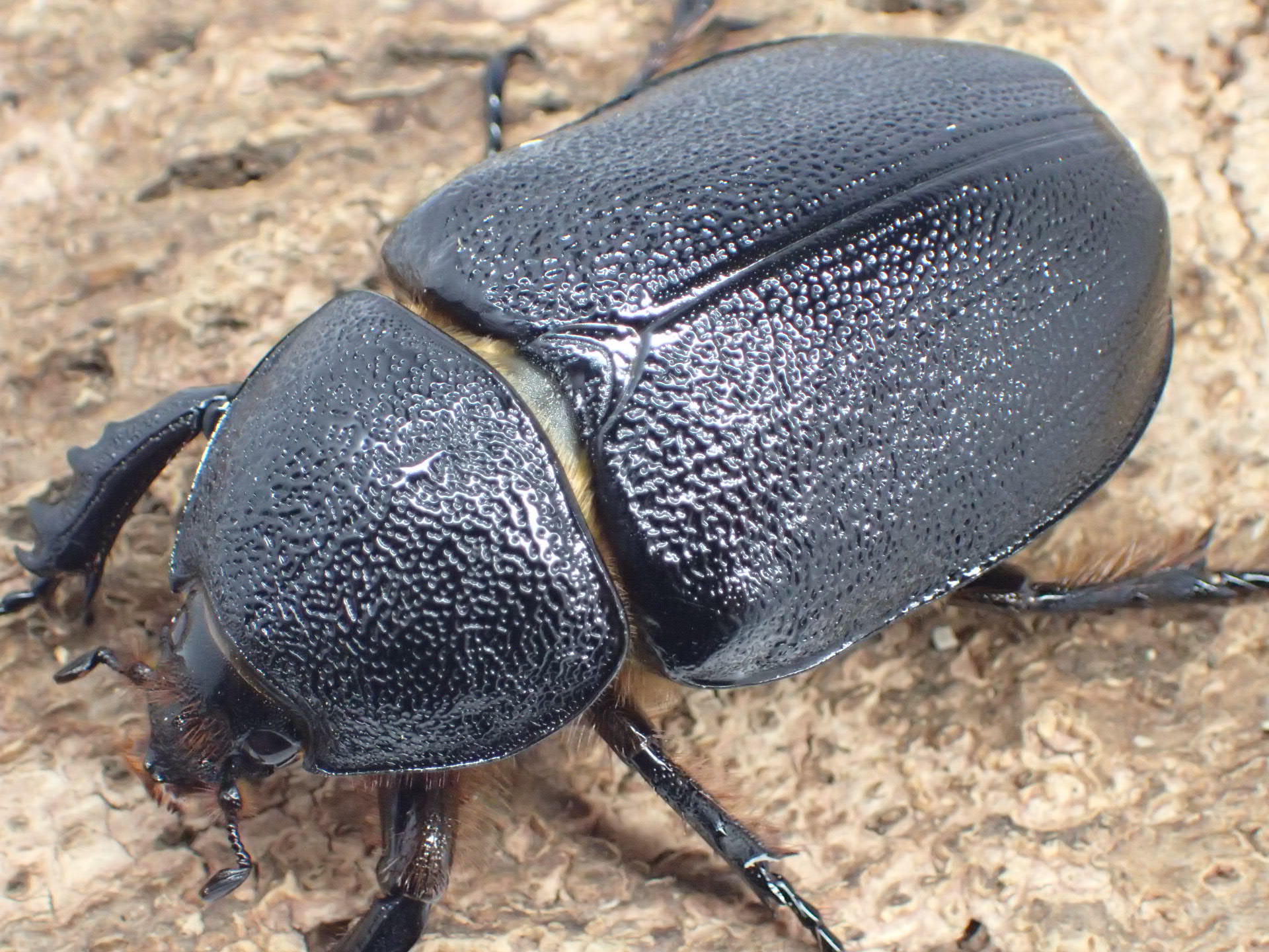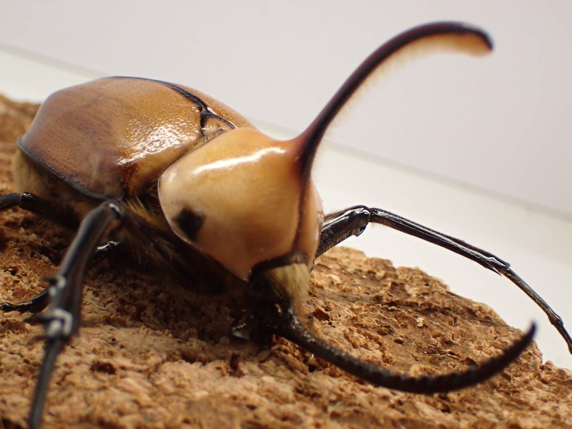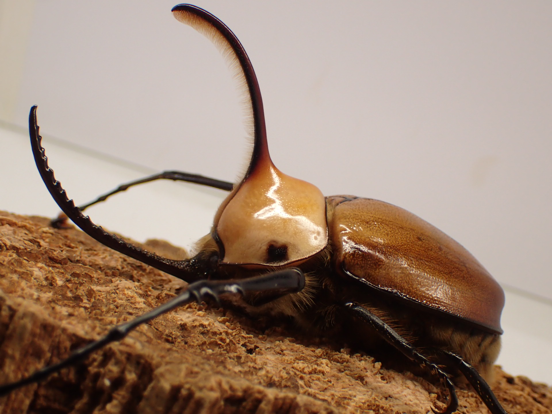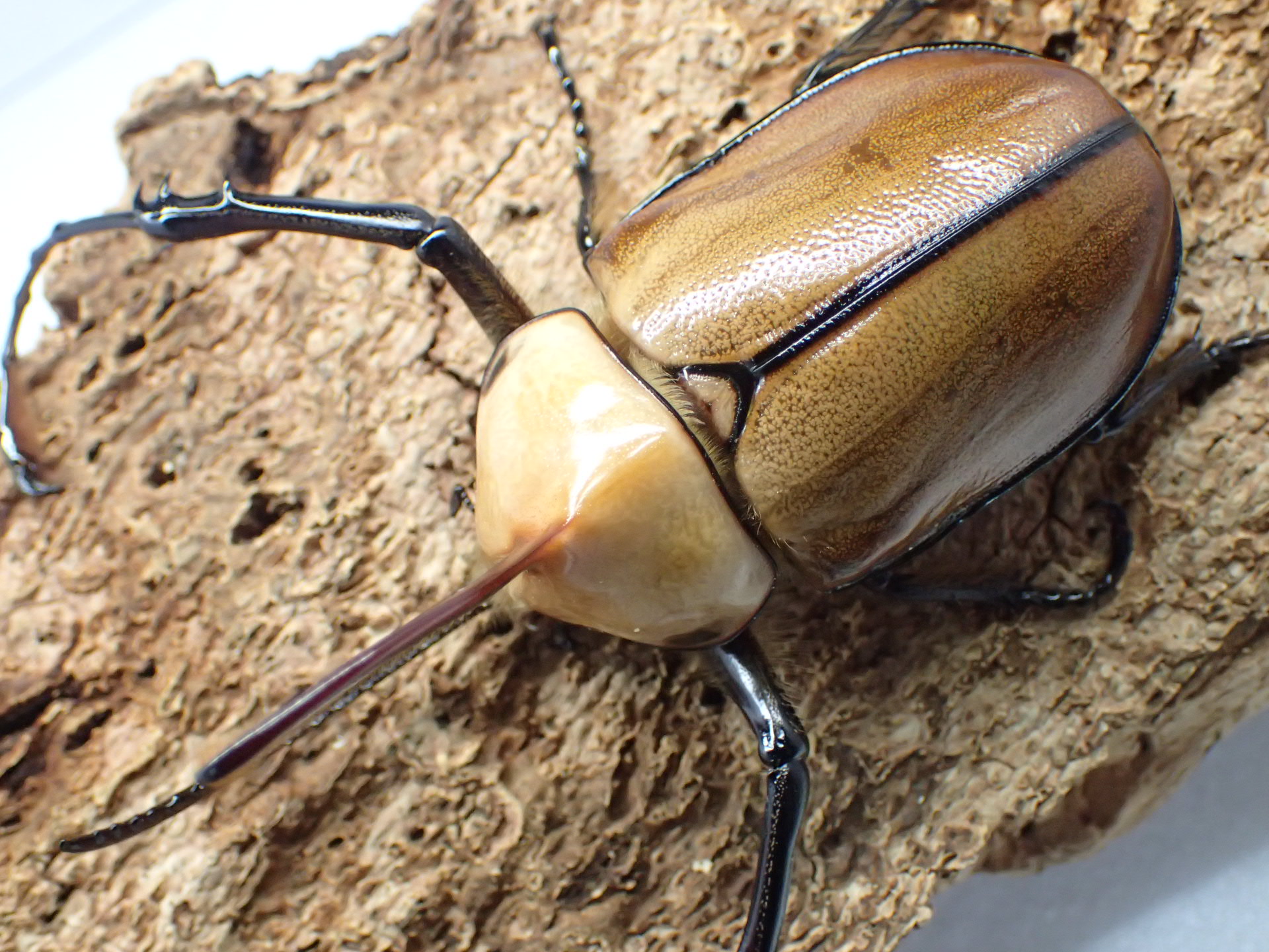 タテヅノカブト(ゴロファ)属の最大種で、前脚が極端に長く、頭角の内側に鋸歯状の細かい突起列が2列あり、「ノコギリタテヅノカブト」の和名を持ちます。