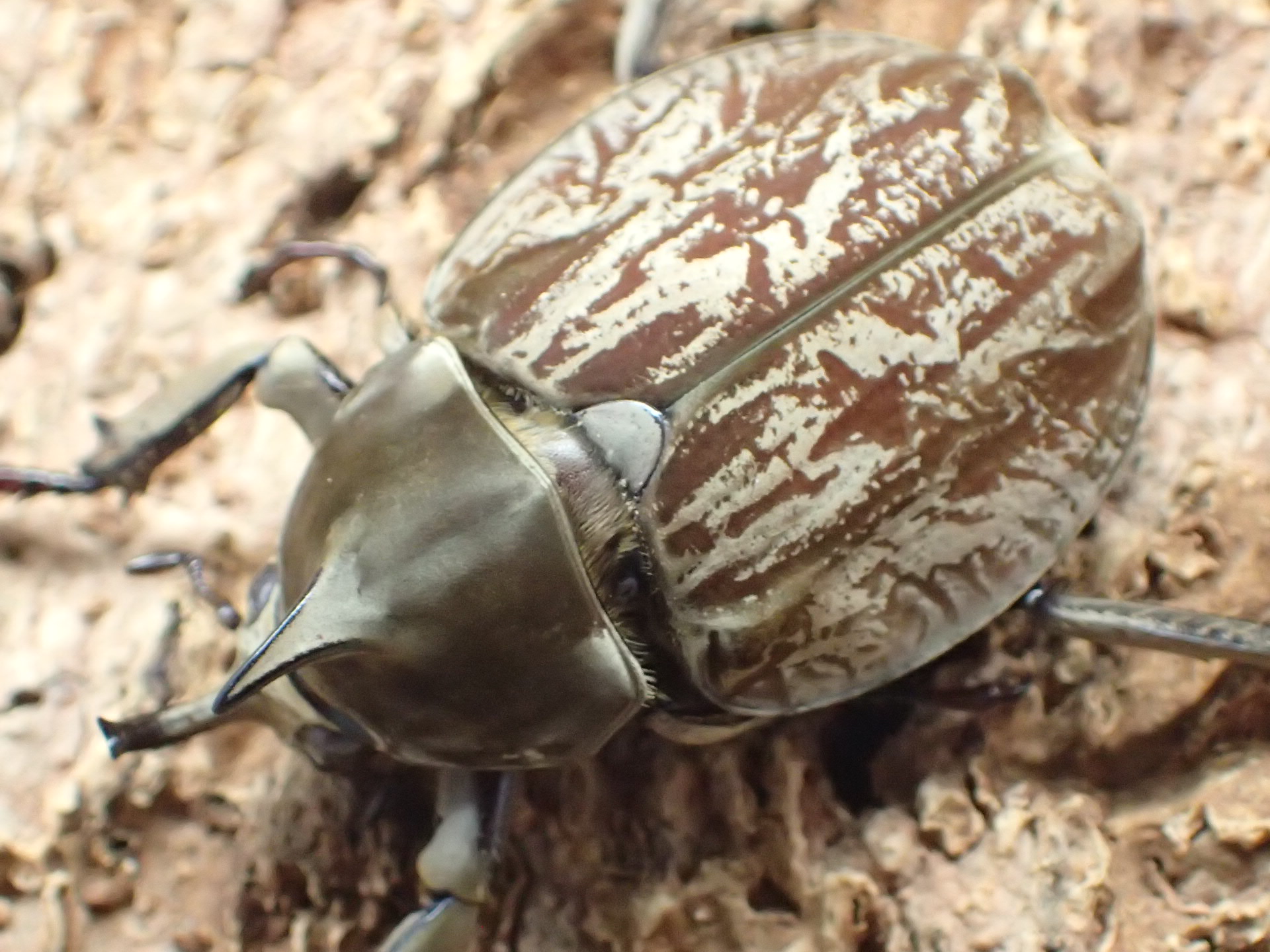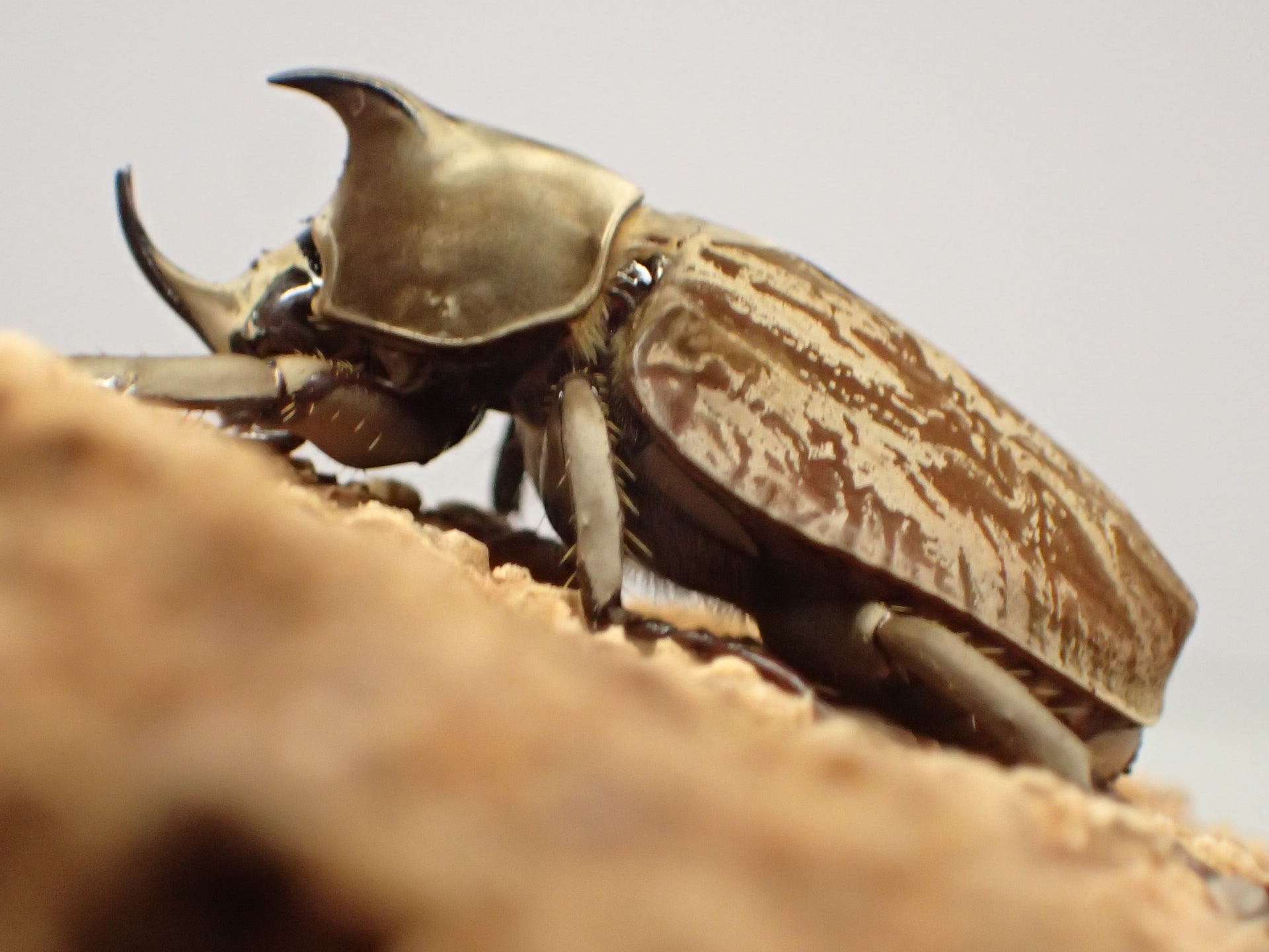 長い胸角と頭角がヘラクレスオオカブトを小型化したようなフォルムで、金色に輝くビロード状の美しい姿も相まって、非常に人気が高いヒナカブトです。