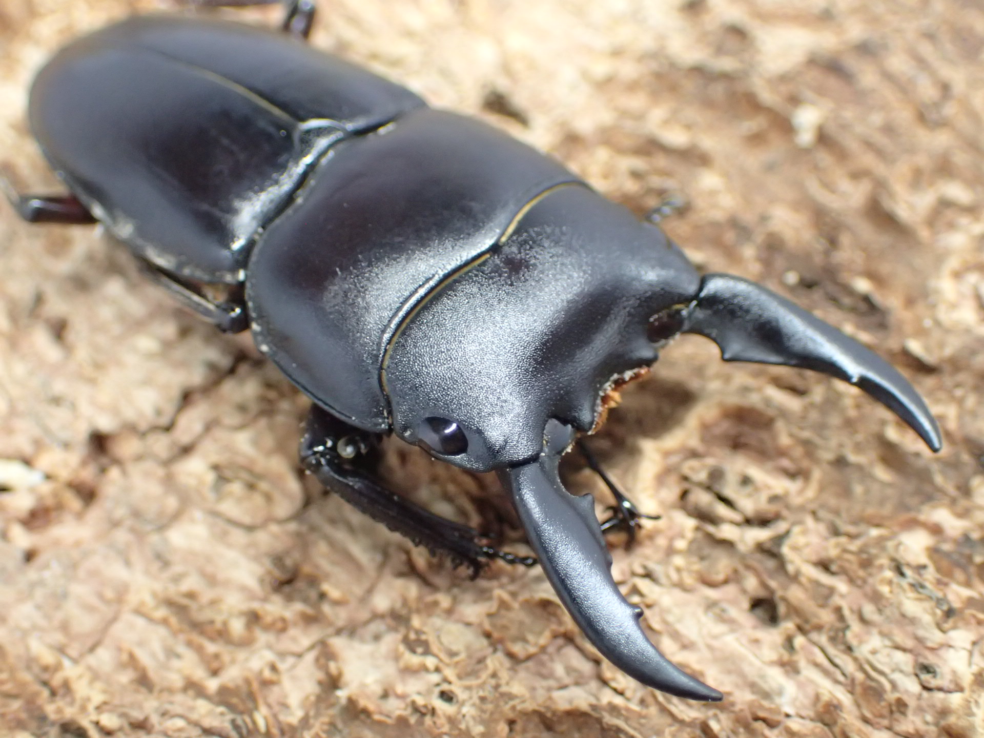 オスの体は幅広く、黒褐色でやや光沢があり、大アゴは前方にほぼ真っすぐ伸び、先端部でやや湾曲し、平らでナイフ状になります。