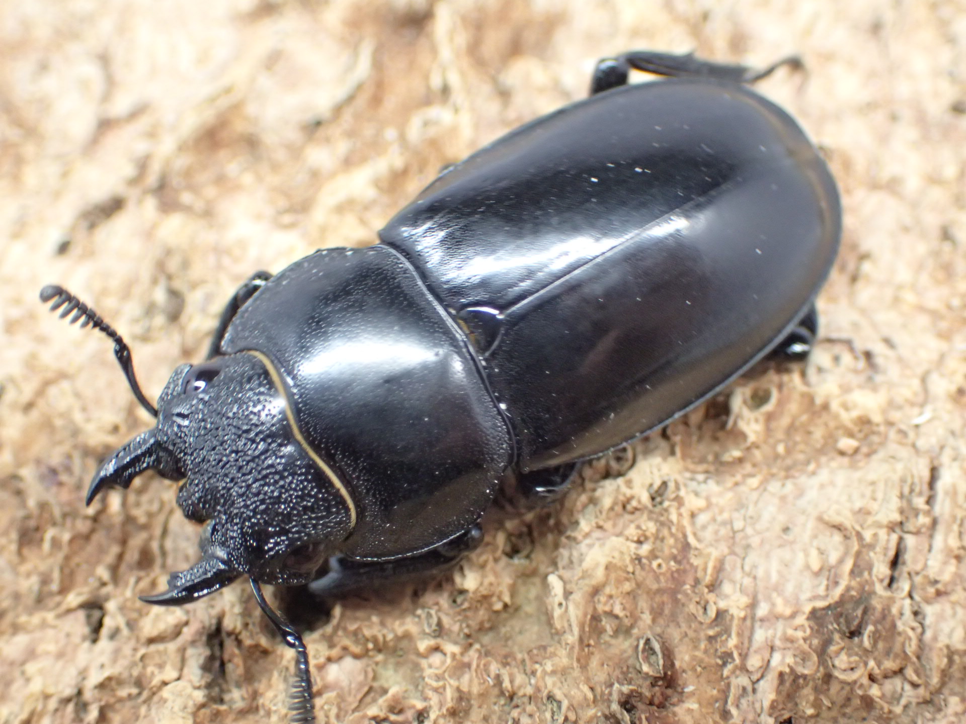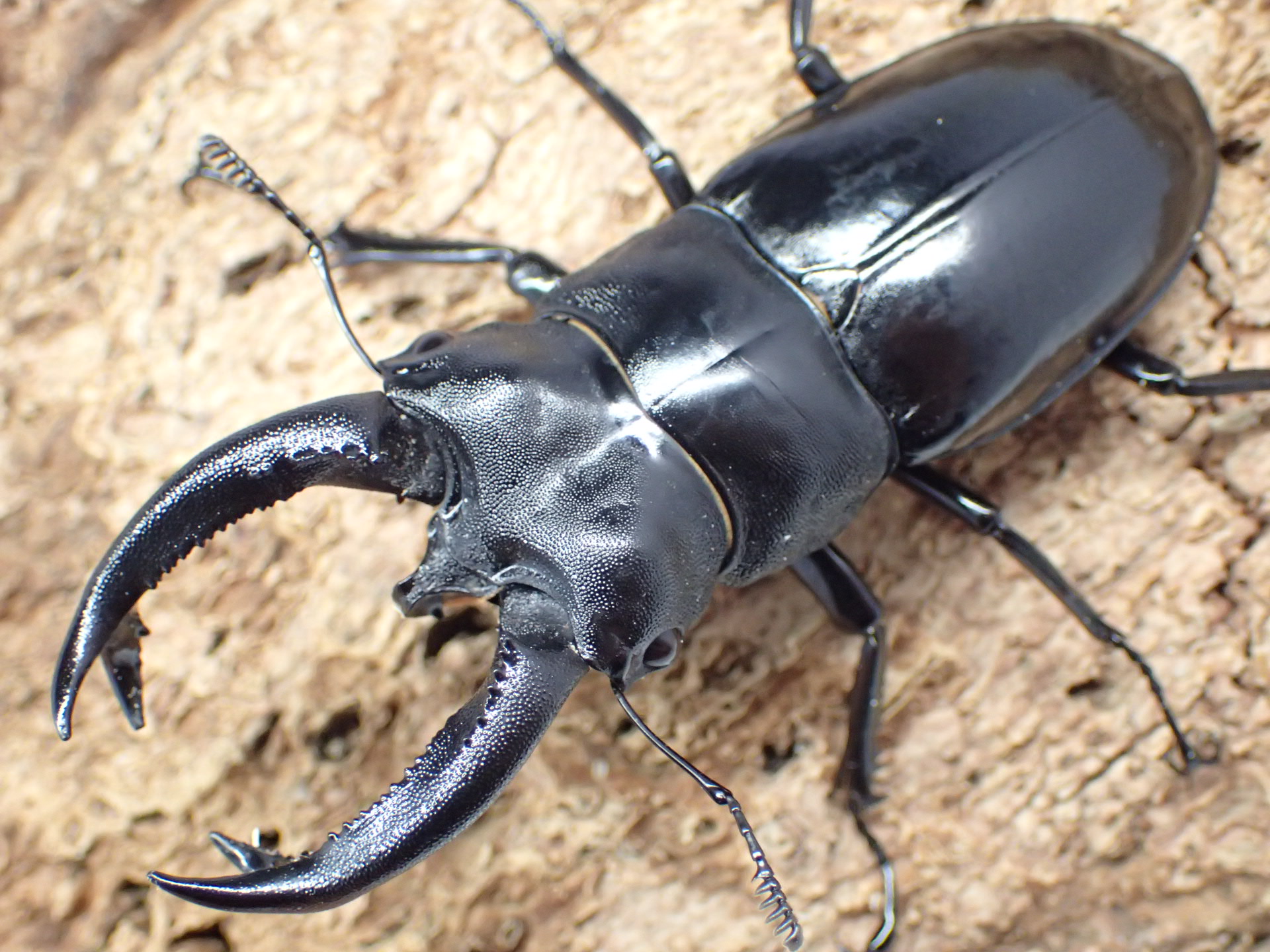 雌雄ともに光沢のある黒色で、大アゴは弓状に湾曲して前方へ伸びて、先端で大きく上下に二又に分かれて下方の突起はより内側を向きます。