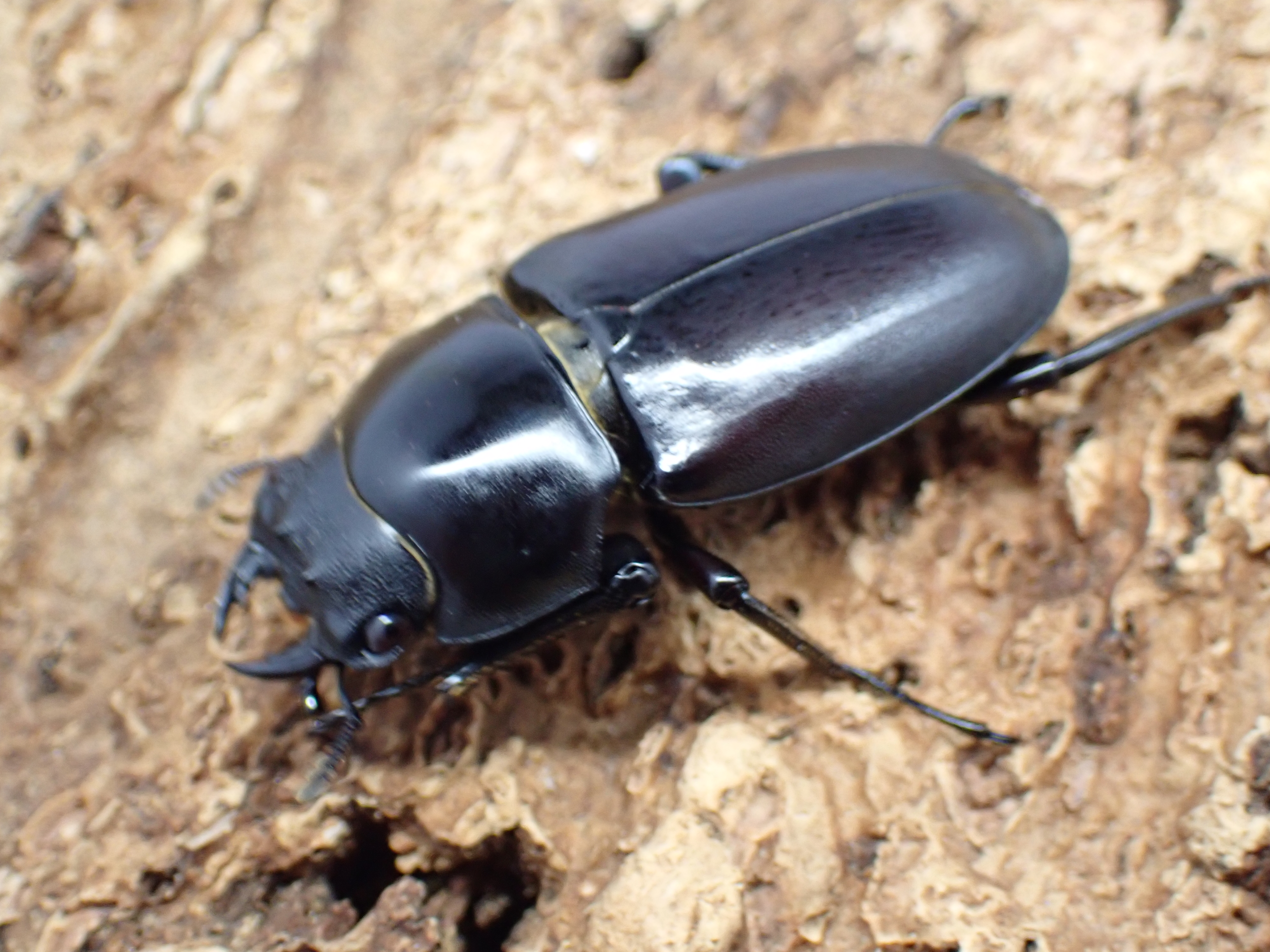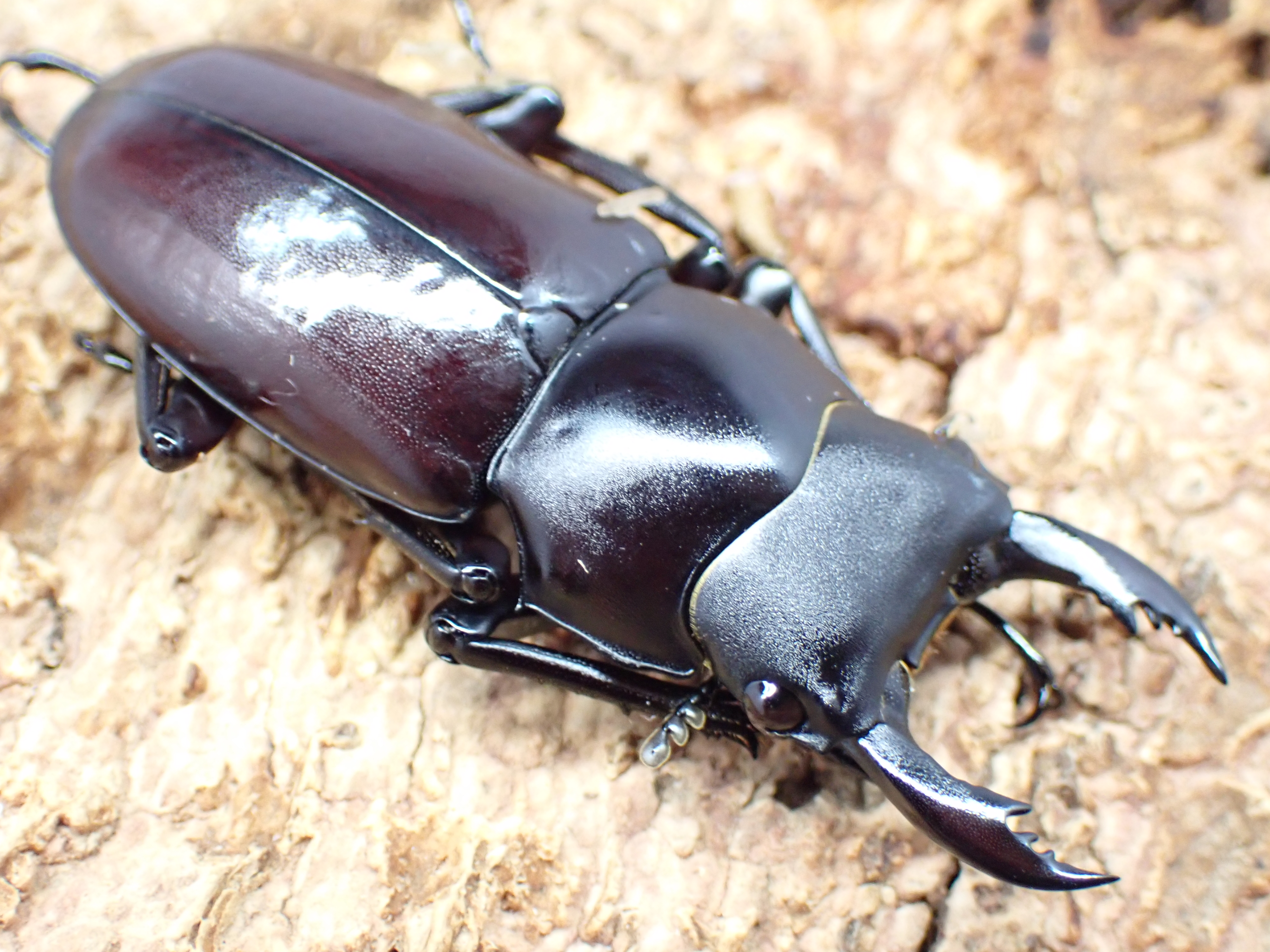 雌雄ともに大アゴ・頭部・前胸背板・脚は黒色で、上翅は暗褐色で頭部はツヤ消し状、前胸背板と上翅はやや光沢があります。