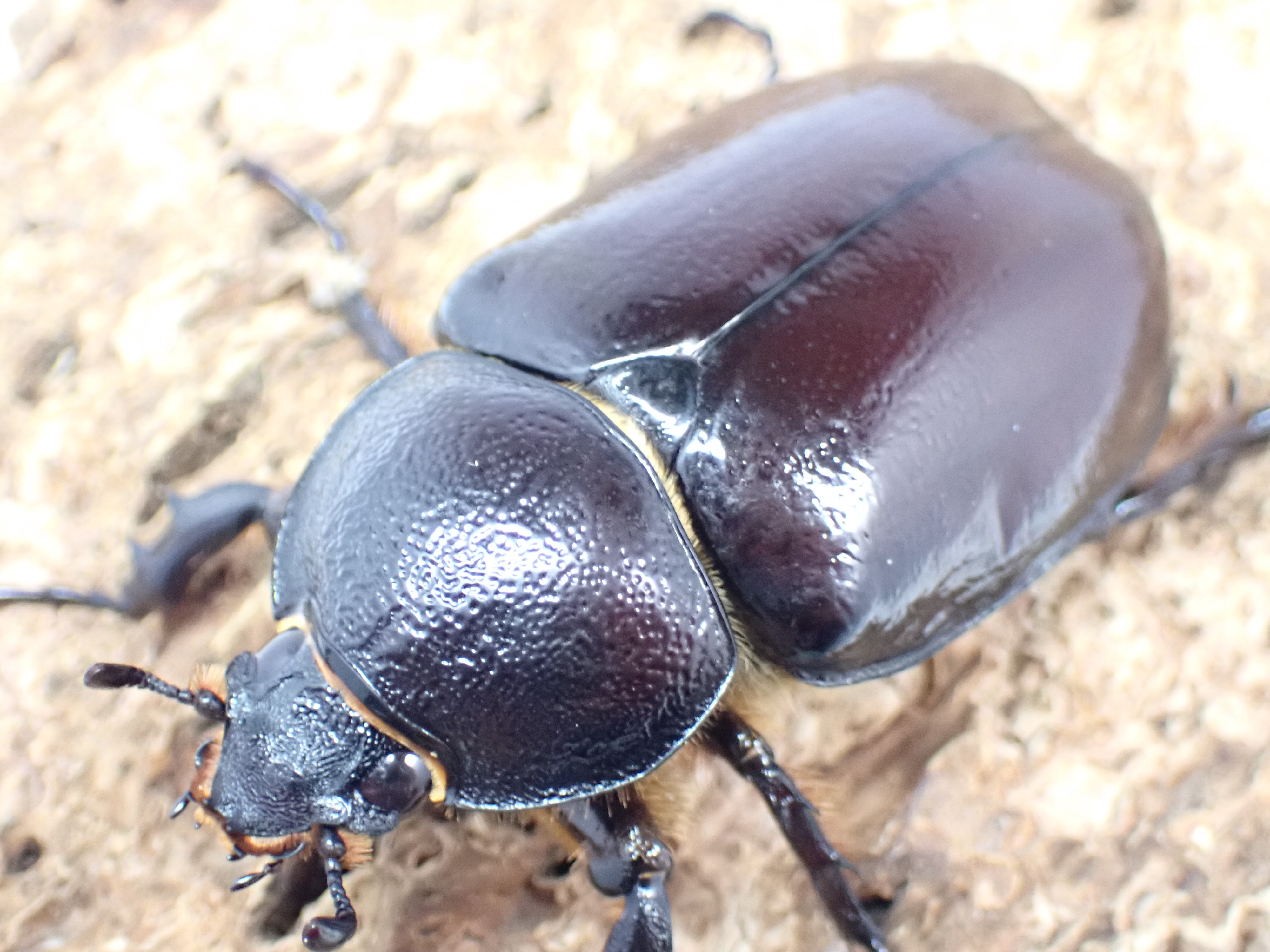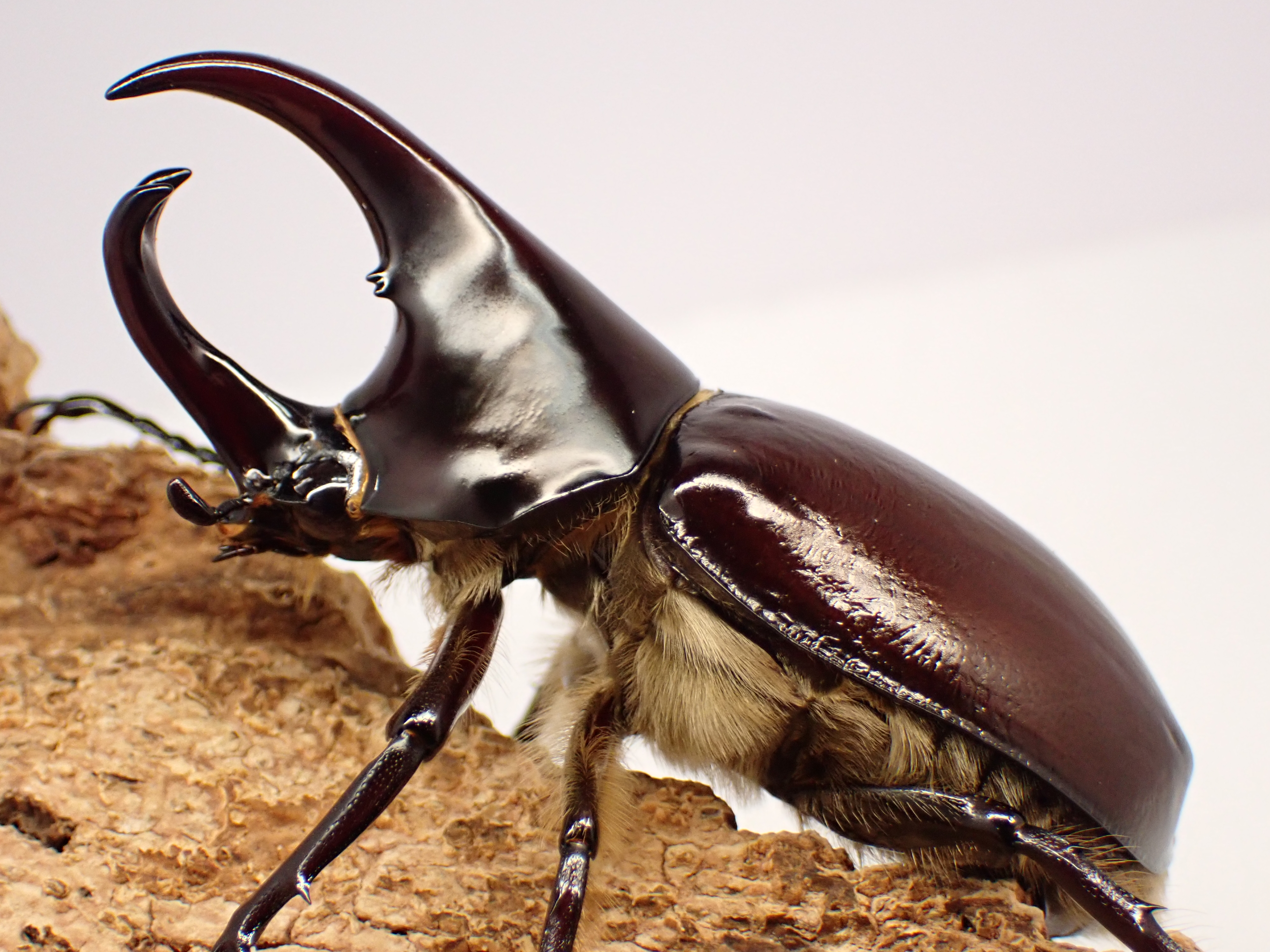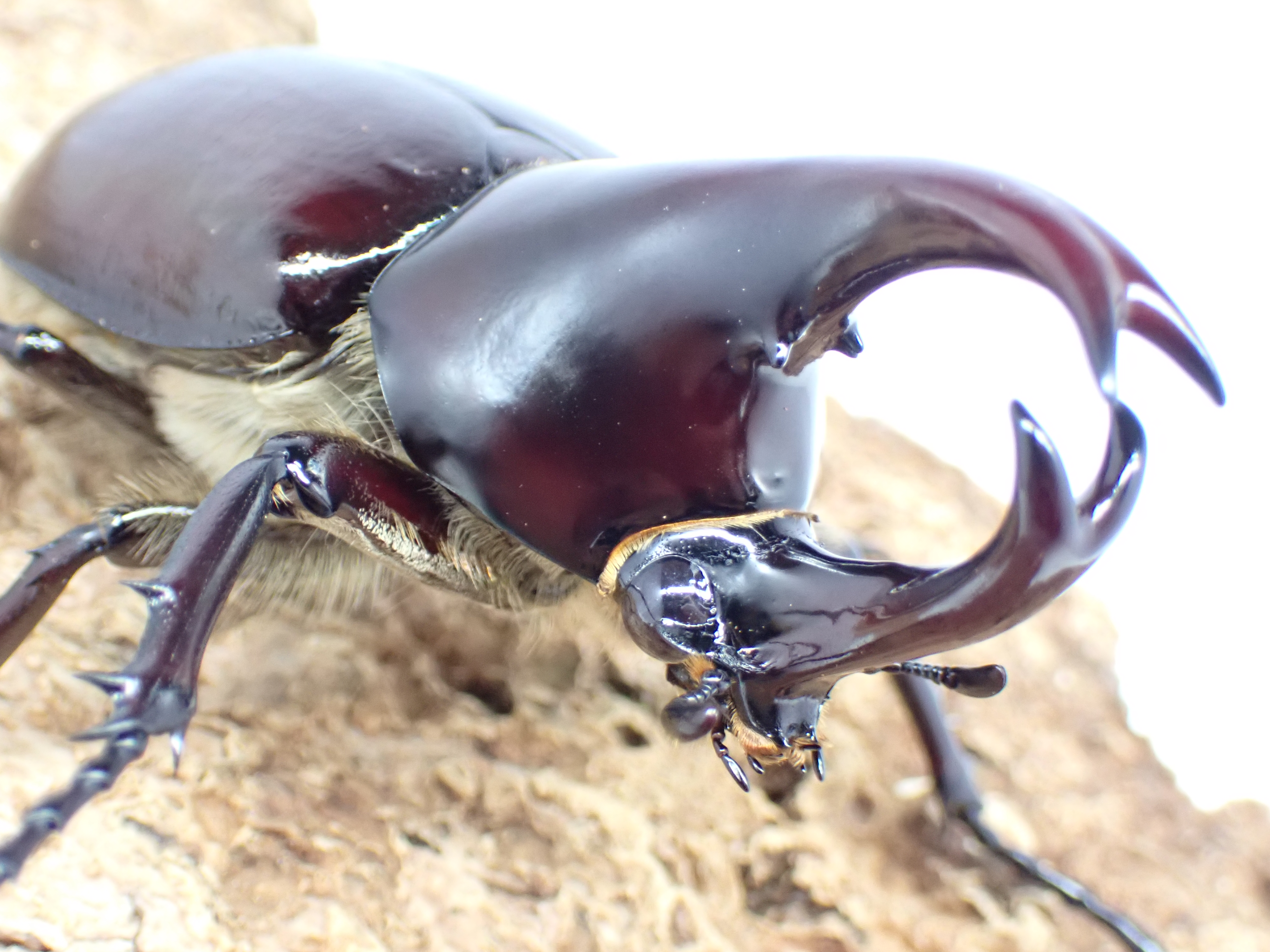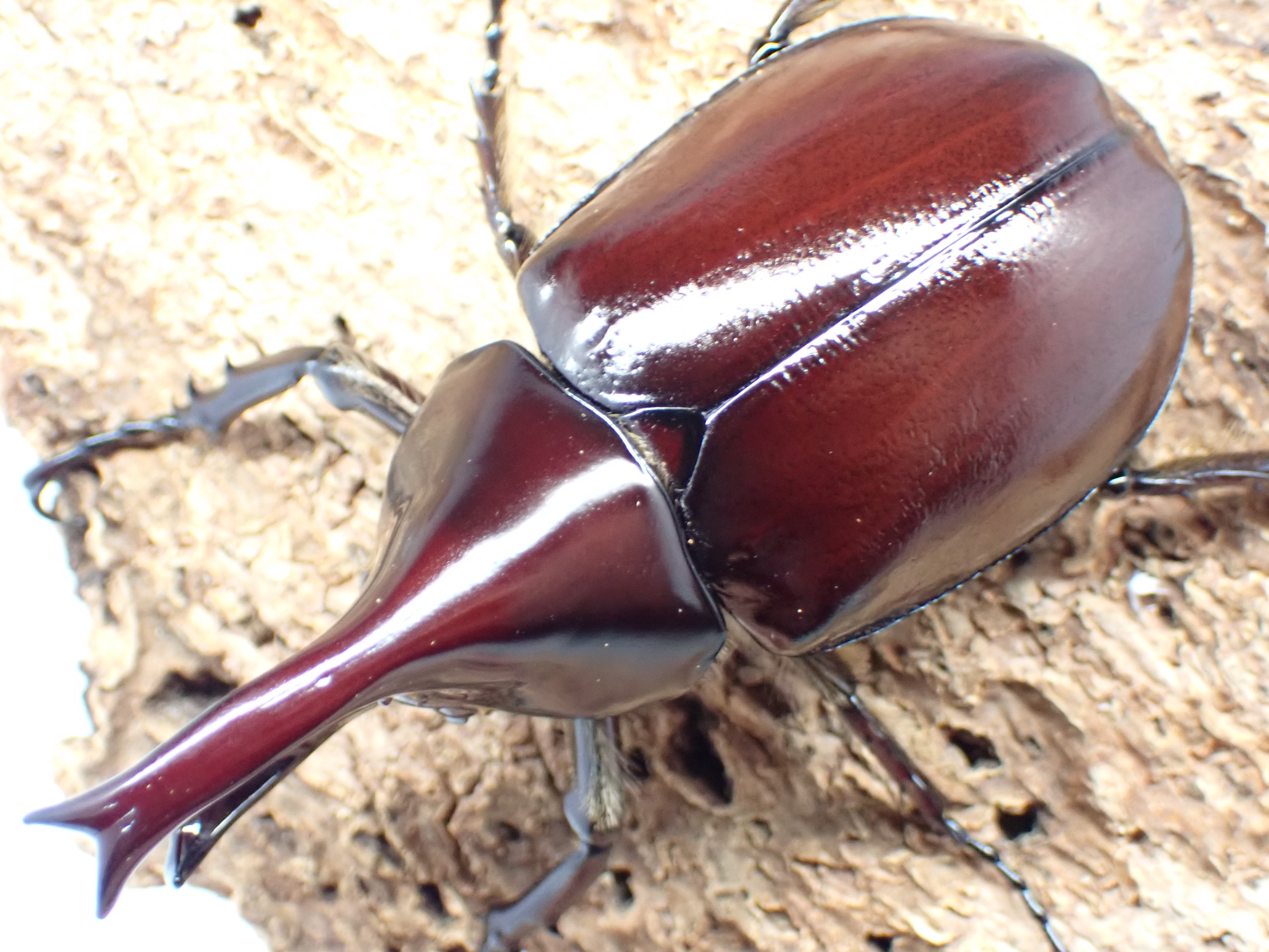 頭角と胸角が長く伸び、強い光沢と赤味を帯びたカブトムシです。