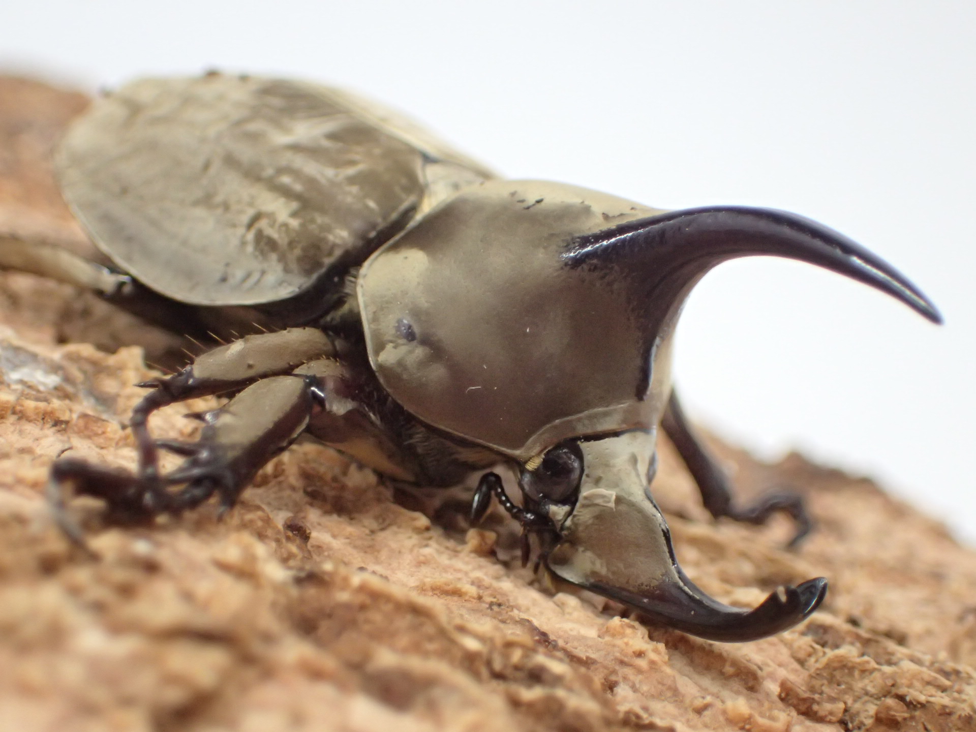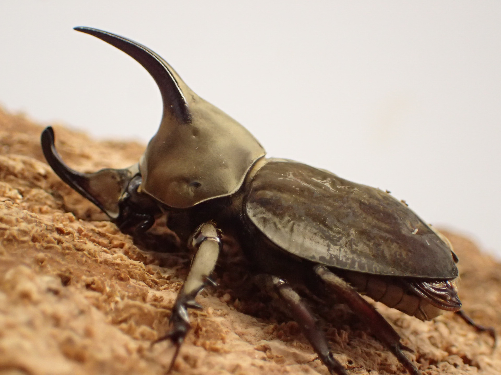 長い胸角と頭角がヘラクレスオオカブトを小型化したようなフォルムで、金色に輝くビロード状の美しい姿も相まって、非常に人気が高いヒナカブトです。