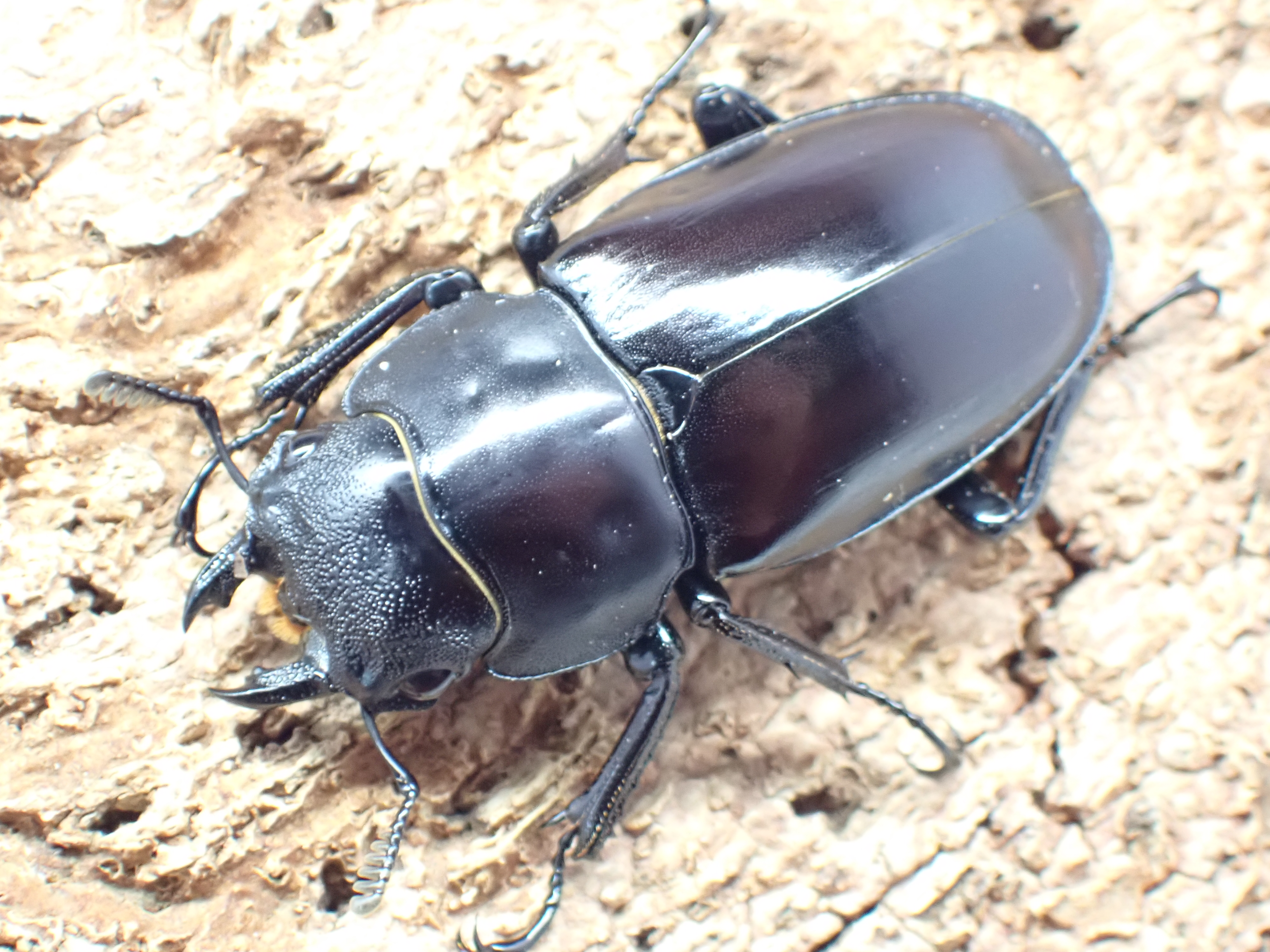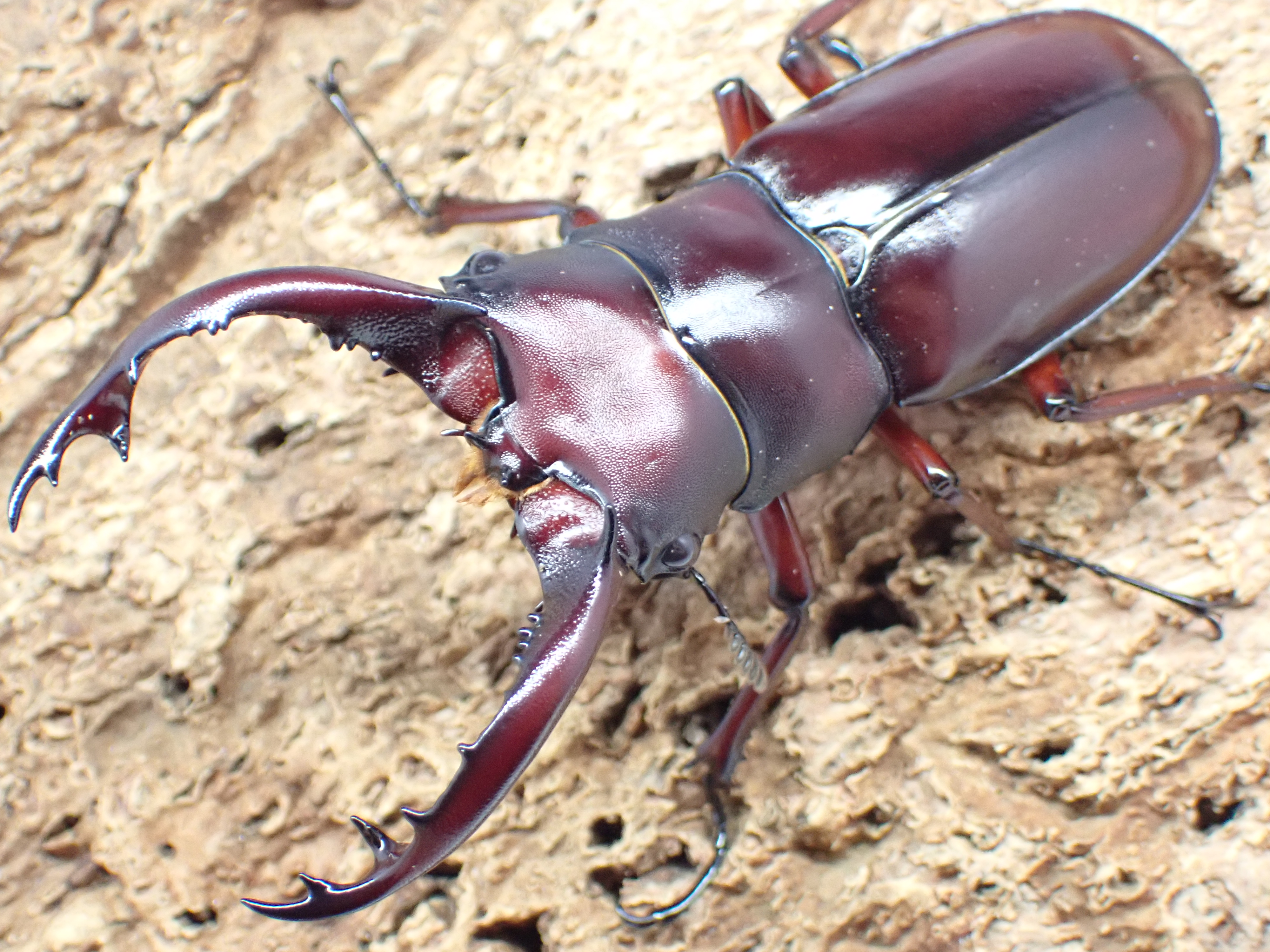 赤褐色~黒褐色で光沢があり、大アゴは立体的で、基部付近にはシカクワガタのように上下に大きく鋭い突起があります。