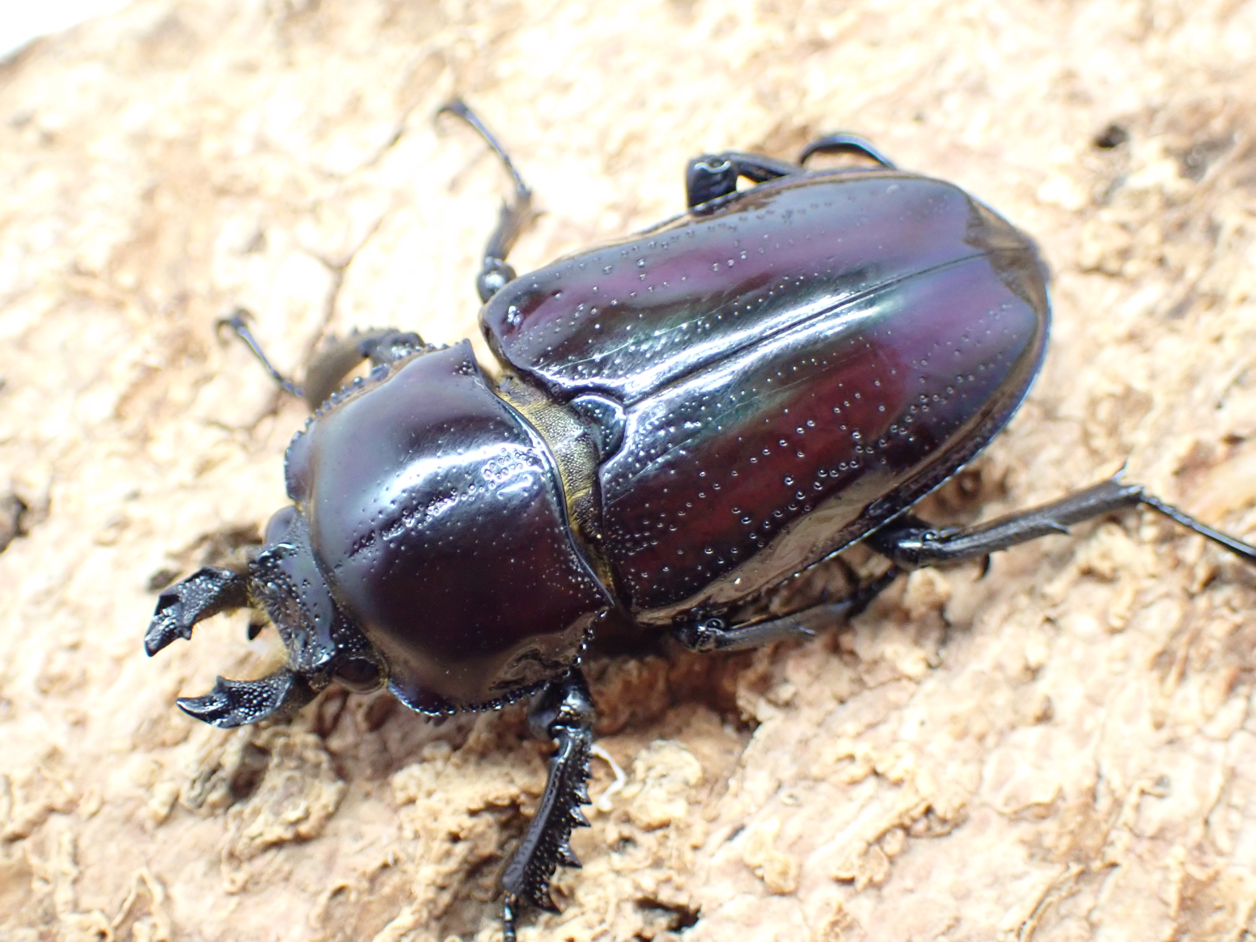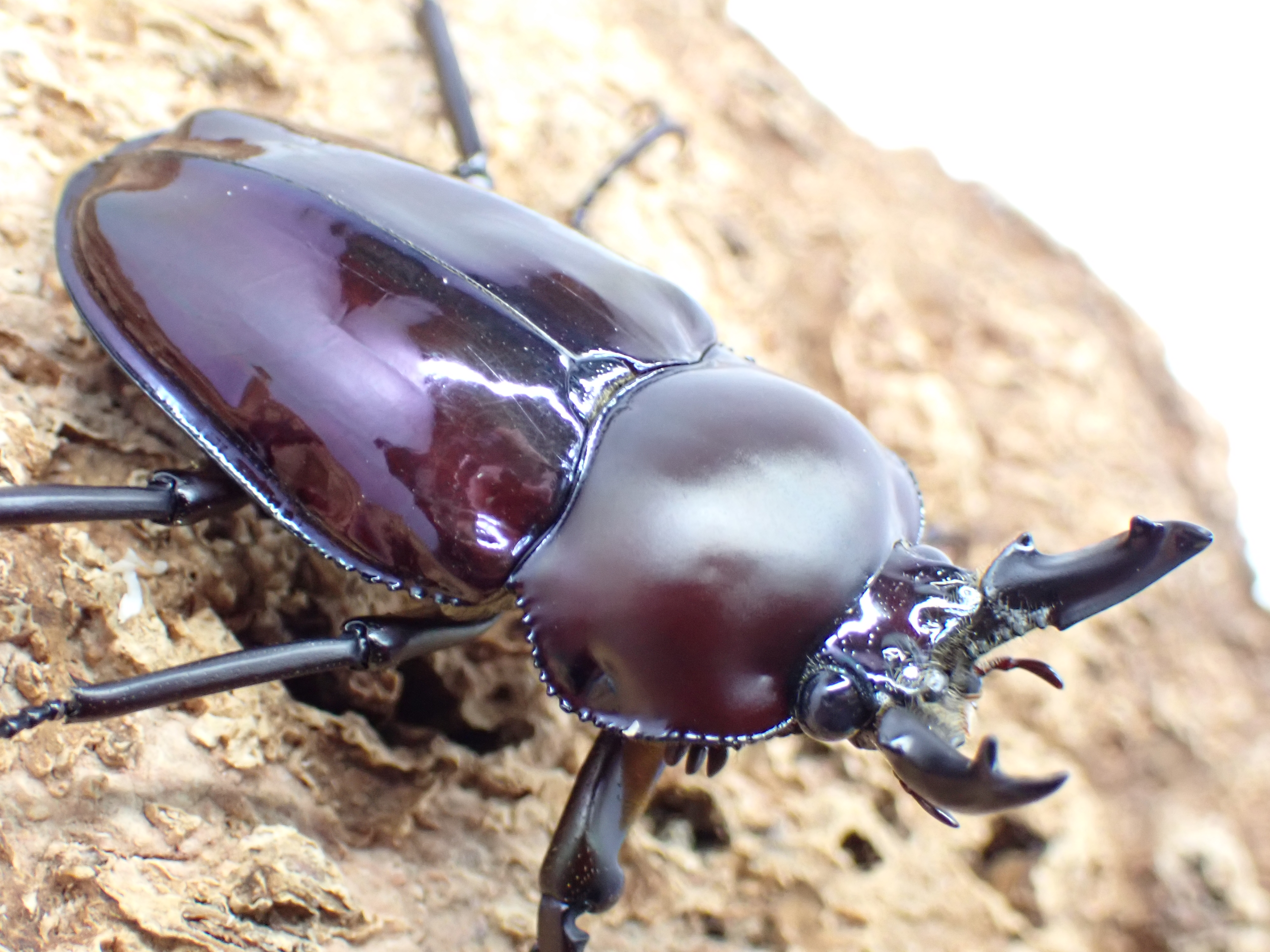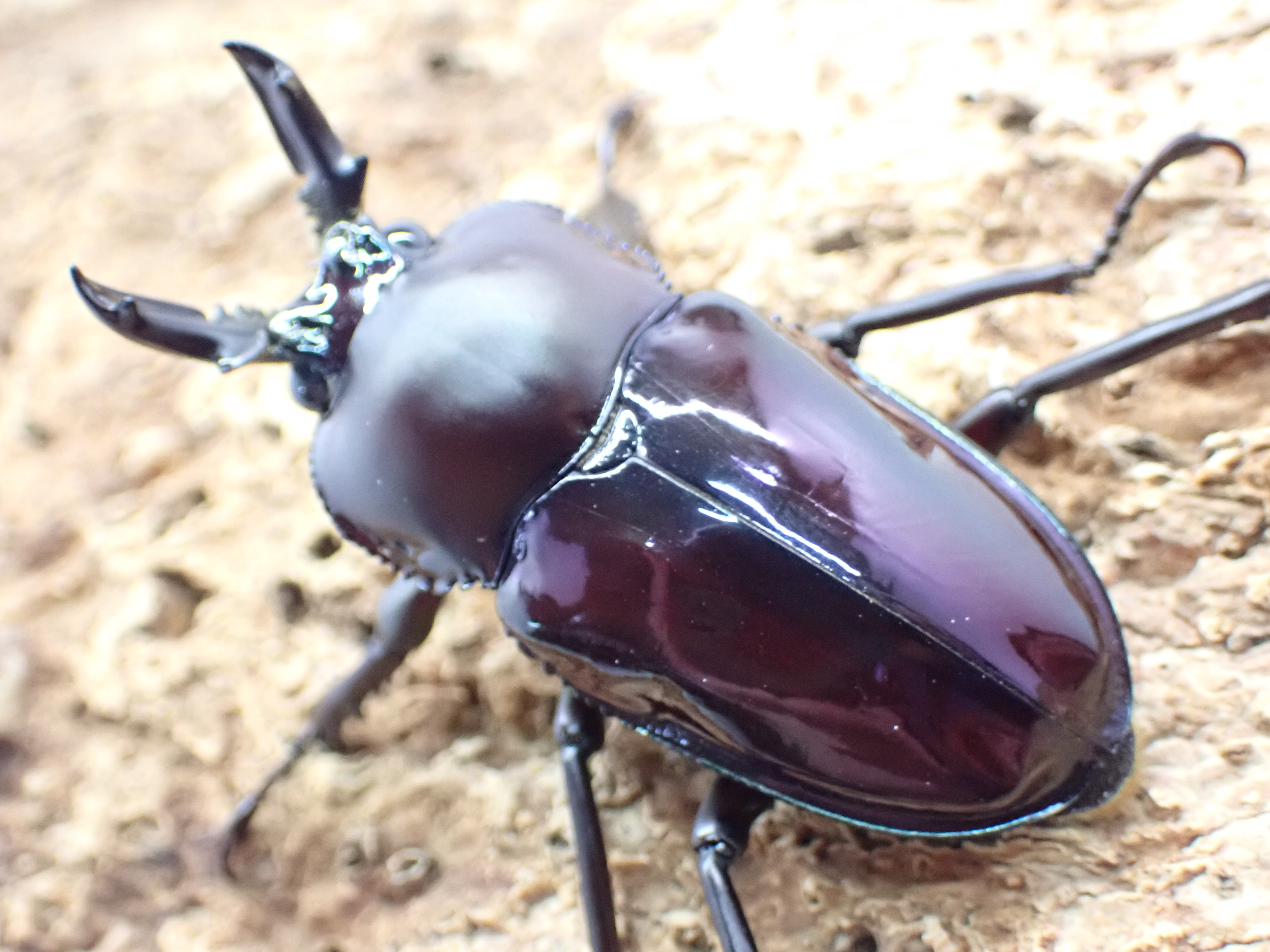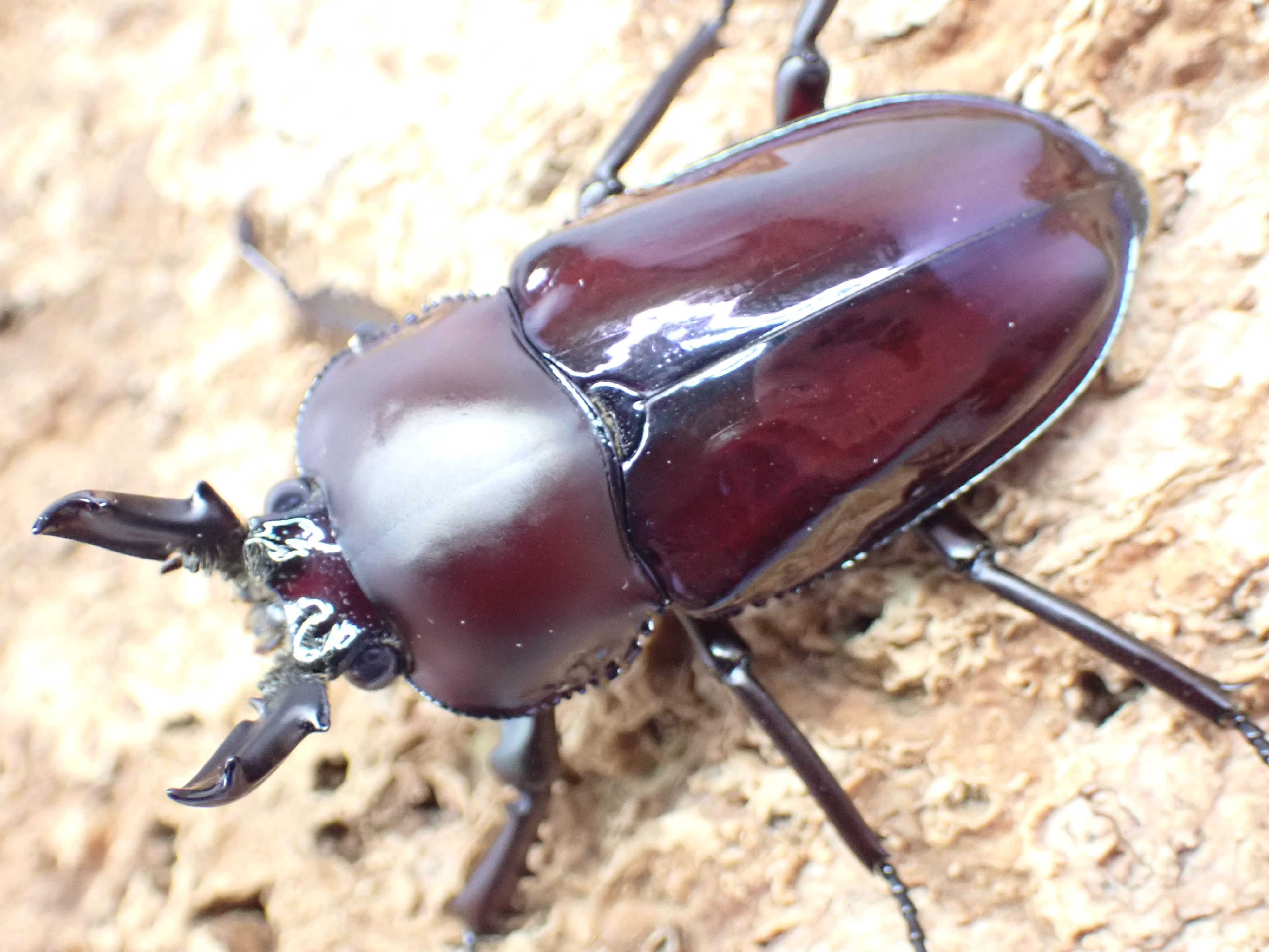 前胸背板は通常ツヤ消しですが、光沢を伴う個体も出現するなど、変異の多いクワガタです。
