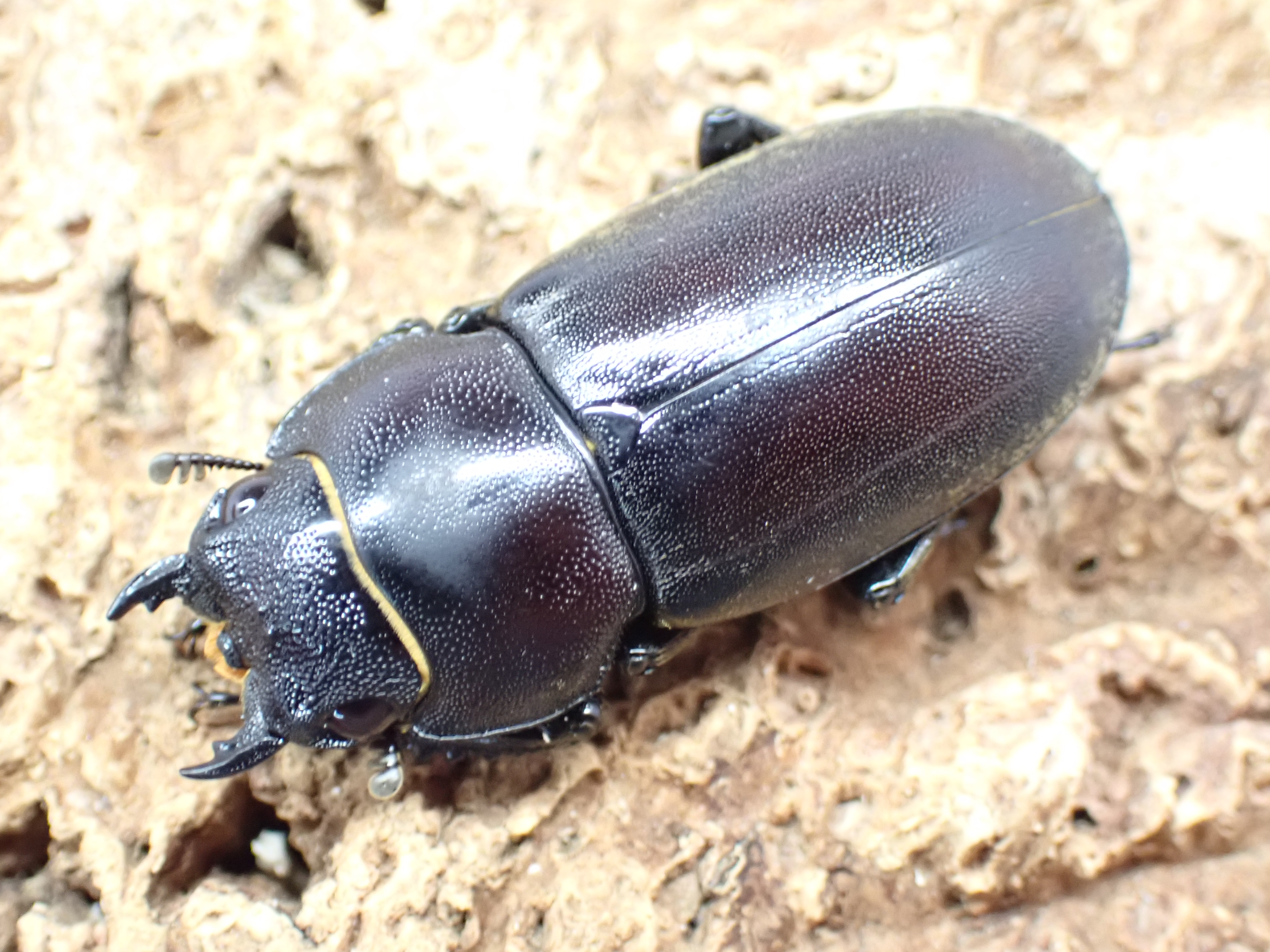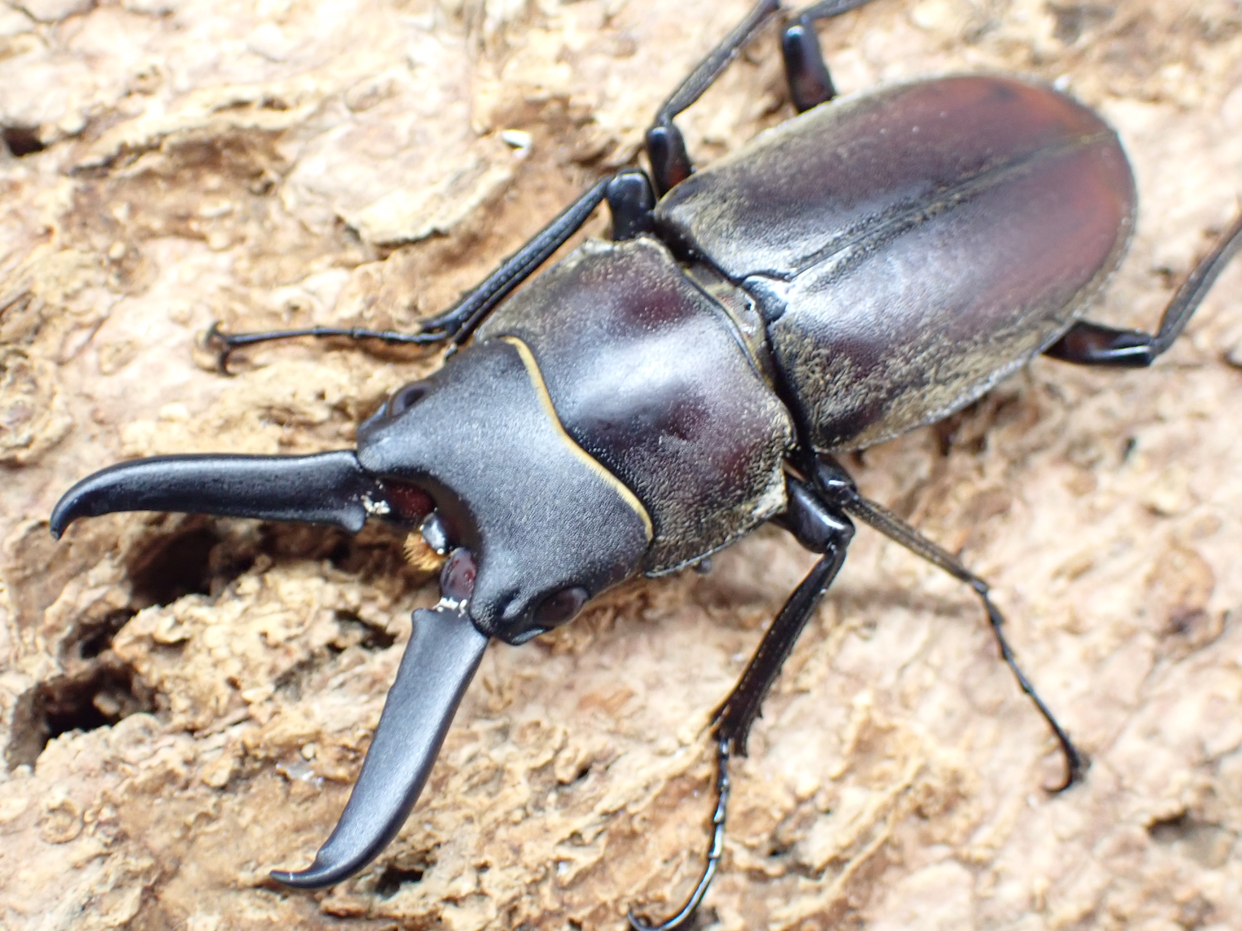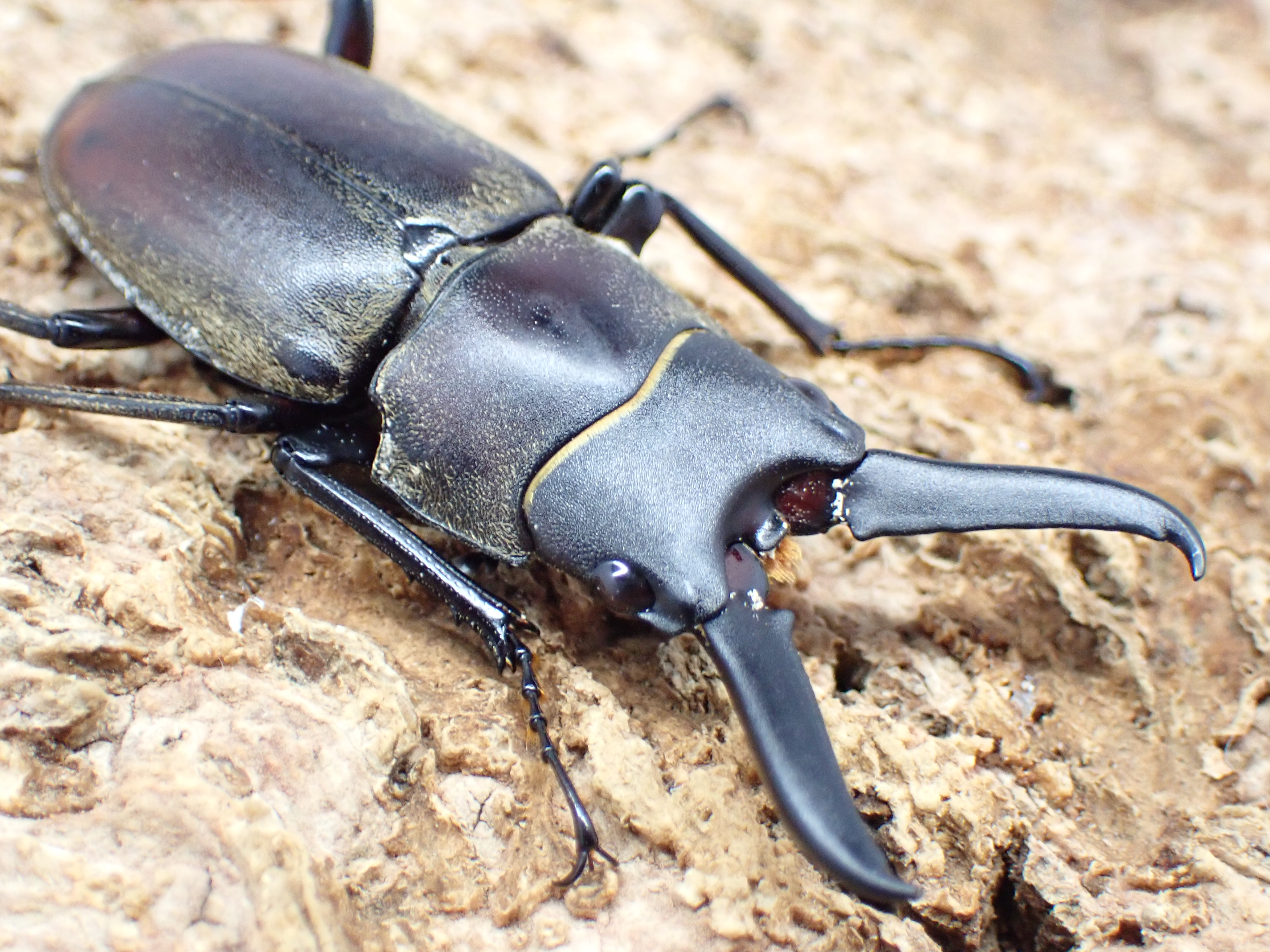 オスの体は毛深く、大アゴは平たく長く、異様な印象を受ける大型のノコギリクワガタです。