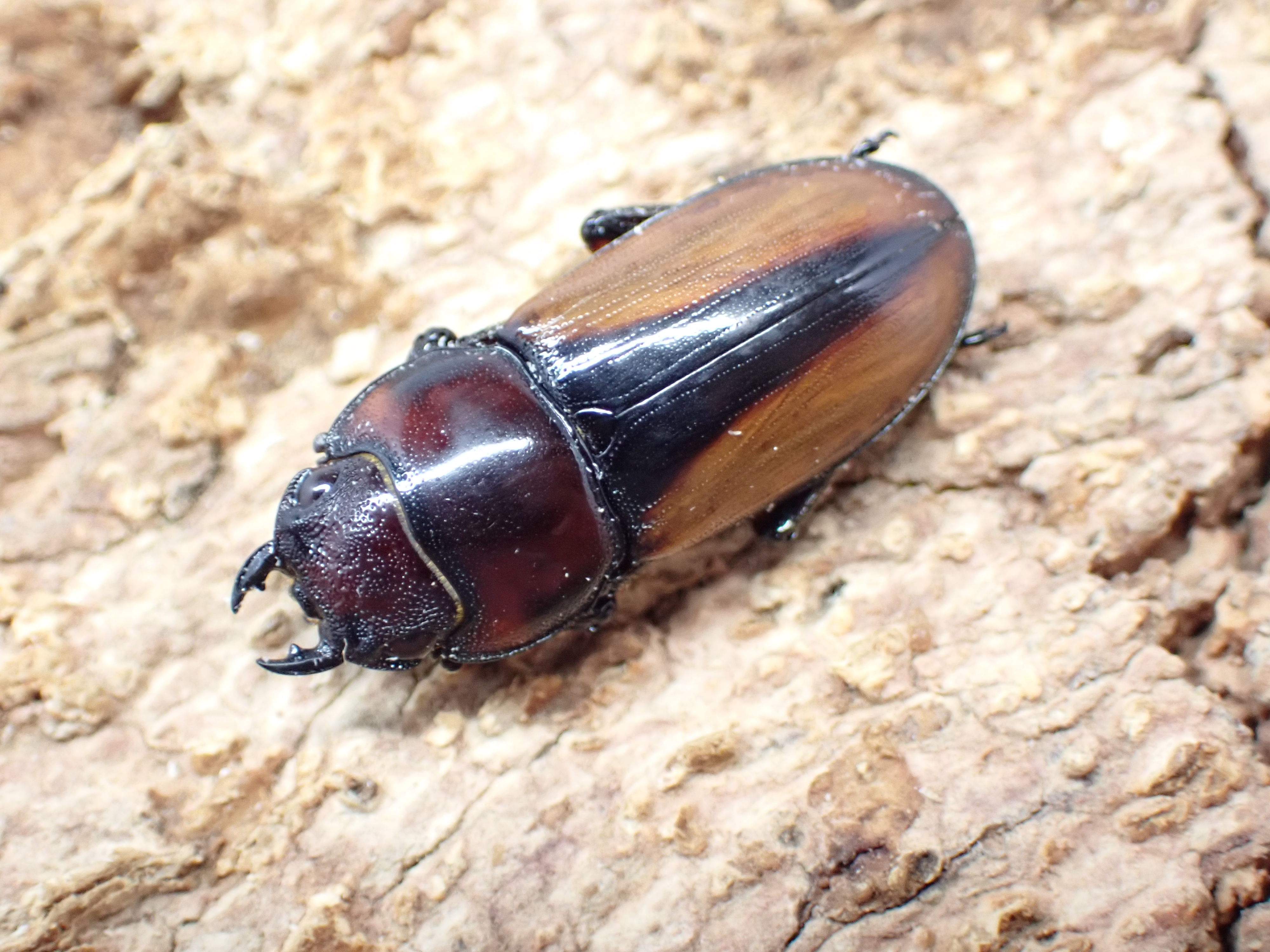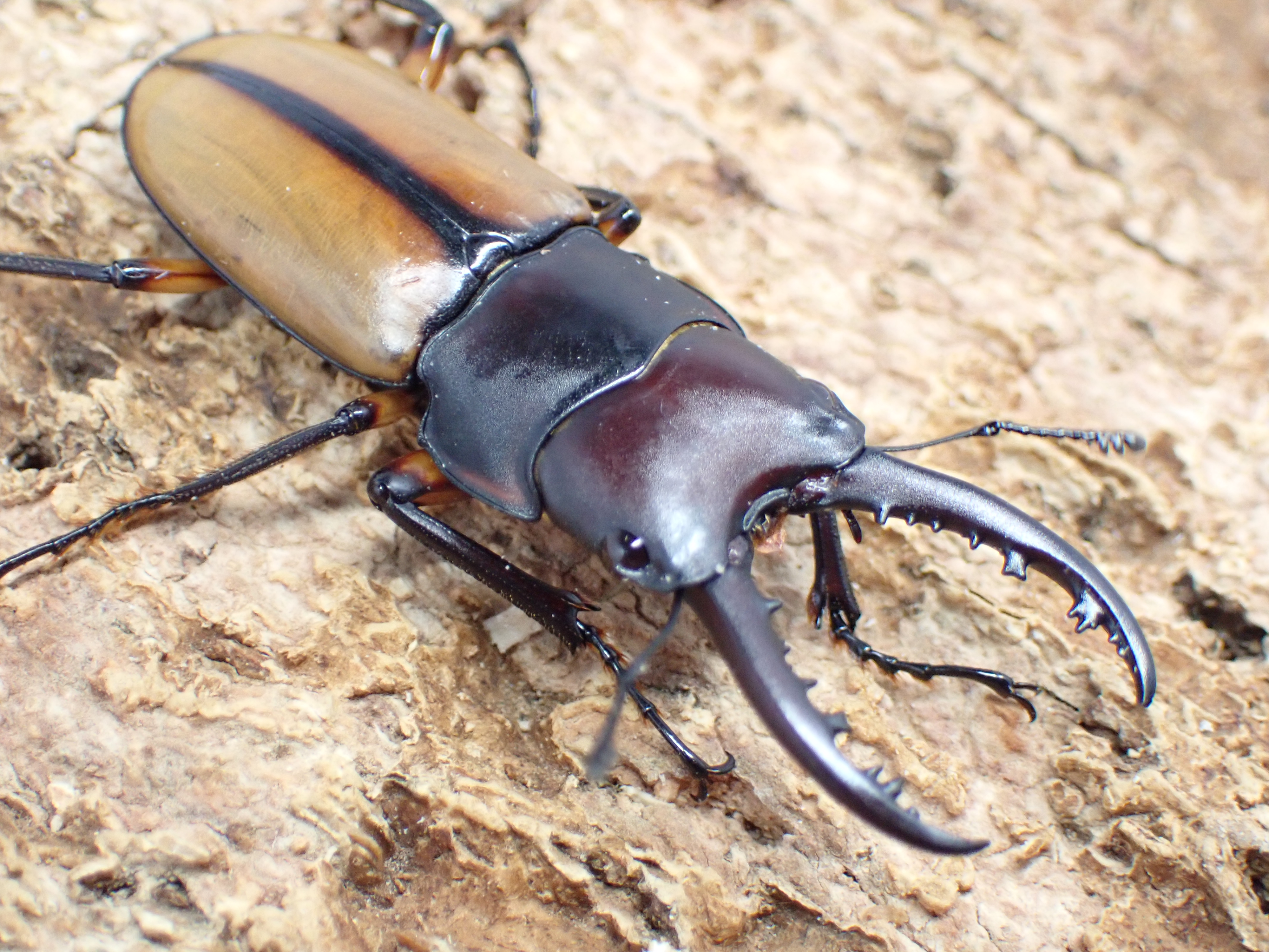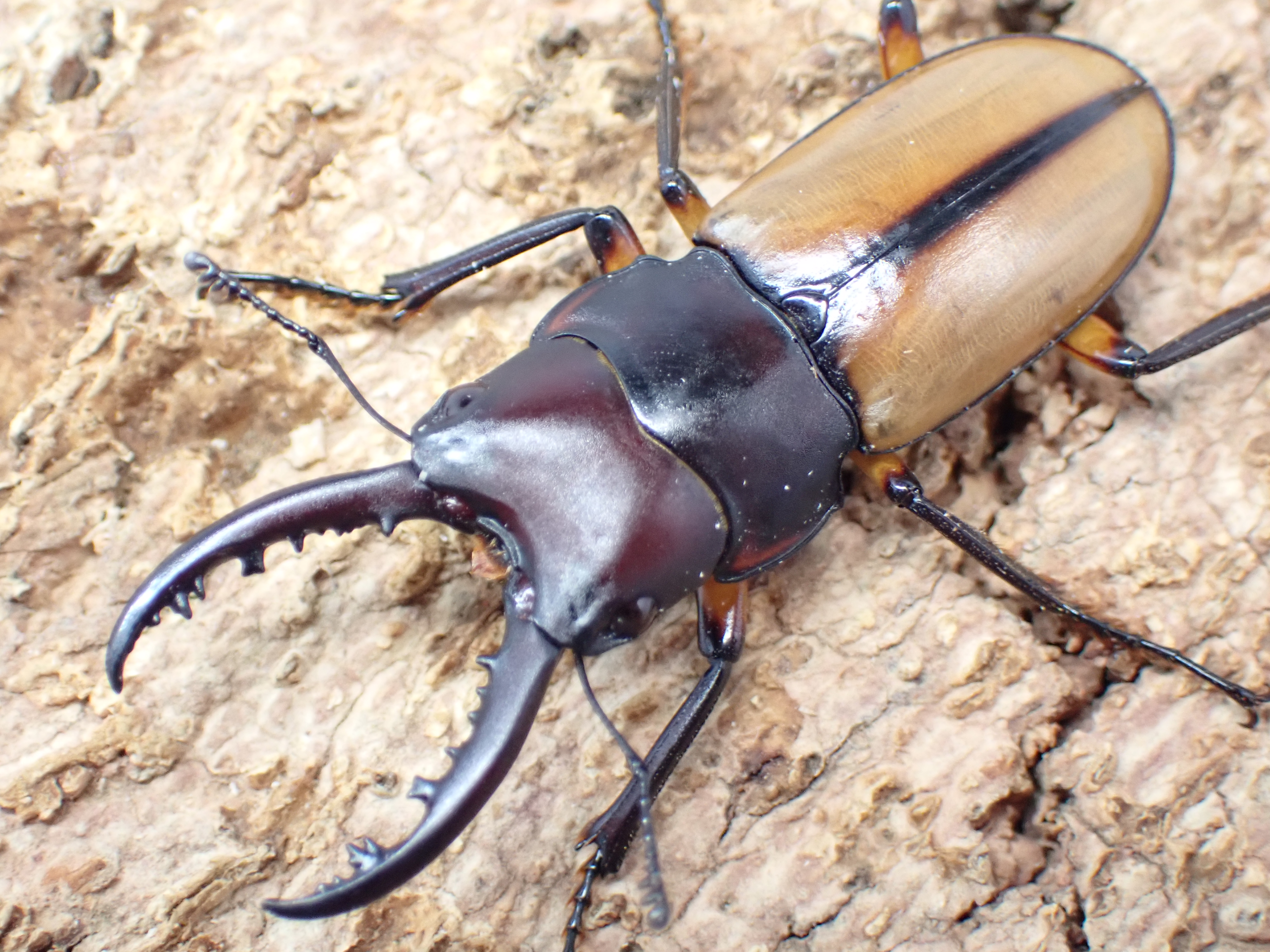 暗褐色の大アゴ・頭部・前胸背板に黄褐色の上翅が生える美しい小型ノコギリクワガタ。