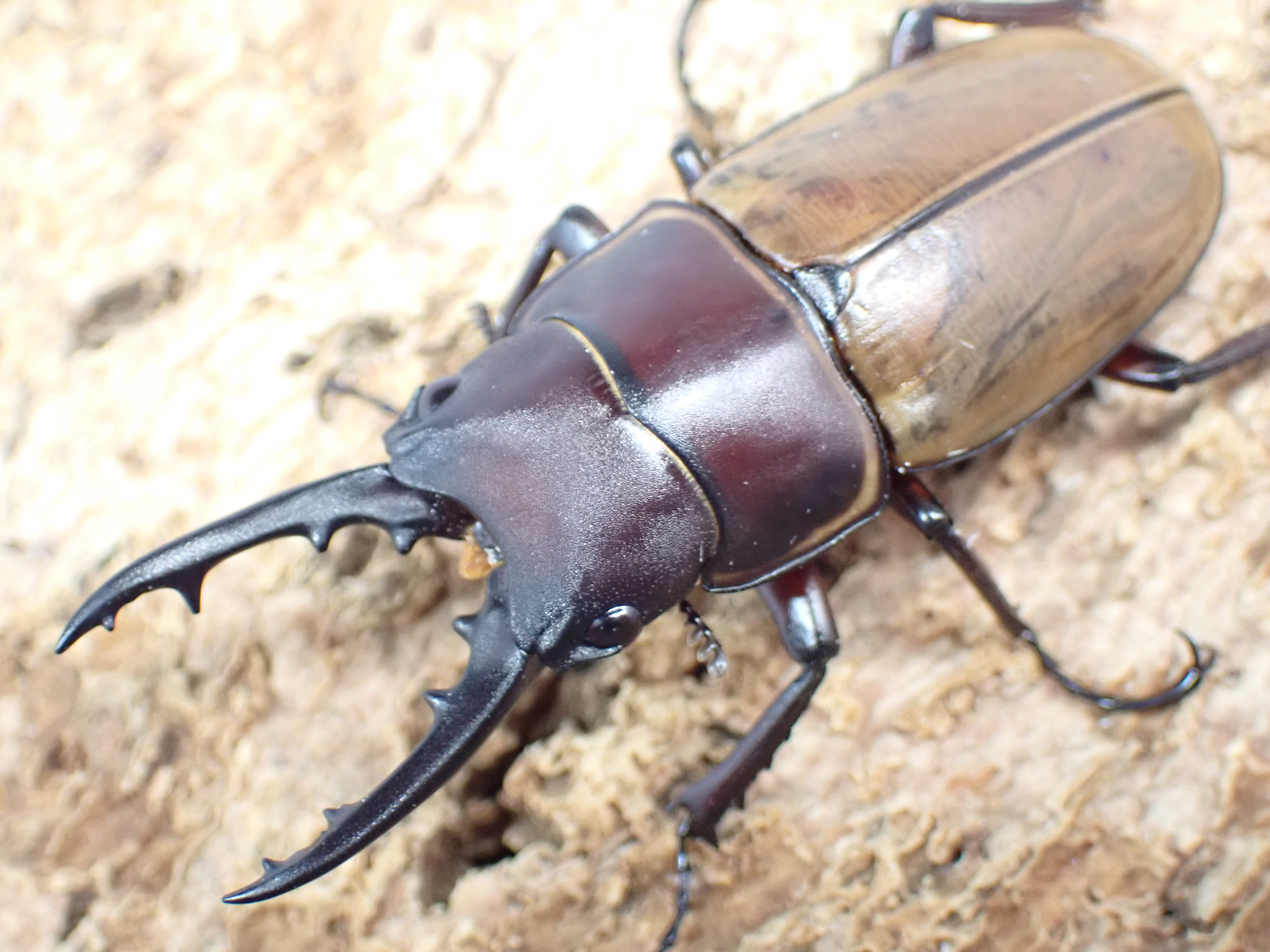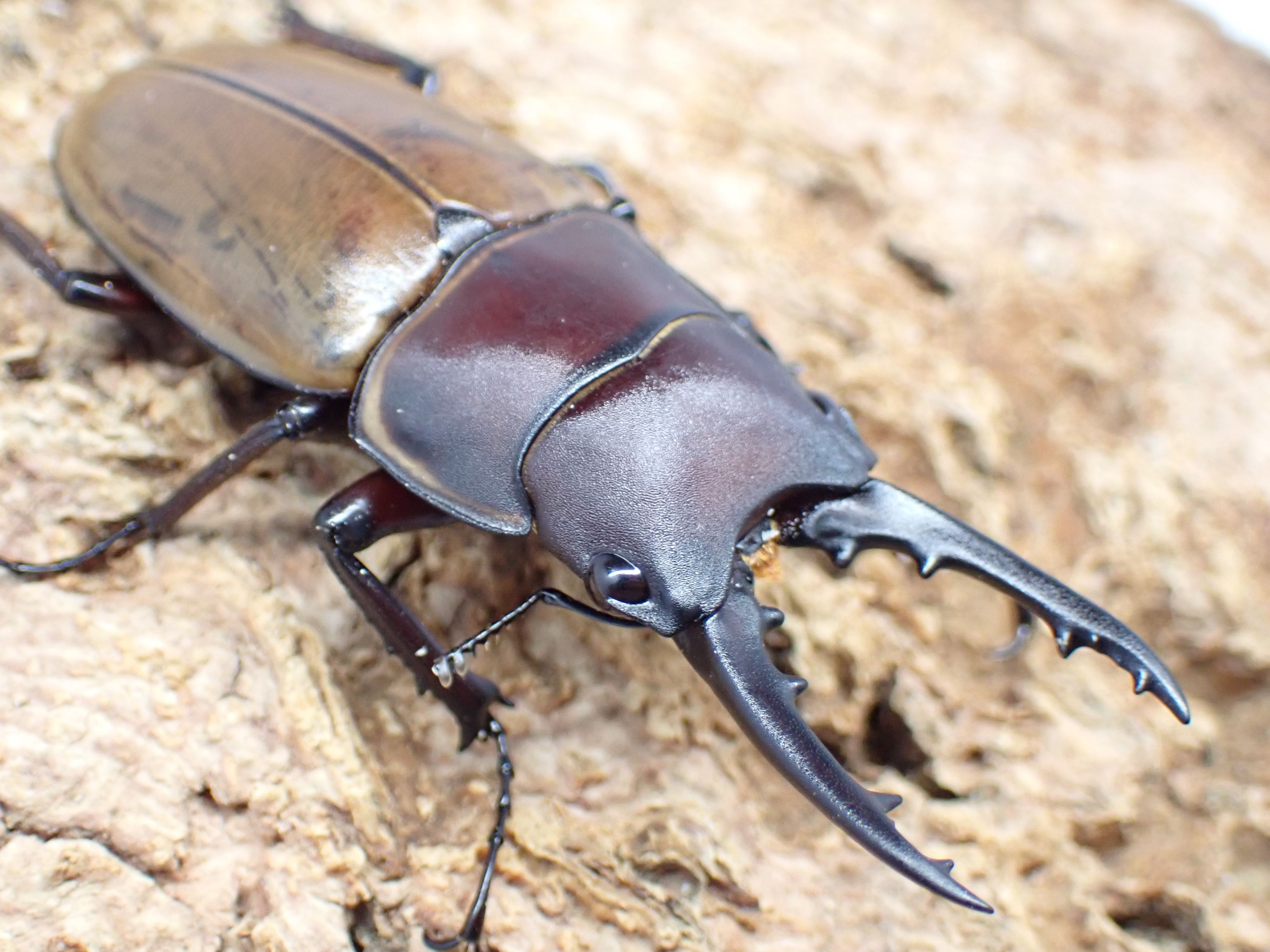 オスの大アゴは細長く前方へ伸びて、ごく緩やかに湾曲して、先端から1/3~2/5の位置にやや大きい内歯があり、その前方に1~3本の小内歯があります。