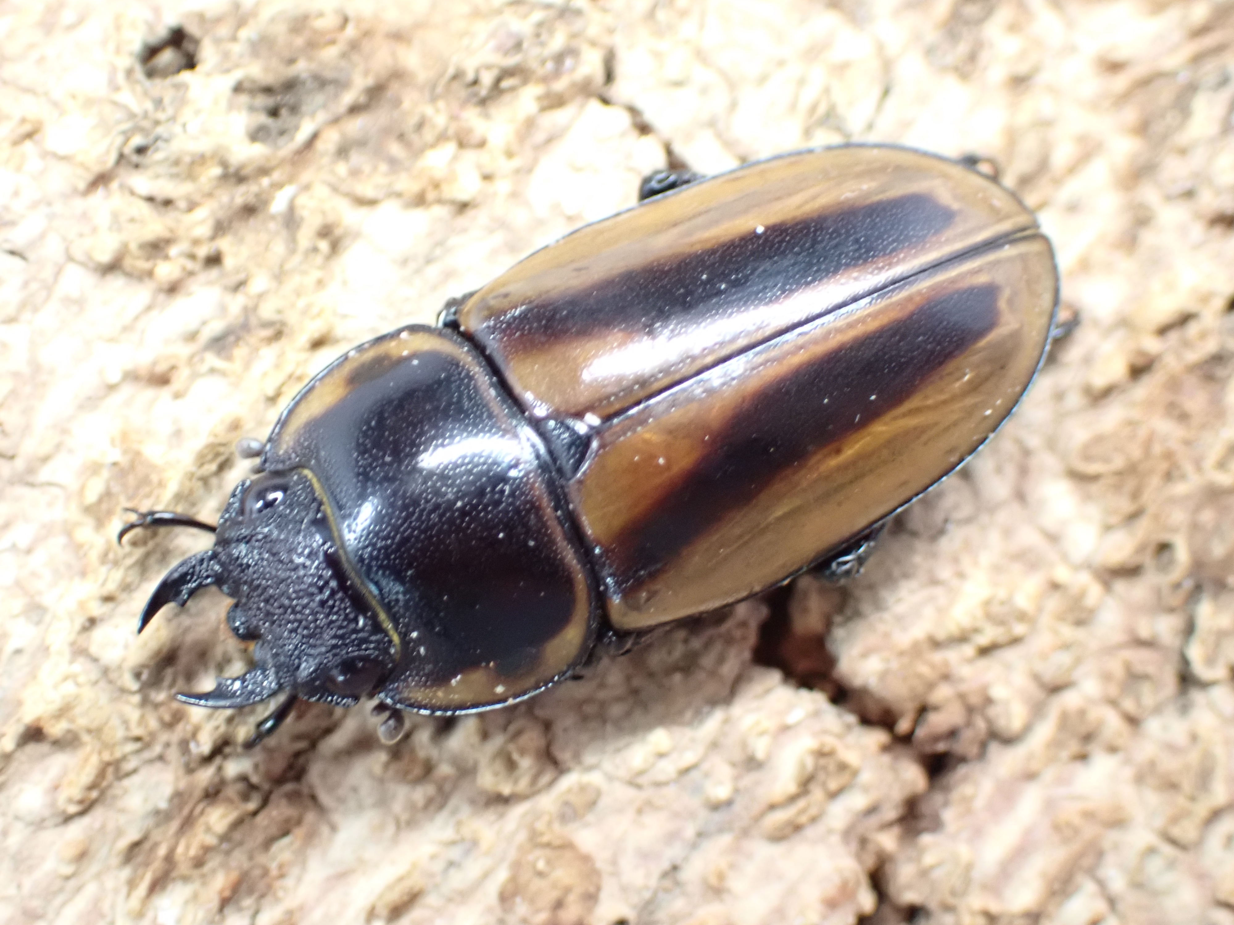 大アゴ・頭部は黒色で、前胸背板は黒褐色で側縁部から基部にかけて細い帯状に黄褐色部があります。