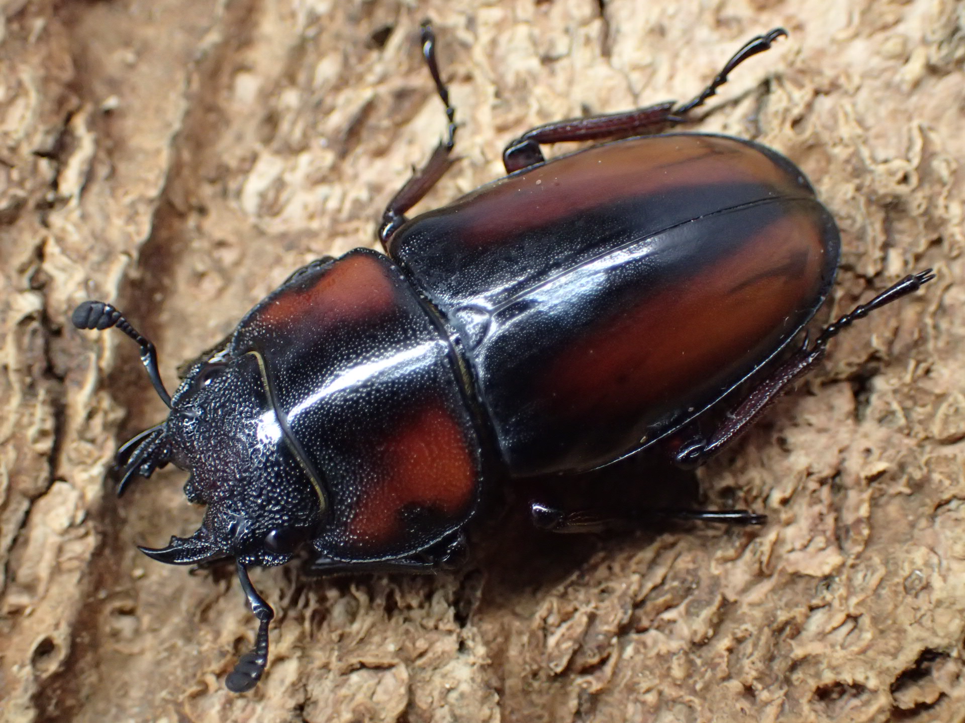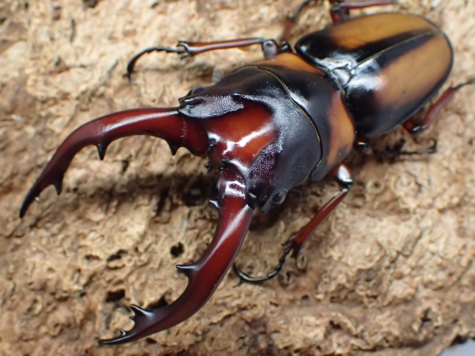 サバゲノコギリクワガタに似ていますが、頭部が大きく厚みがあり、中央部はU字状に深く陥没します。