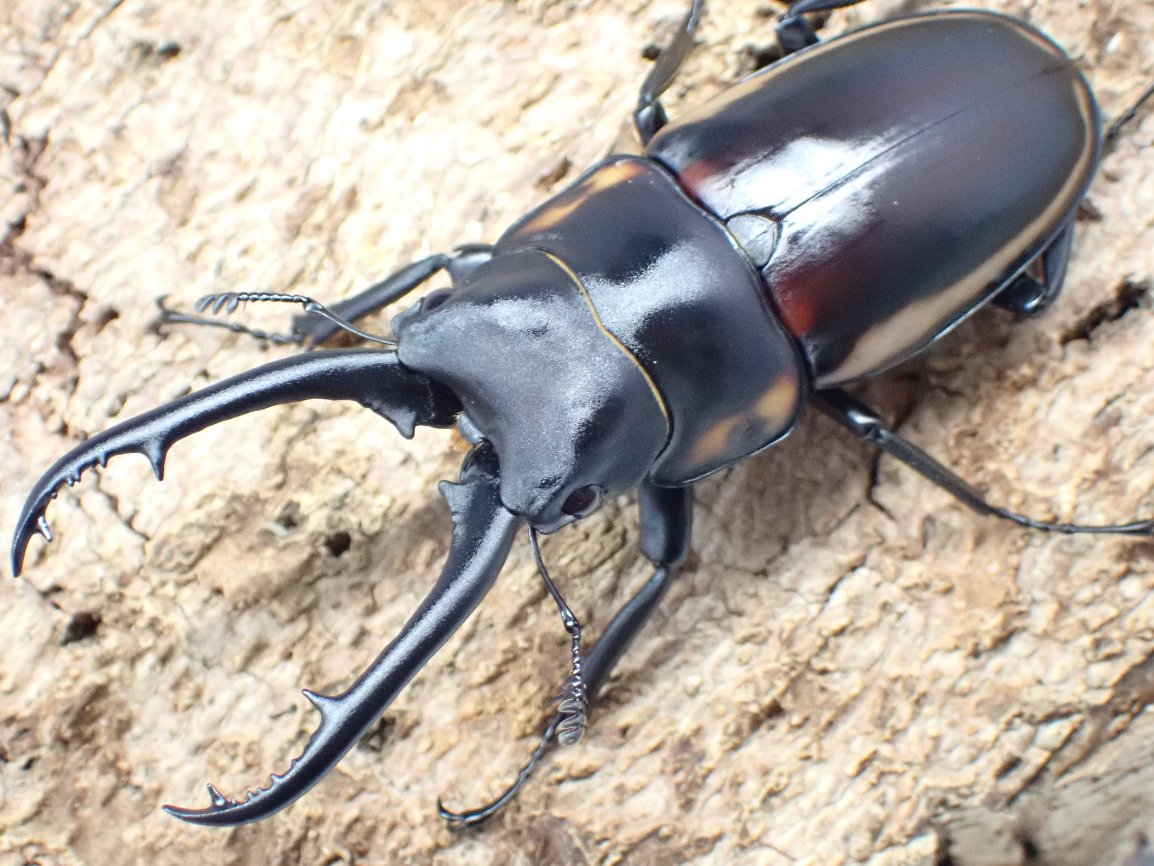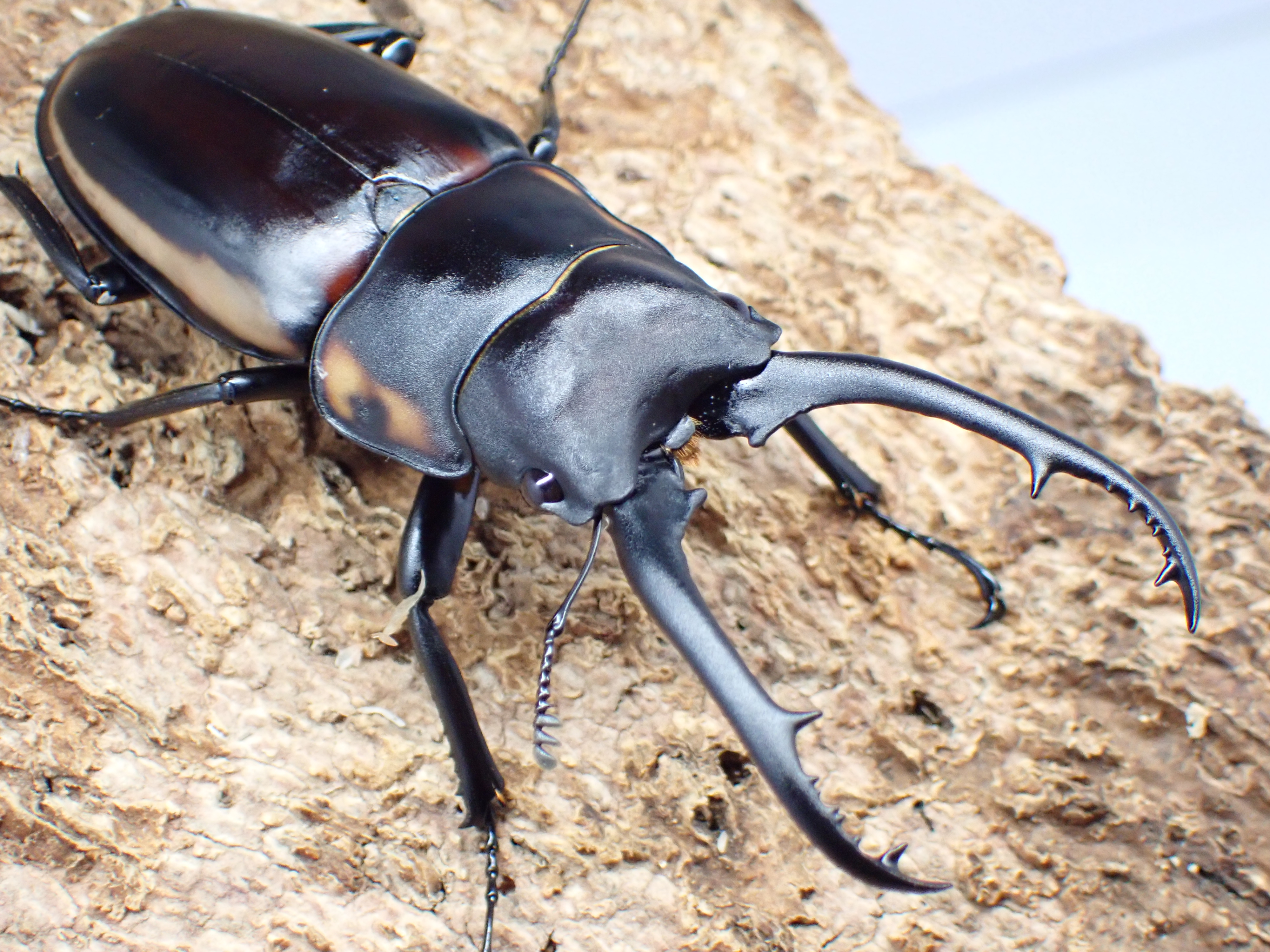 スペクタビリスノコギリクワガタに似ていますが、より大型で、オスの体は細長くツヤ消し状です。