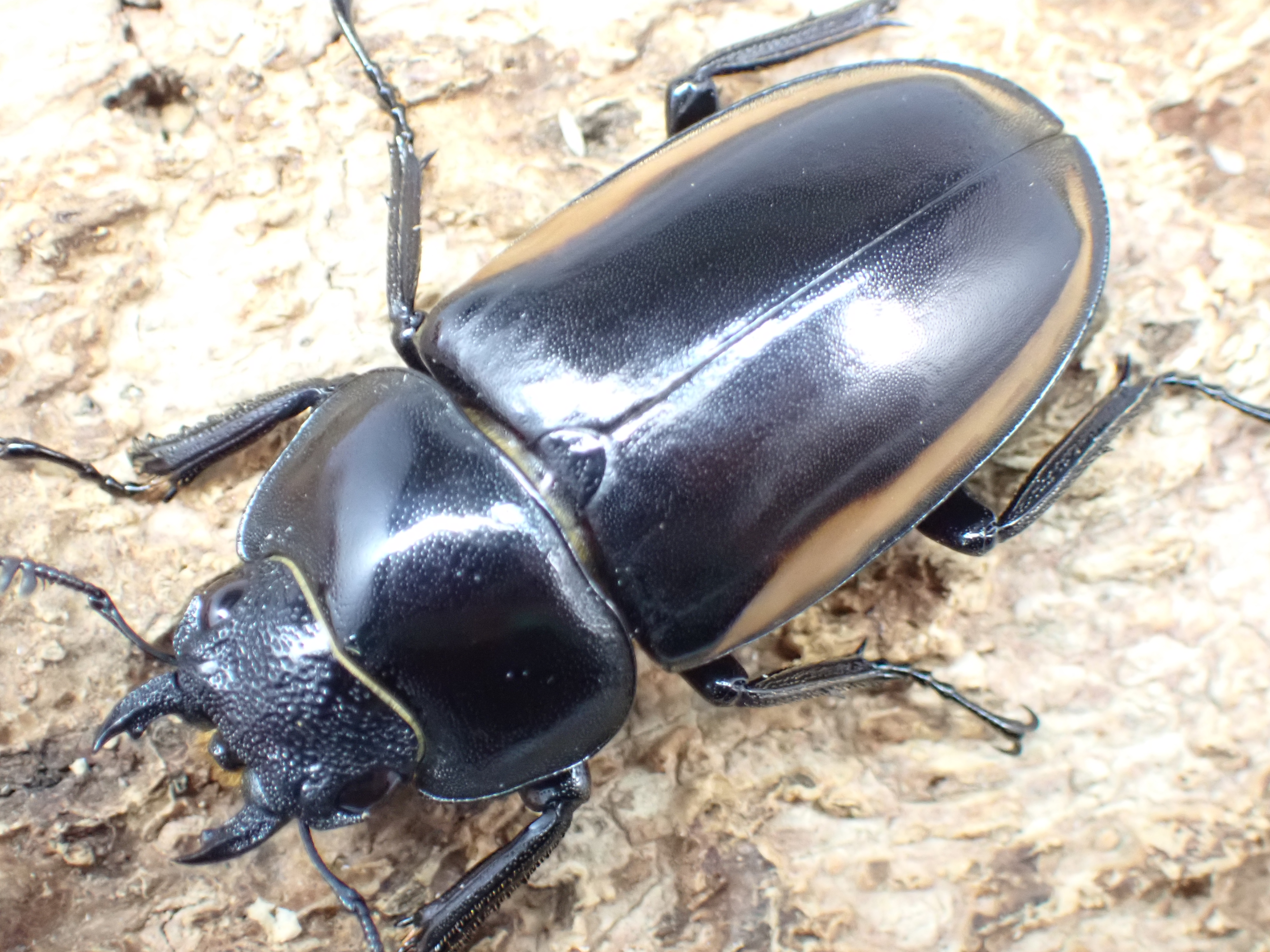 大アゴと頭部は黒色で、前胸背板は黒褐色~黒色で、側縁部に黄褐色紋があります。