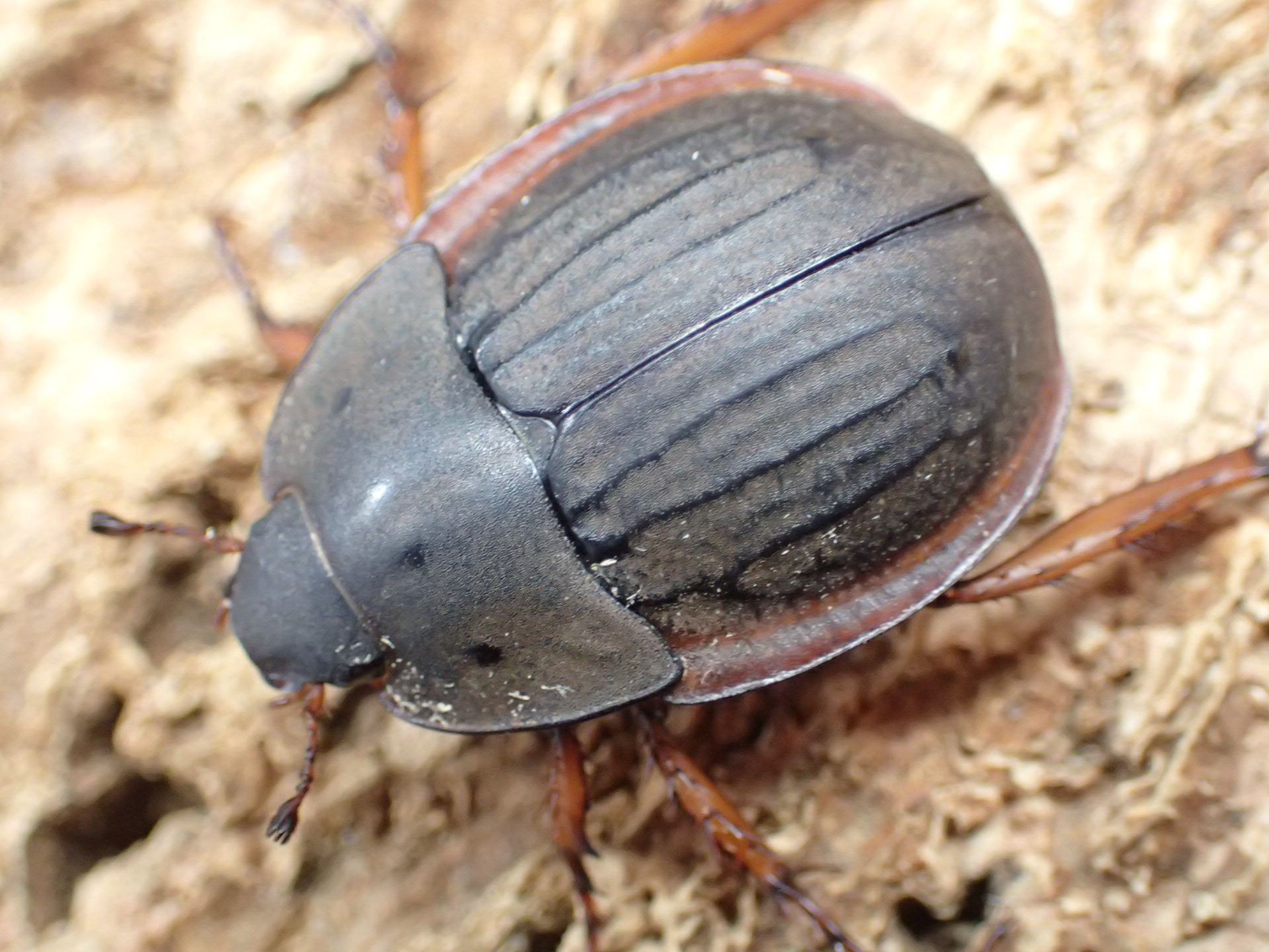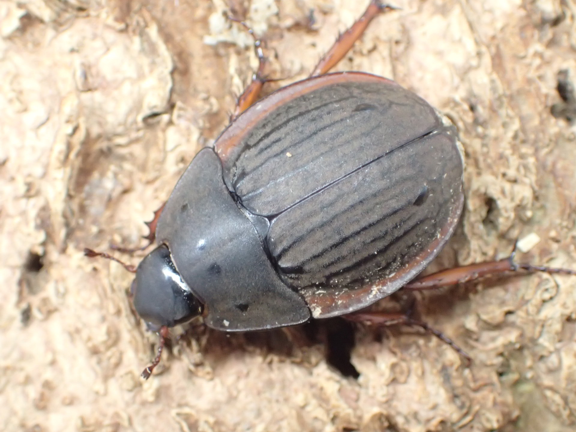 上翅の隆条と側縁の褐色紋が特徴的で、カブトムシらしからぬ姿をしています。