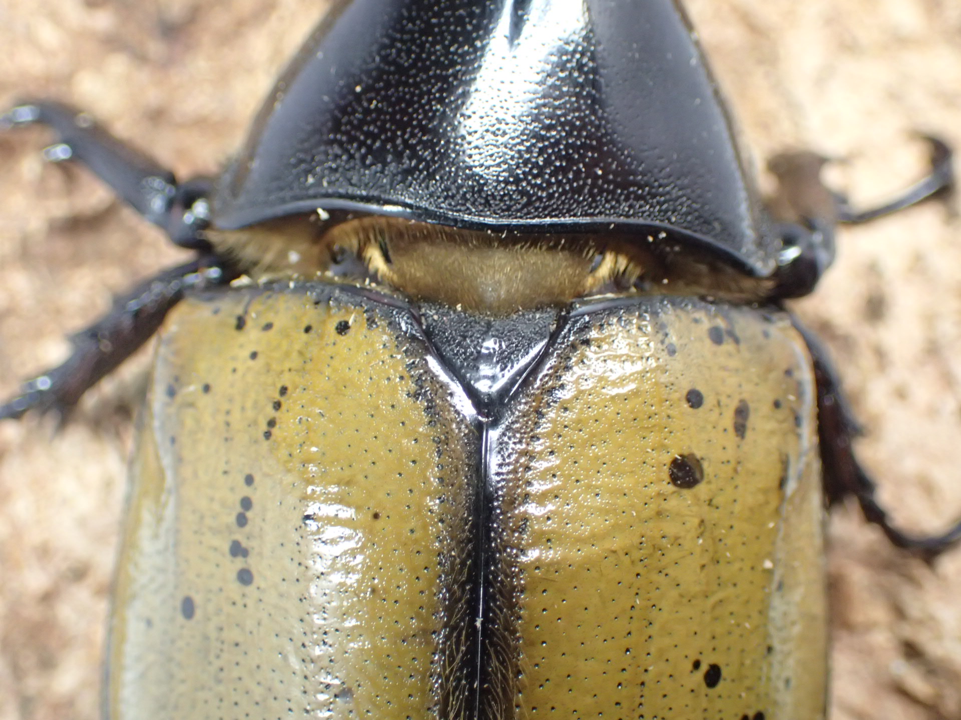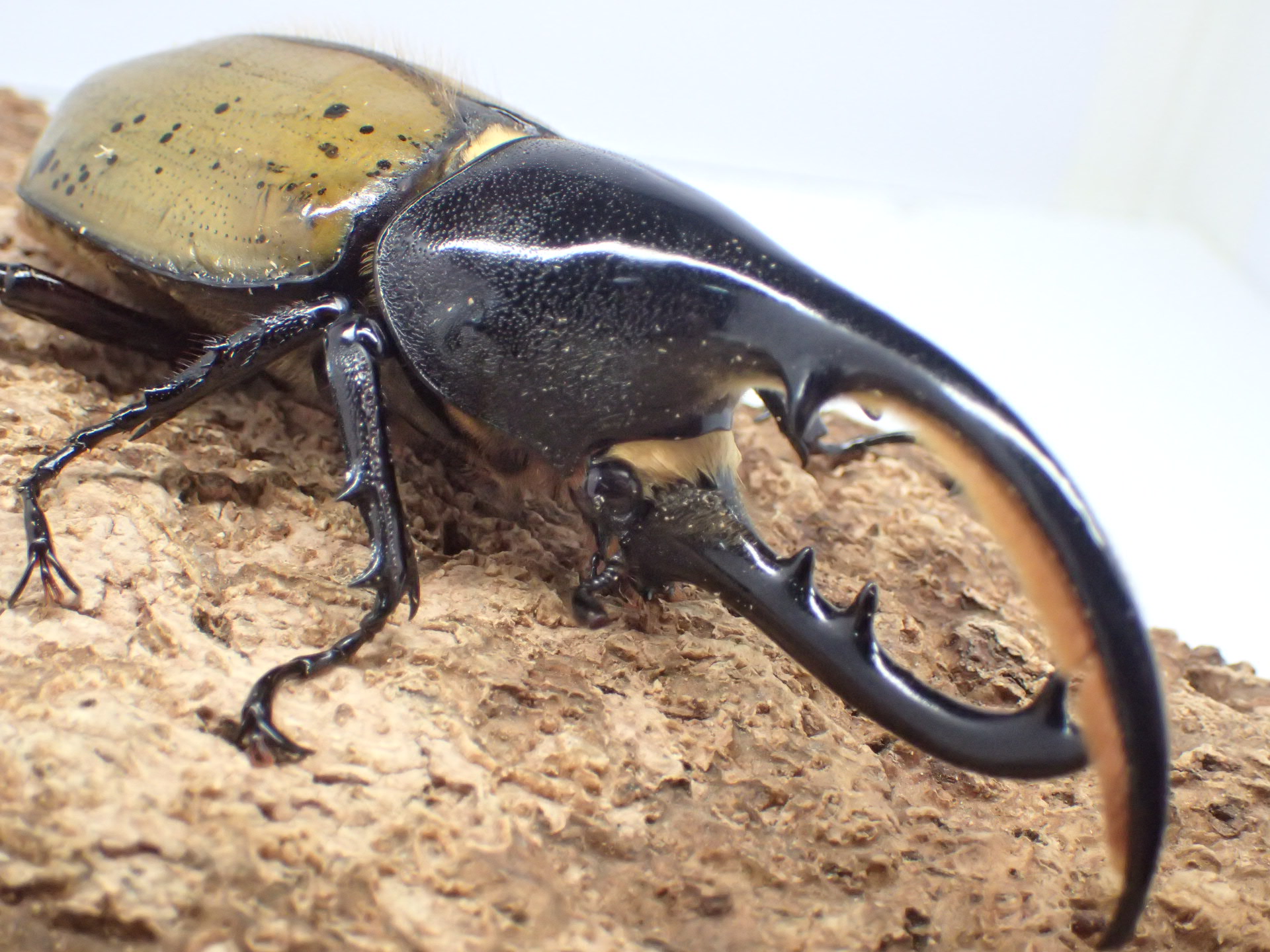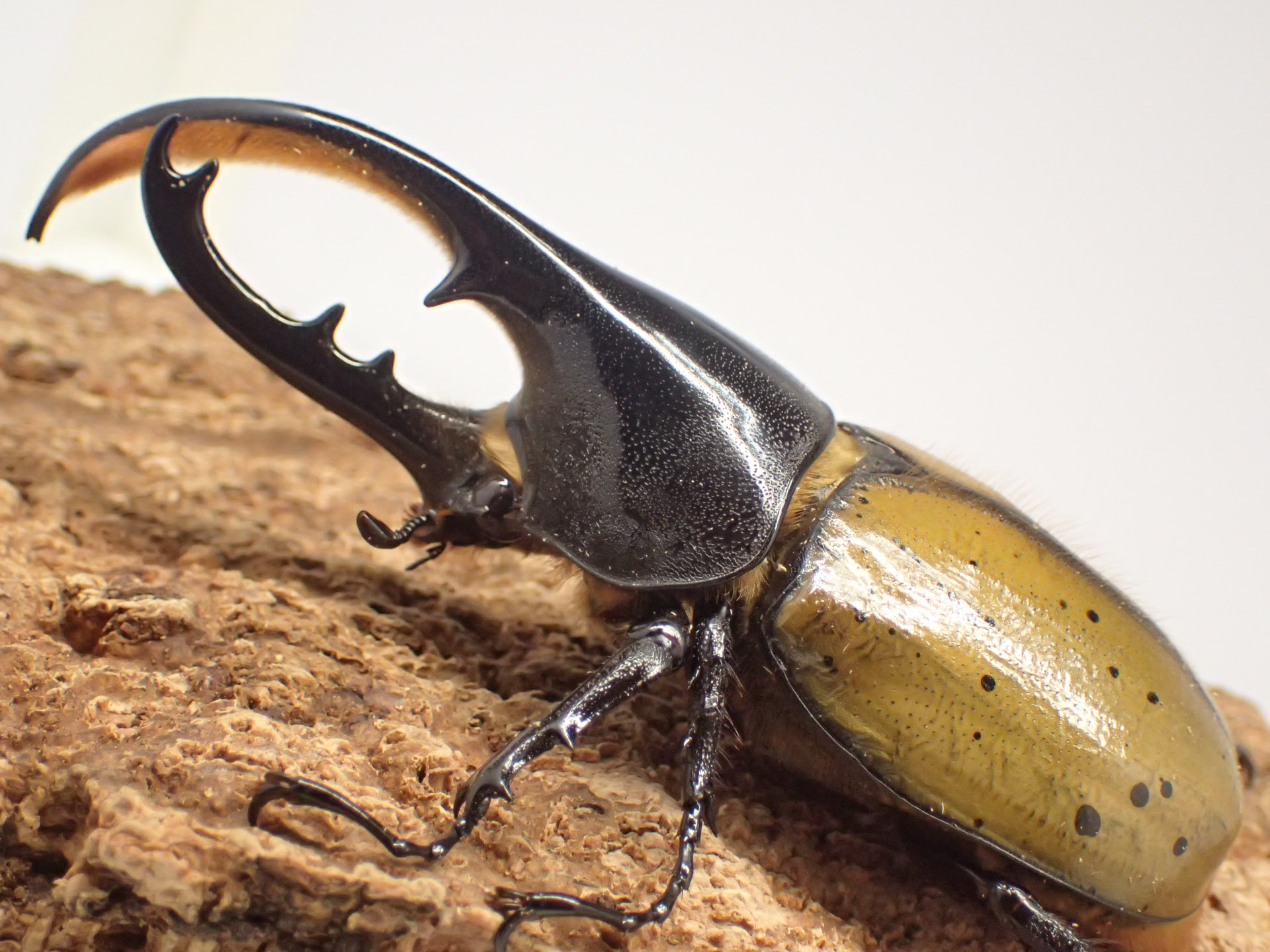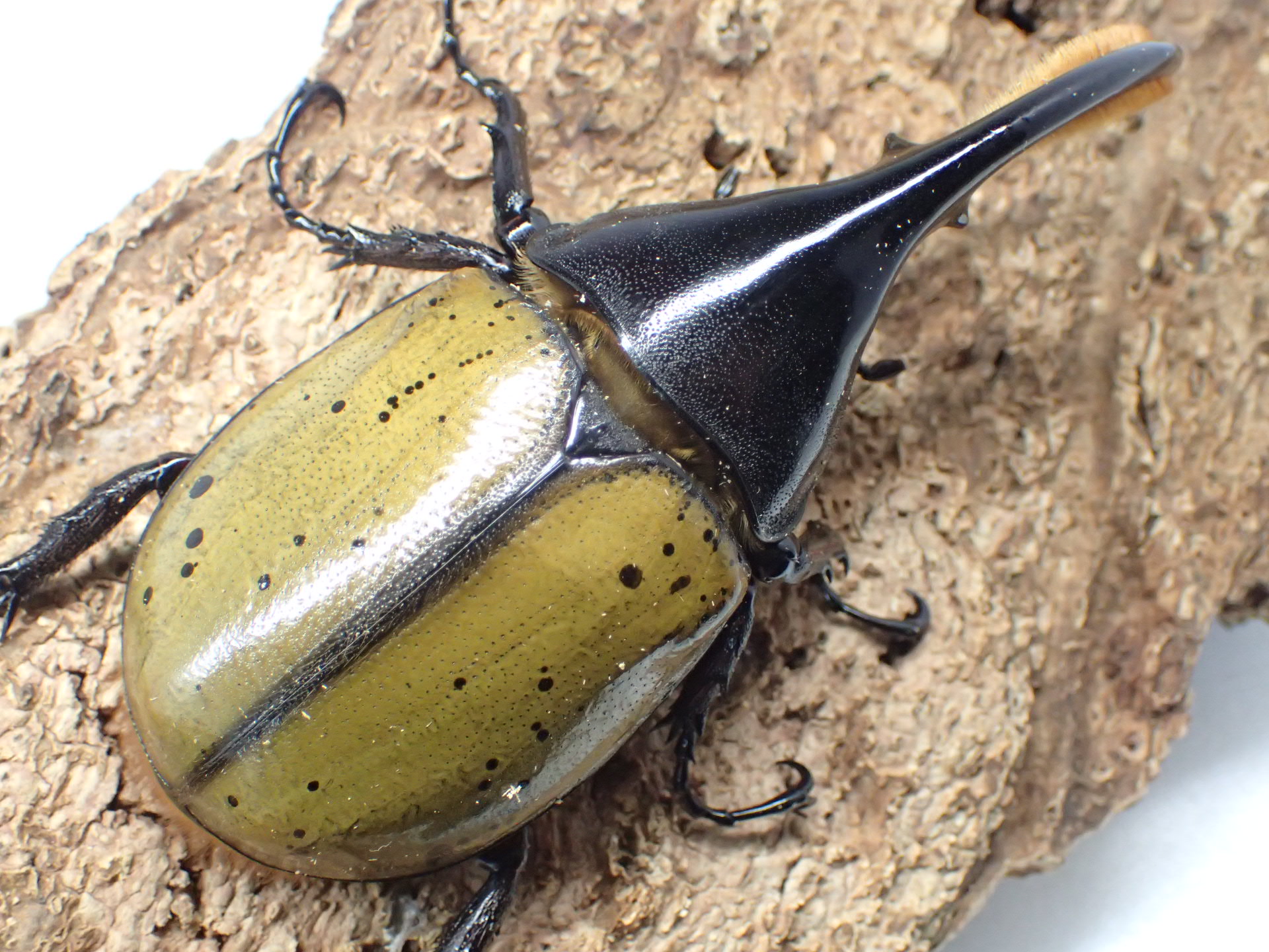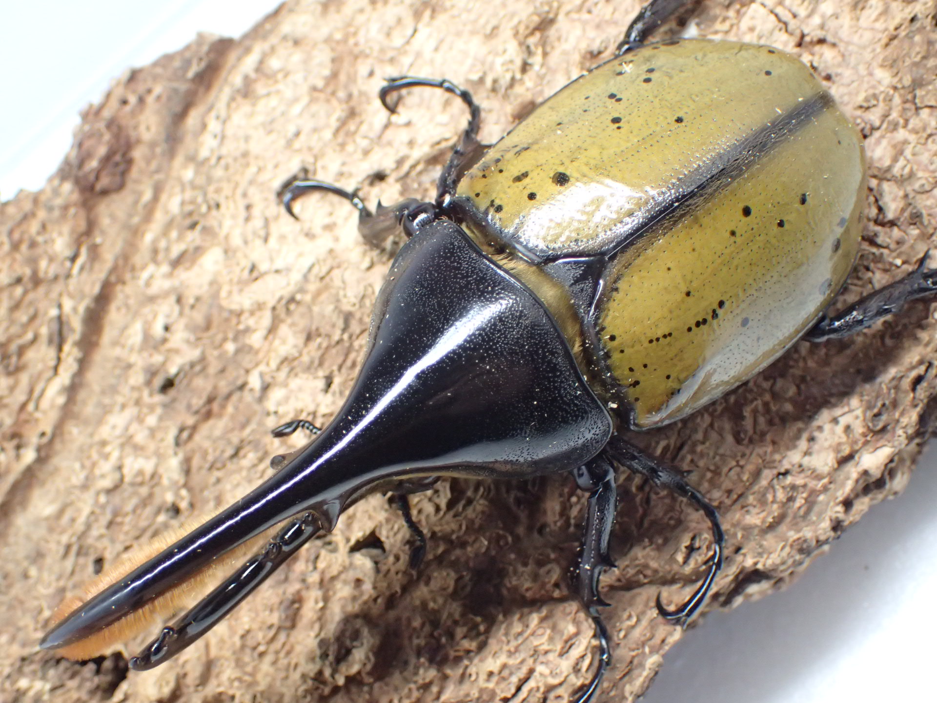 長い頭角と胸角をもち、黄色い上翅の世界最大のカブトムシ。