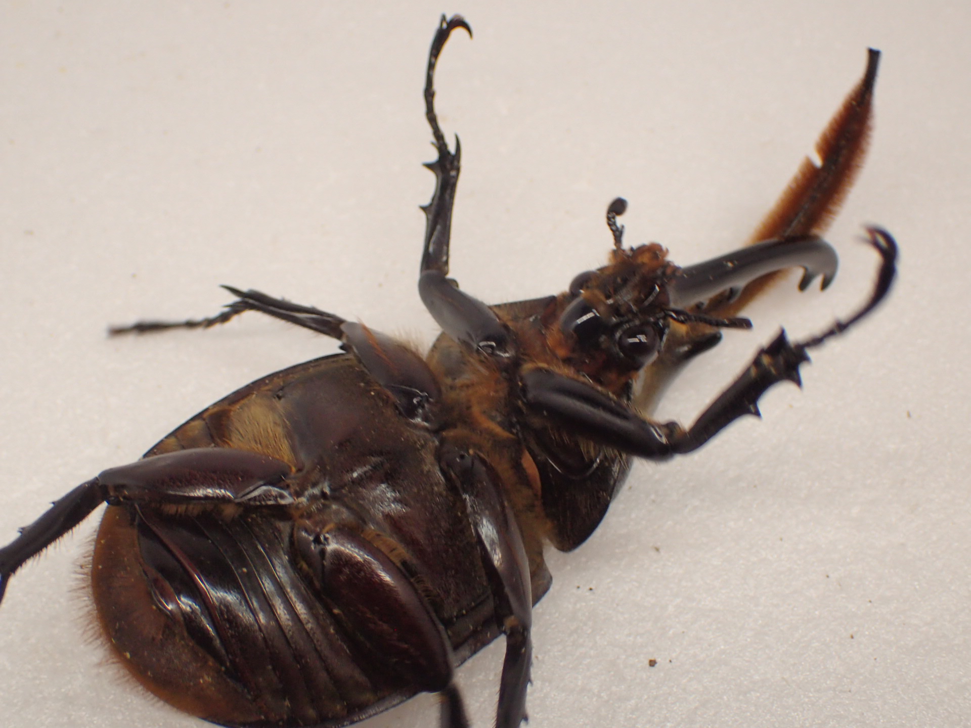 親個体の兄弟個体では、頭角先端の湾曲は弱く、頭角突起もはっきりと出現しており、胸角突起は中央より基部よりに出現しているので、リッキーよりもモリシマイ寄りの特徴が出ています。