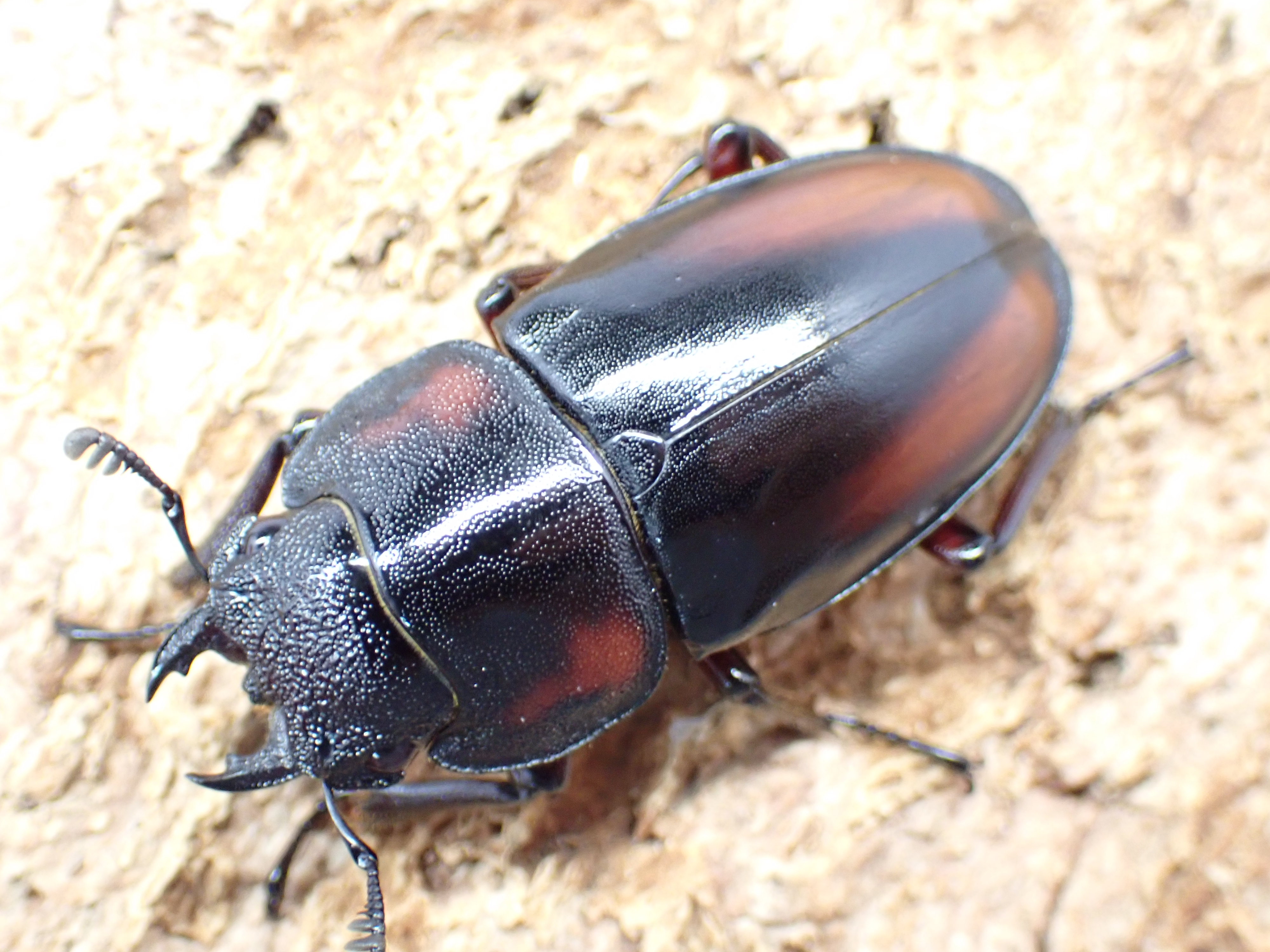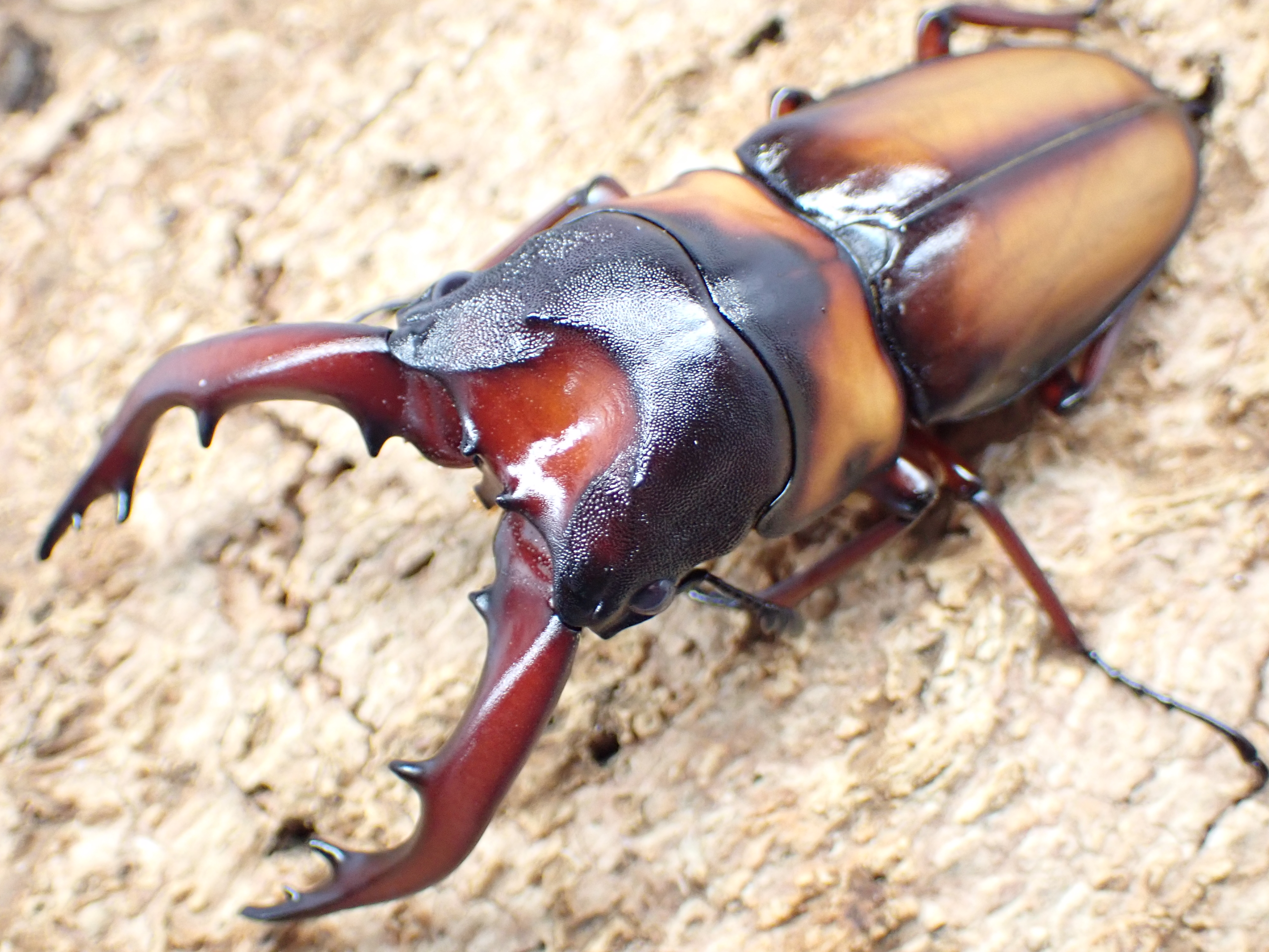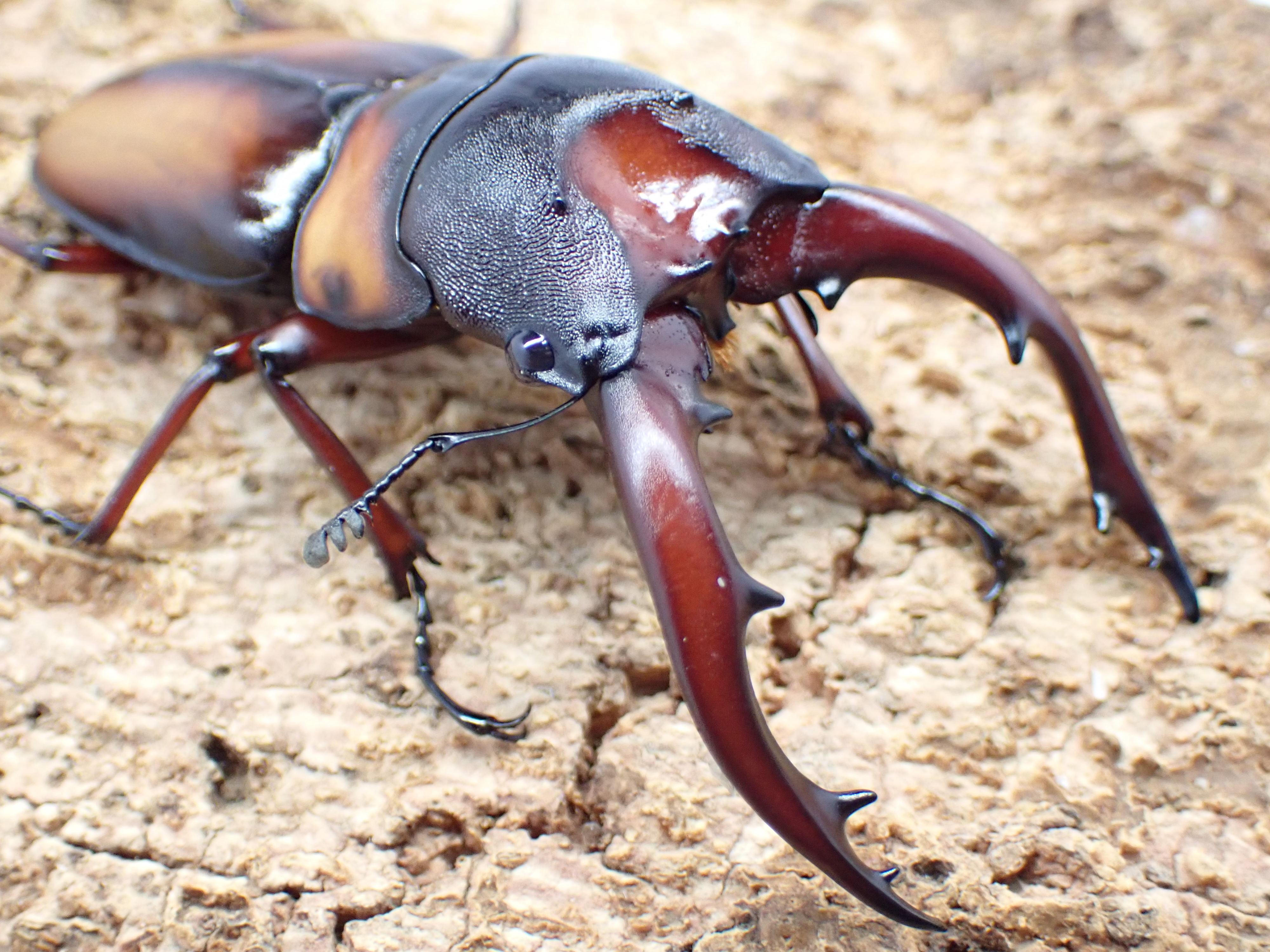 サバゲノコギリクワガタに似ていますが、頭部が大きく厚みがあり、中央部はU字状に深く陥没します。