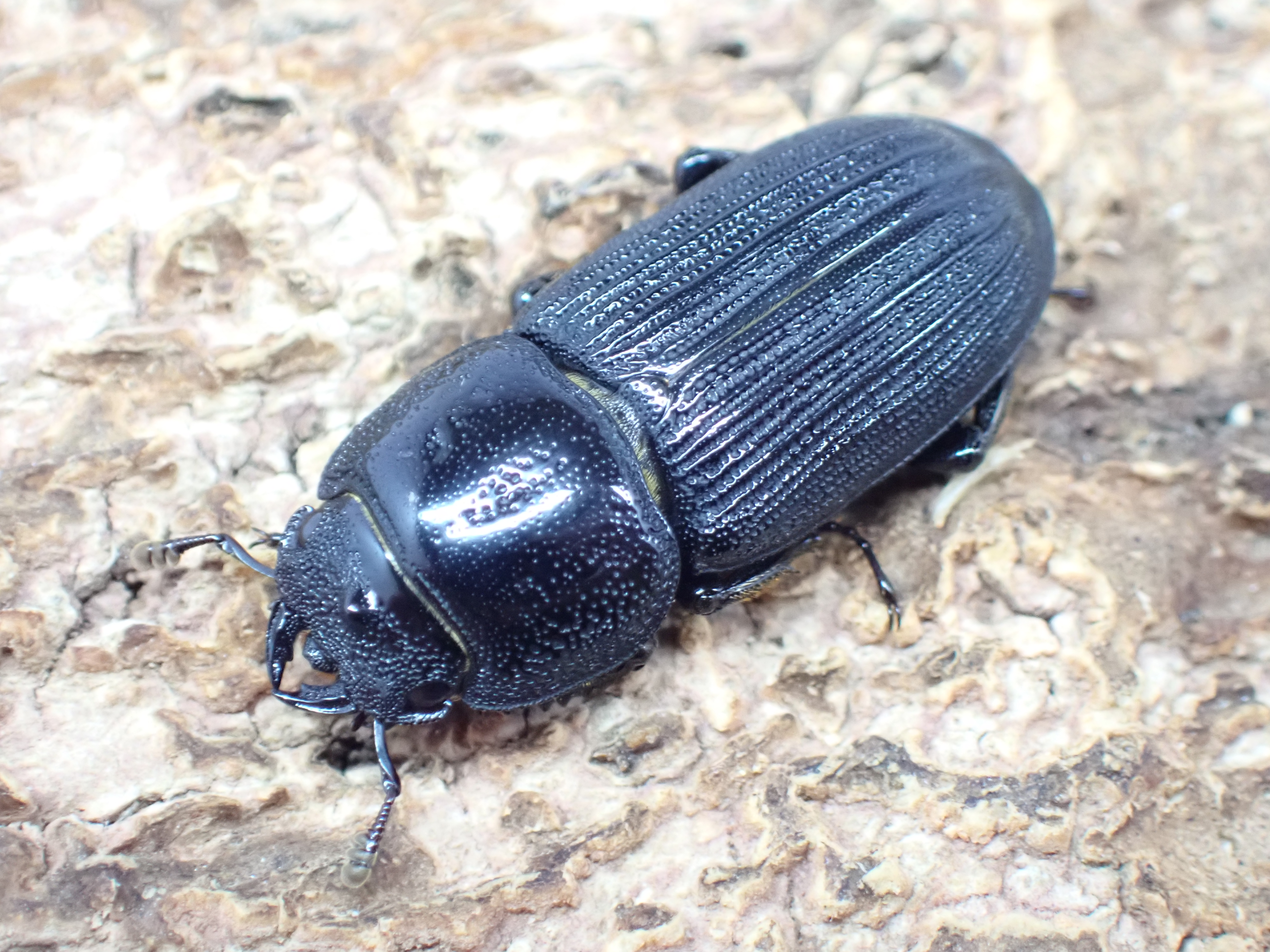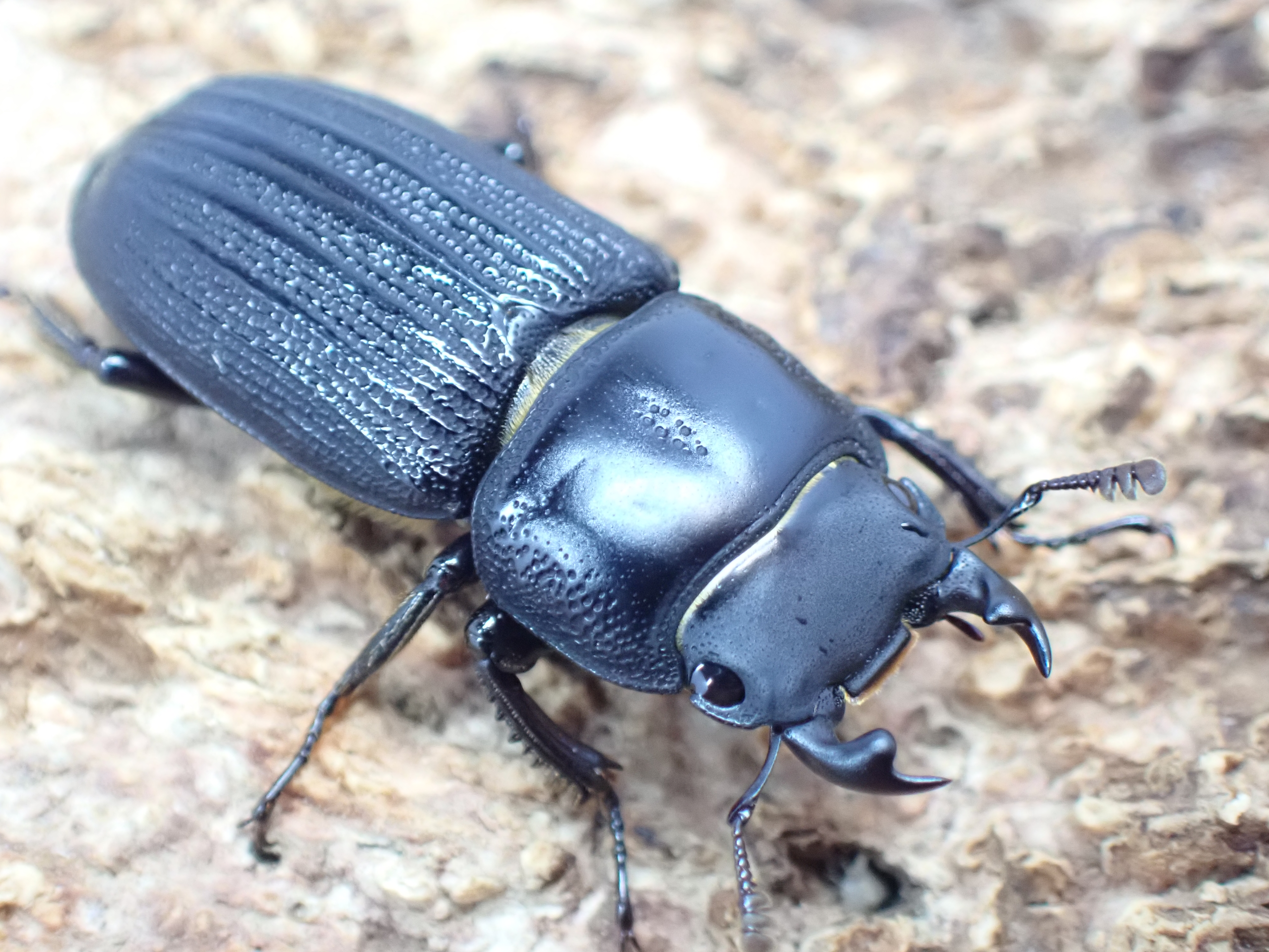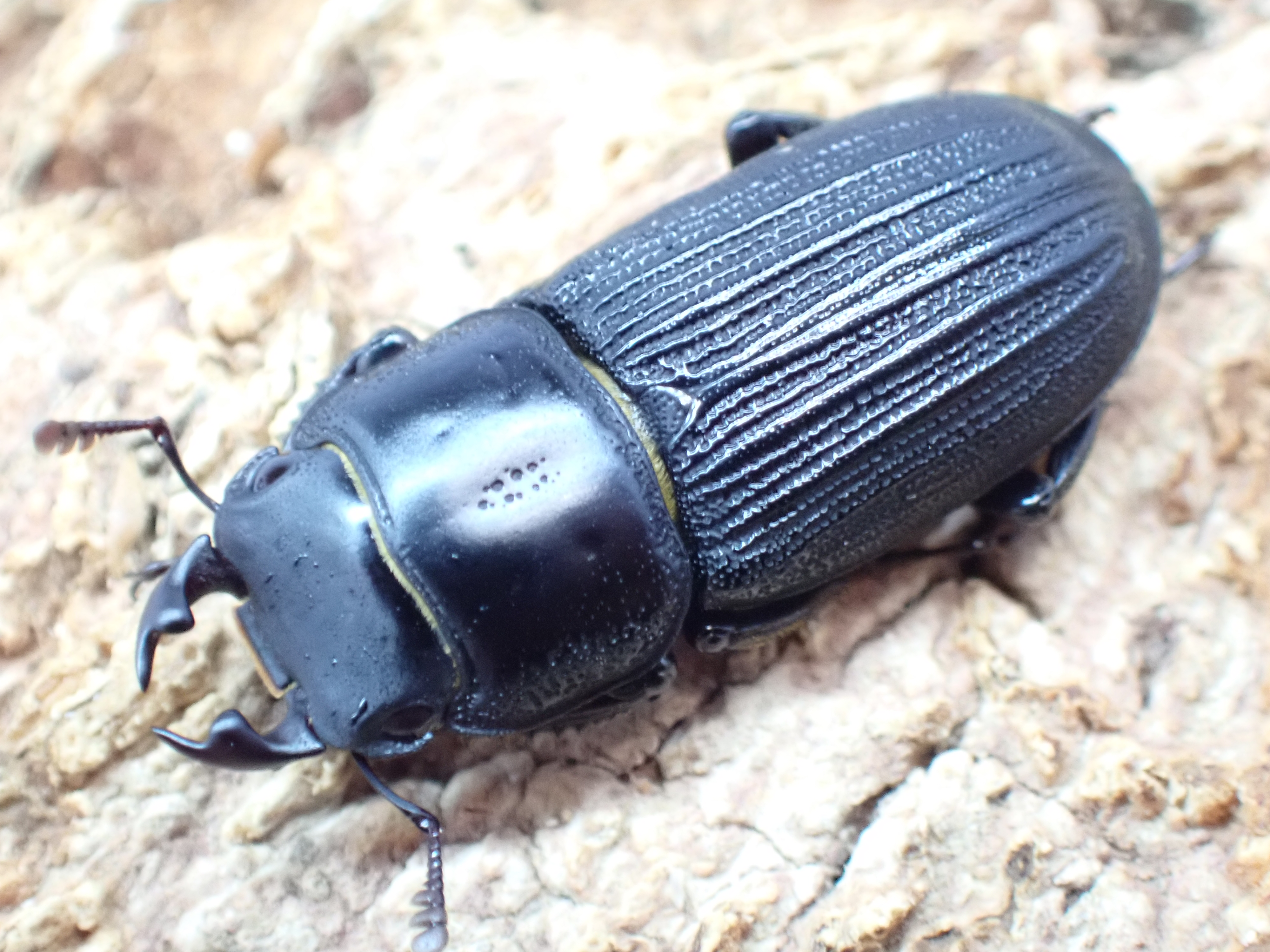 小型のオオクワガタで、雌雄ともに体は黒色で、上翅には3本の太い隆条がある特異な種です。