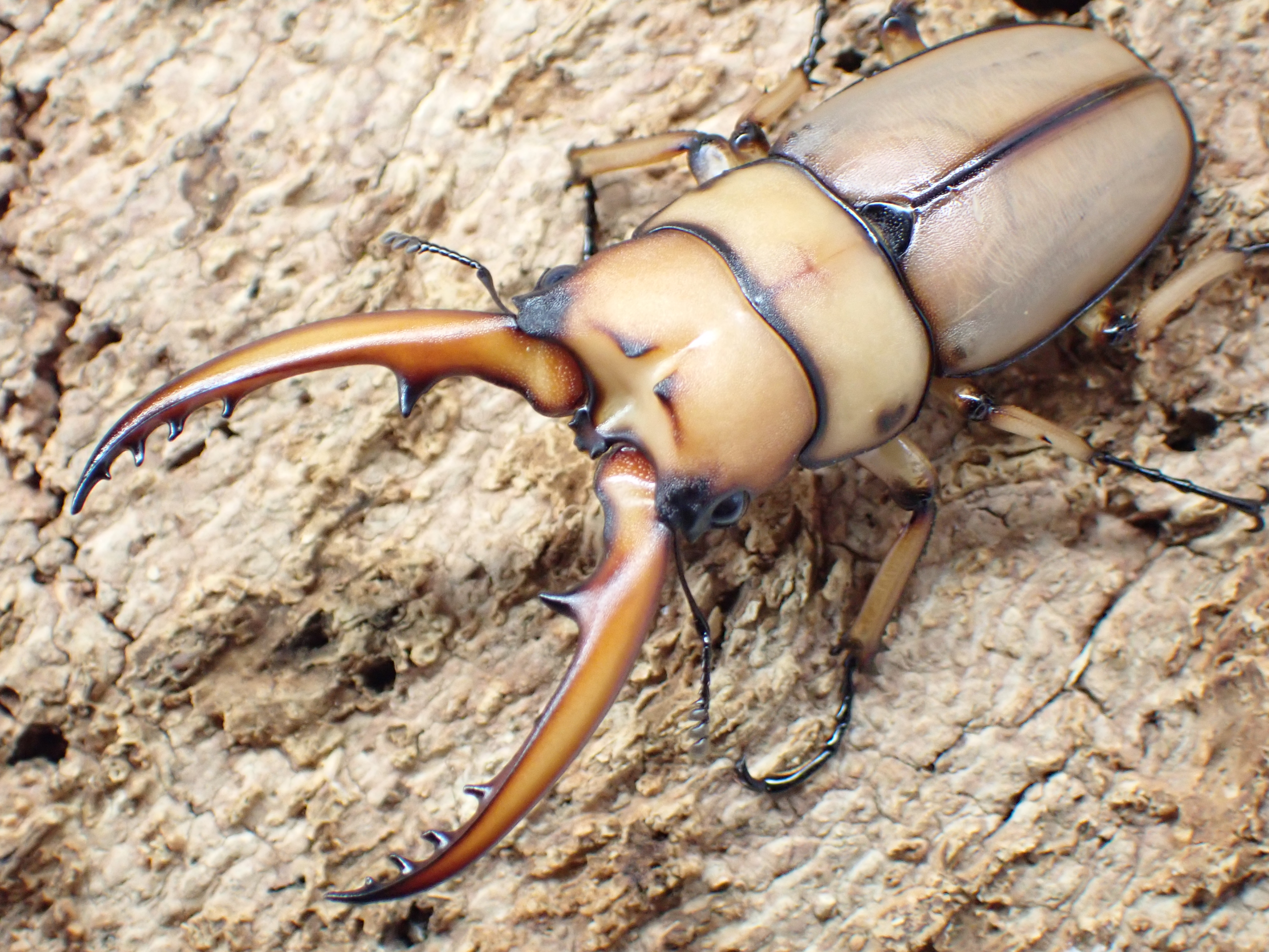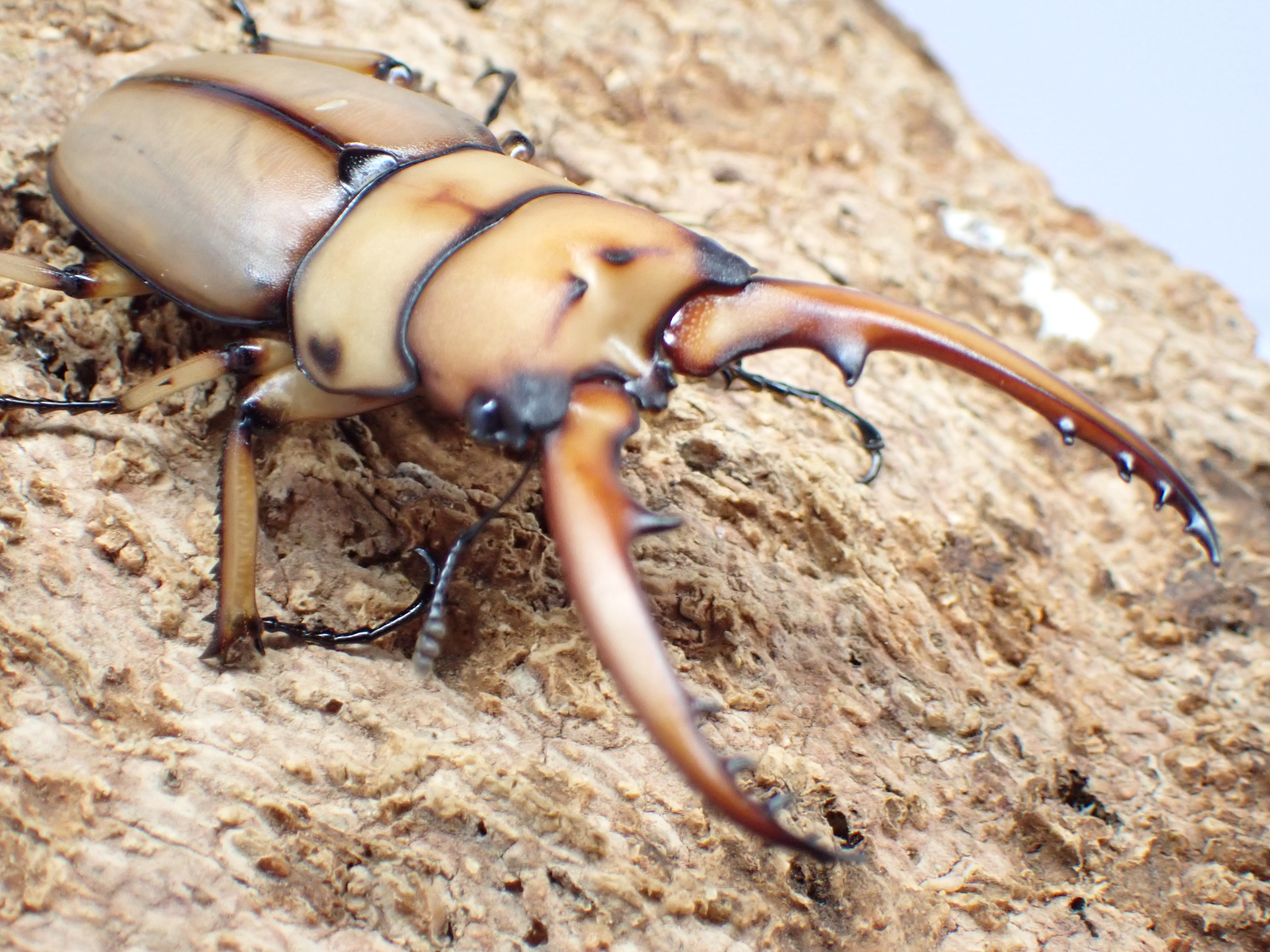大陸産はオスの大アゴが緩やかな弓状に湾曲し、特大個体では基部付近に大きな内歯が出ます。