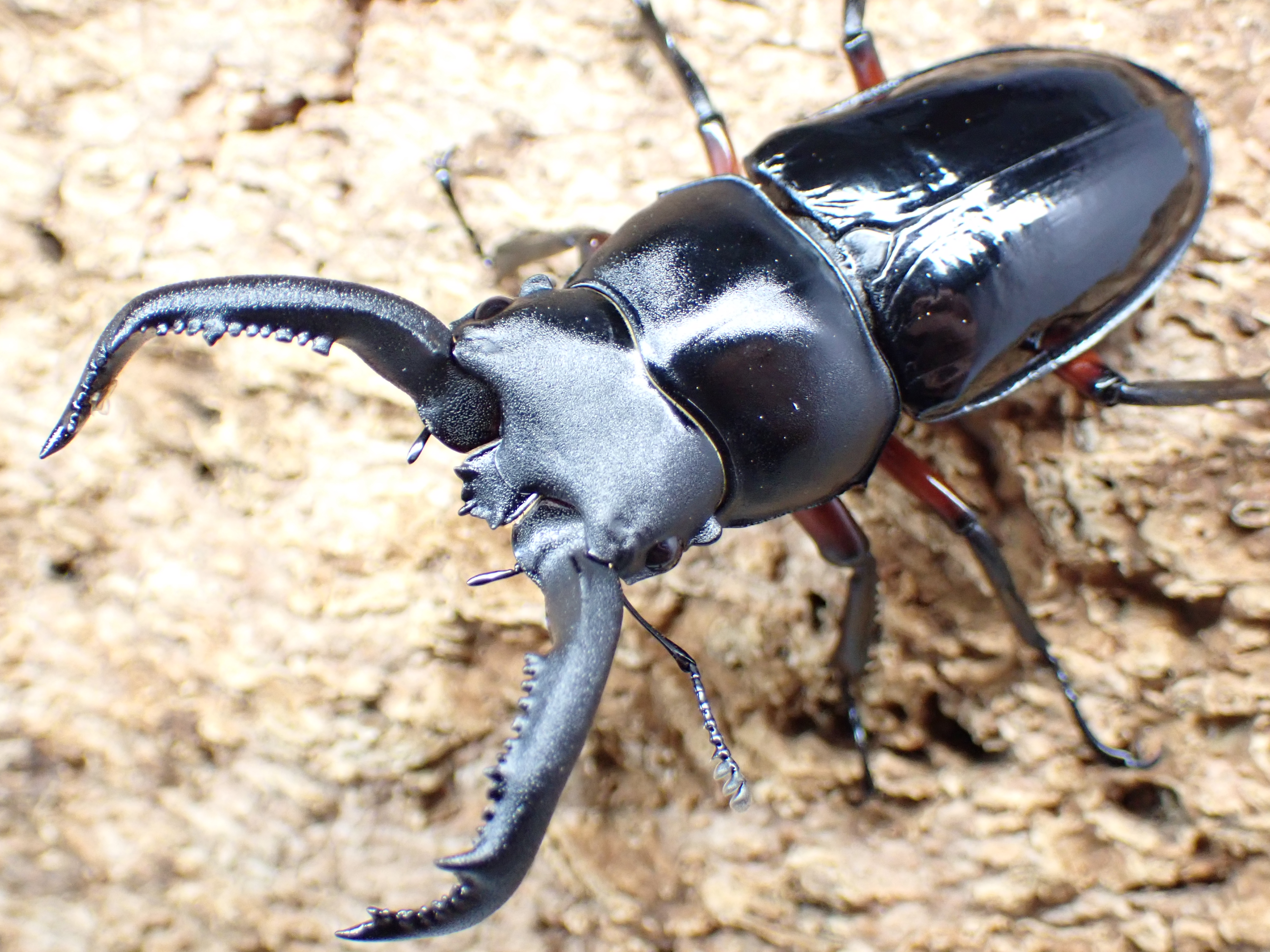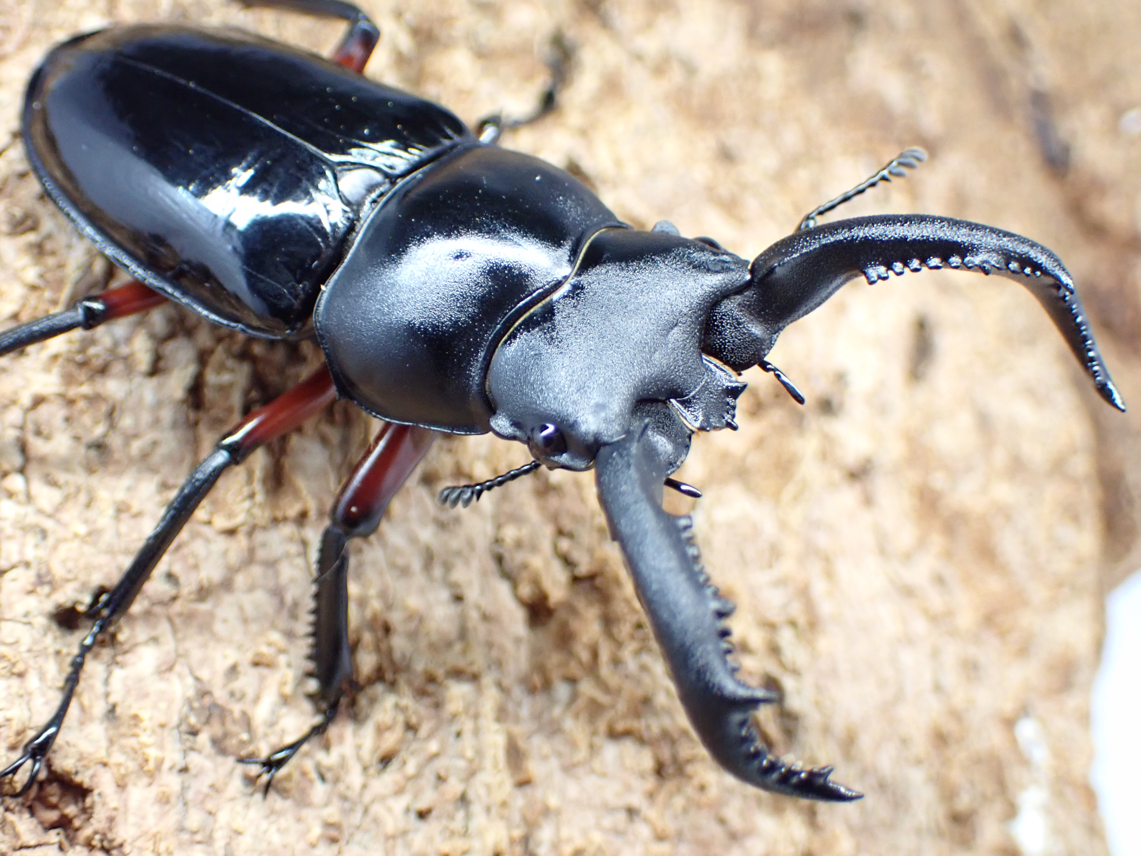 雌雄ともに黒色、腿節は赤味がかった褐色で、オスの大アゴ基部上面の内歯は小さく尖って上方を向きます。