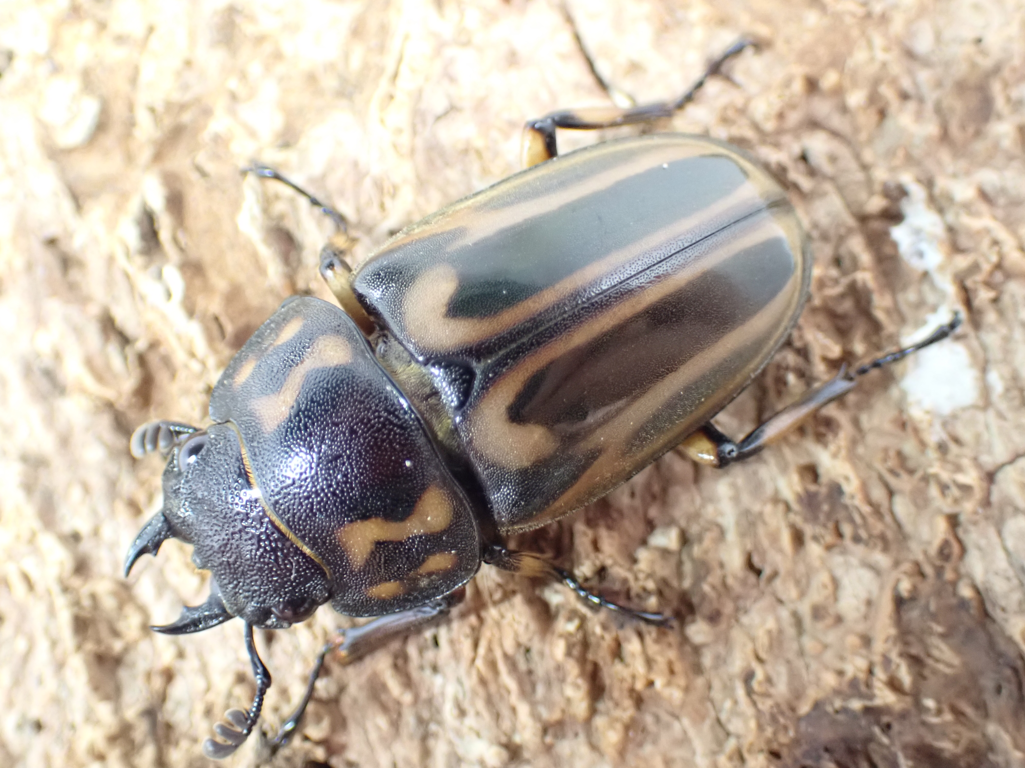 雌雄ともに大アゴと頭部は黒褐色~黒色で、前胸背板と上翅には中央部に縦長の黒色紋があり、側縁部や肩部にも幅広い黒帯があってシマウマ(zebra)のような縦模様にみえます。