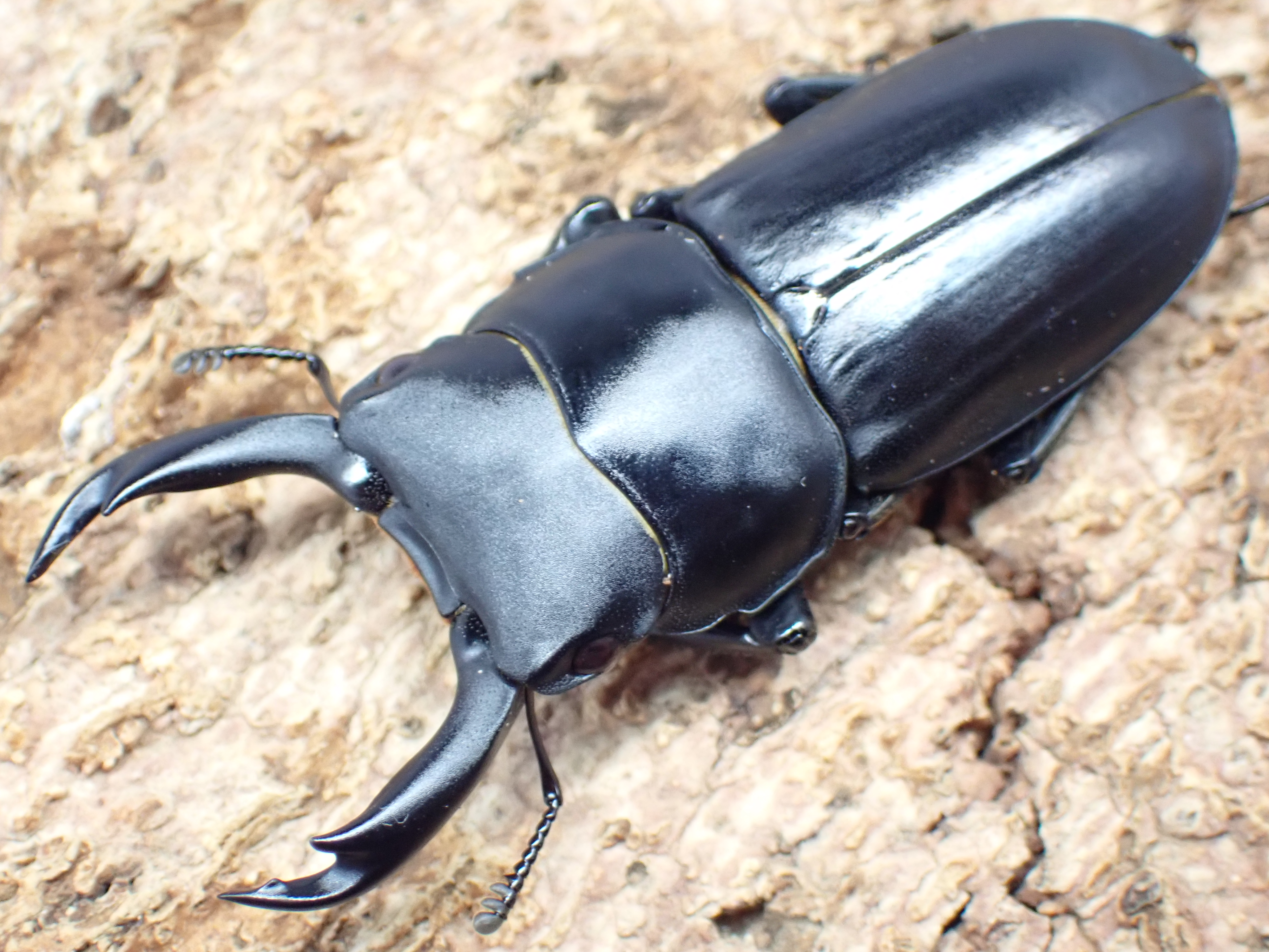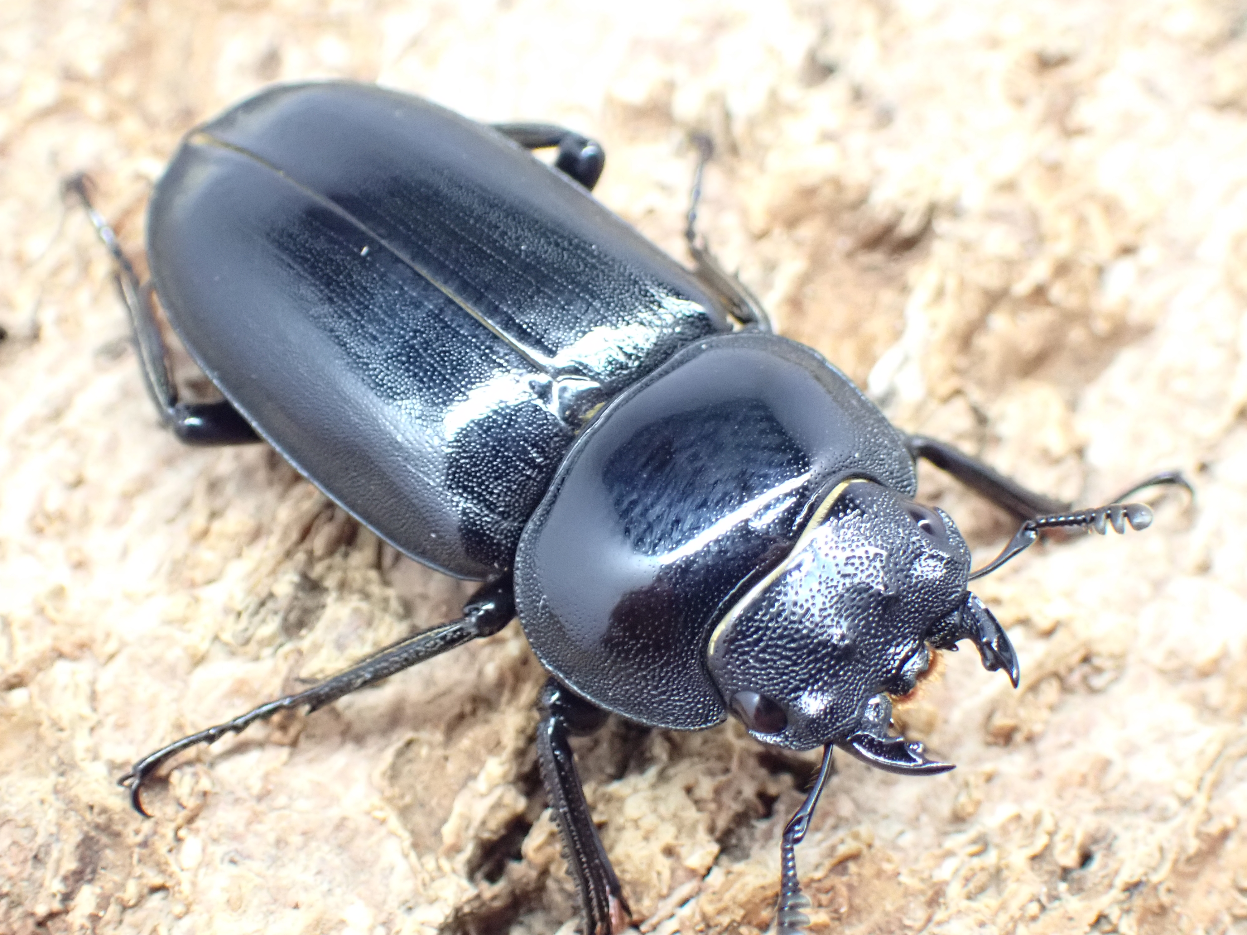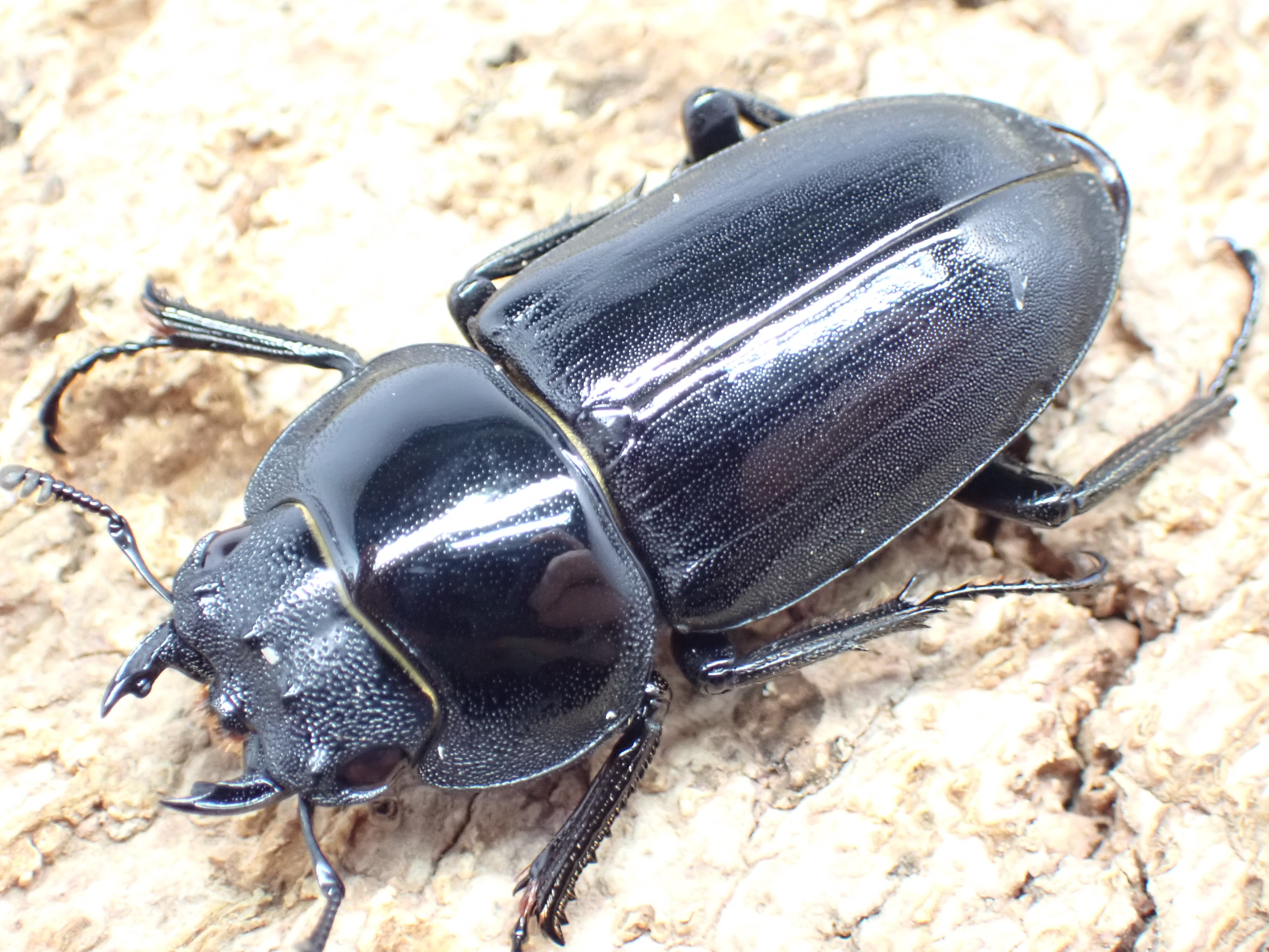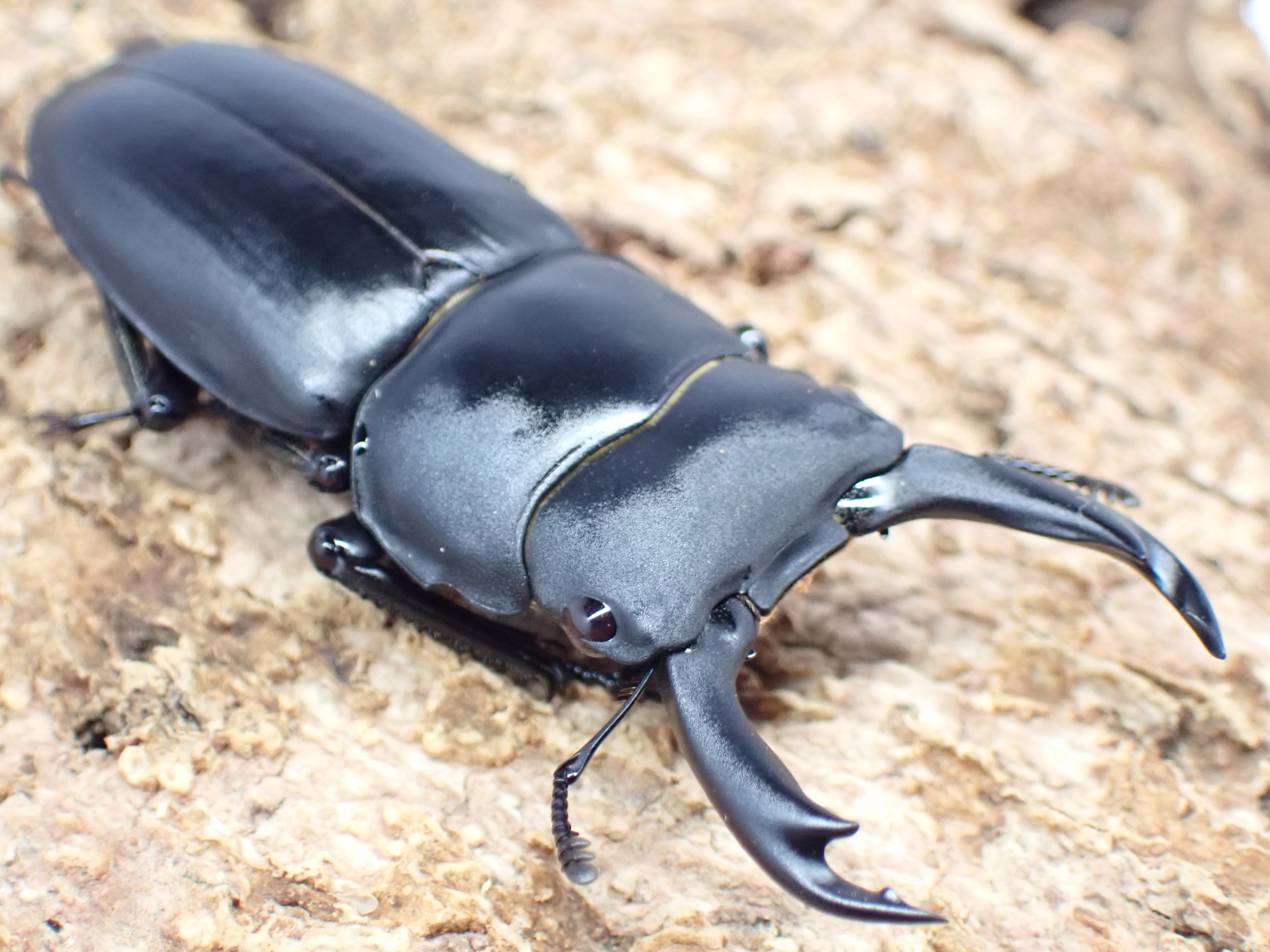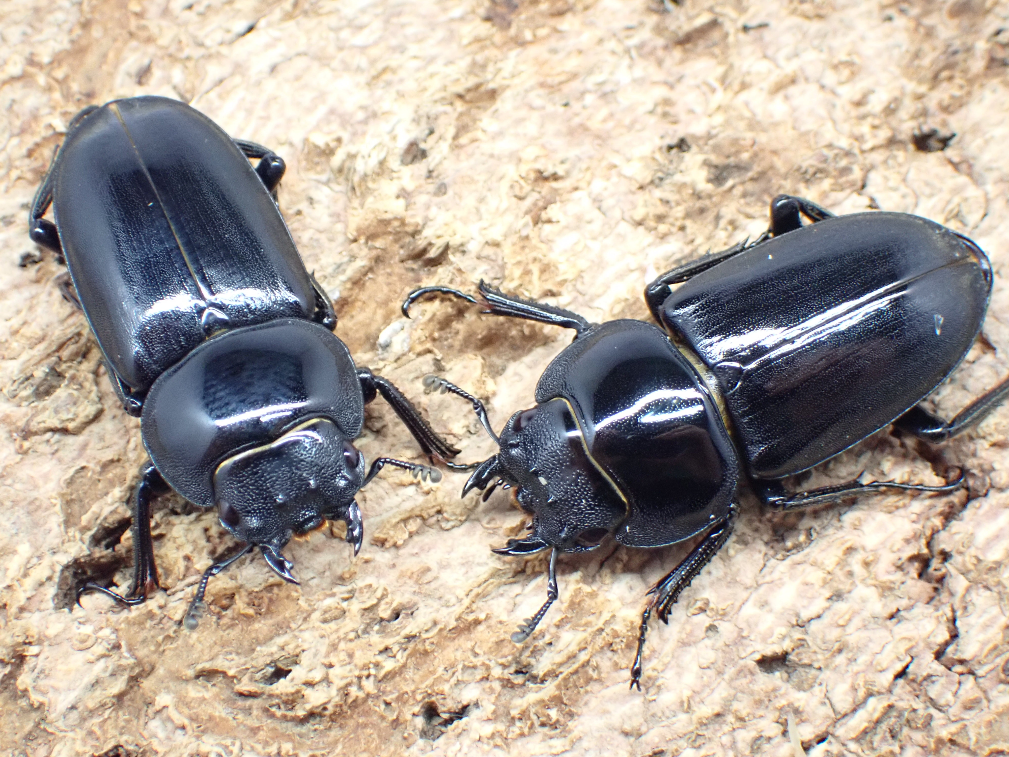 オスの体は黒色でやや平たく、鈍い光沢があります。