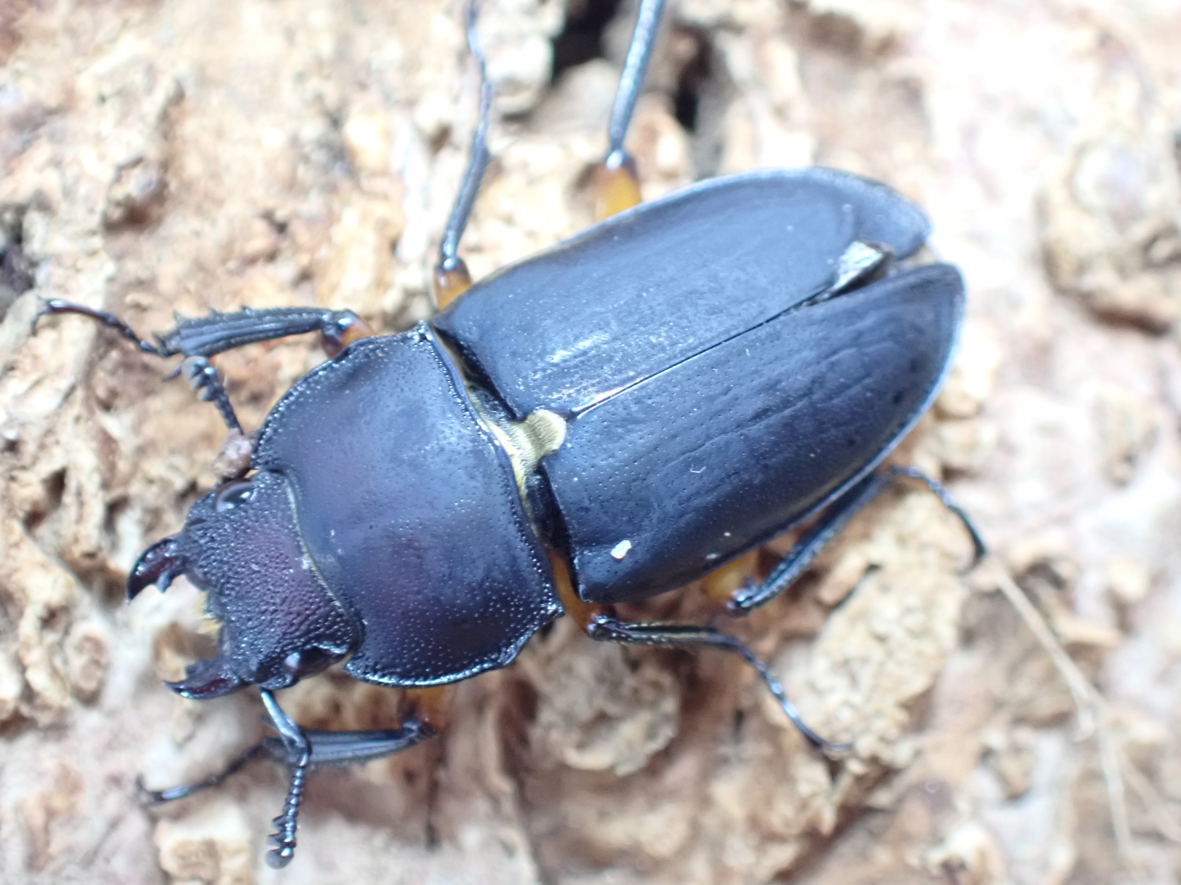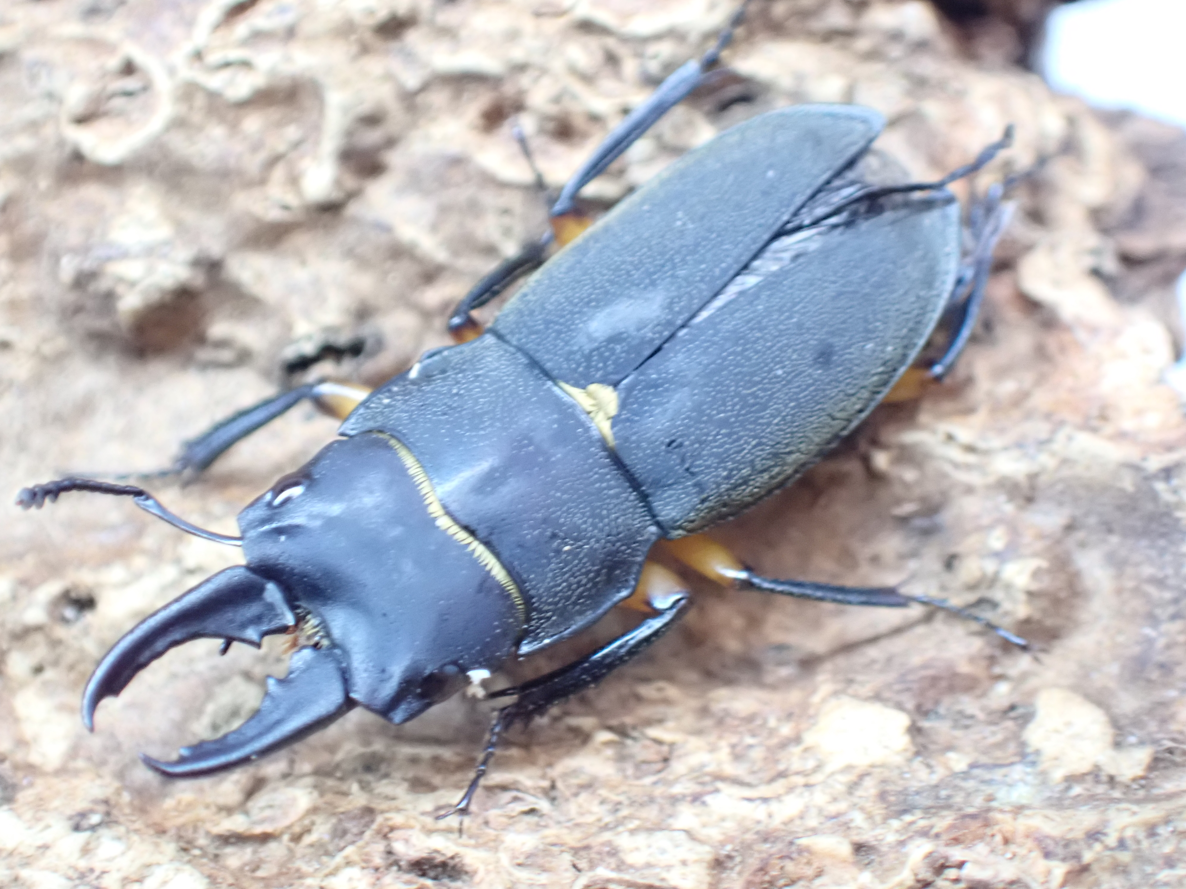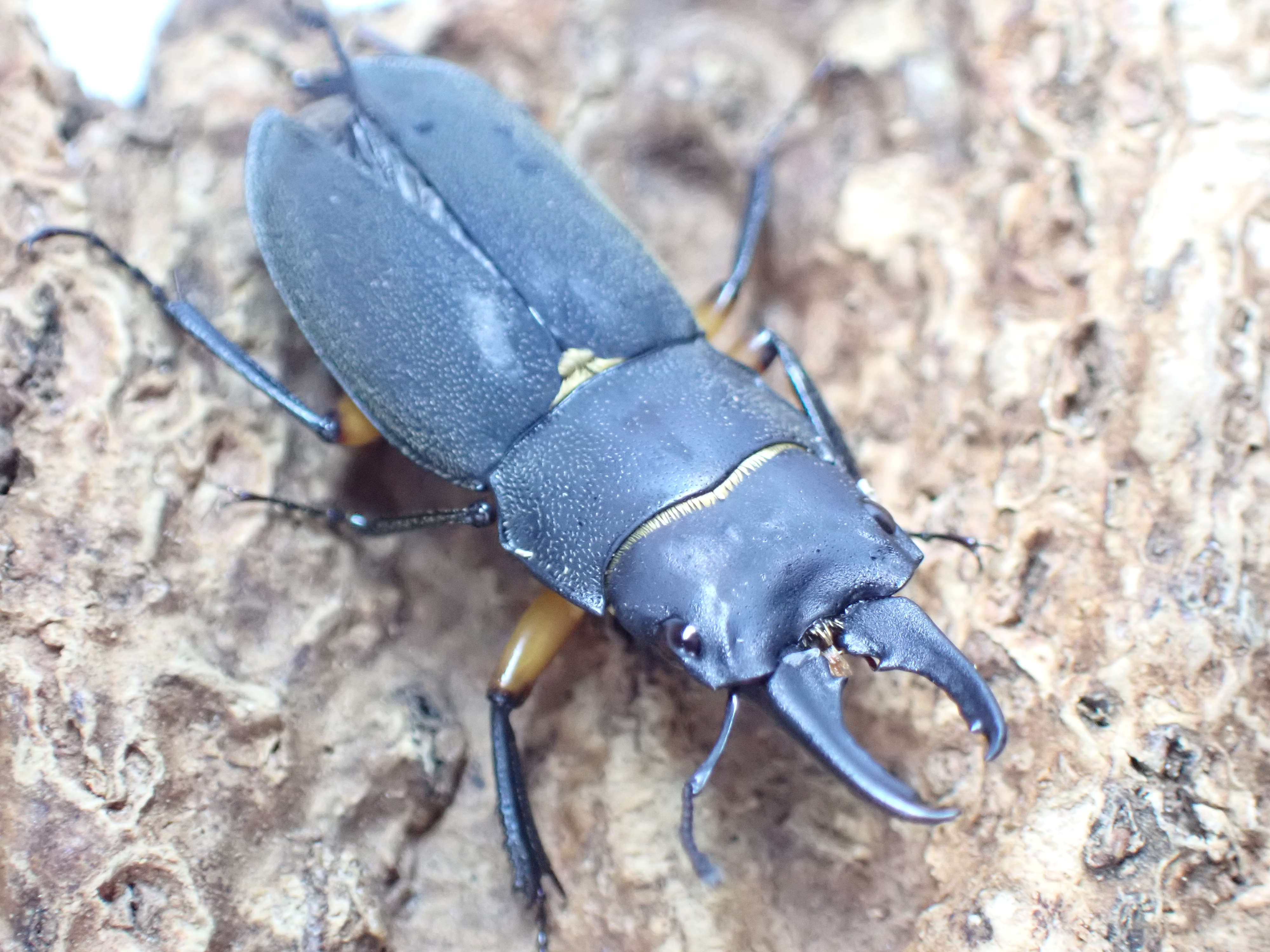 ティビアリスホソクワガタに似ていますが、体は細長く、ツヤ消し状の黒褐色で腿節のみが黄褐色をしています。