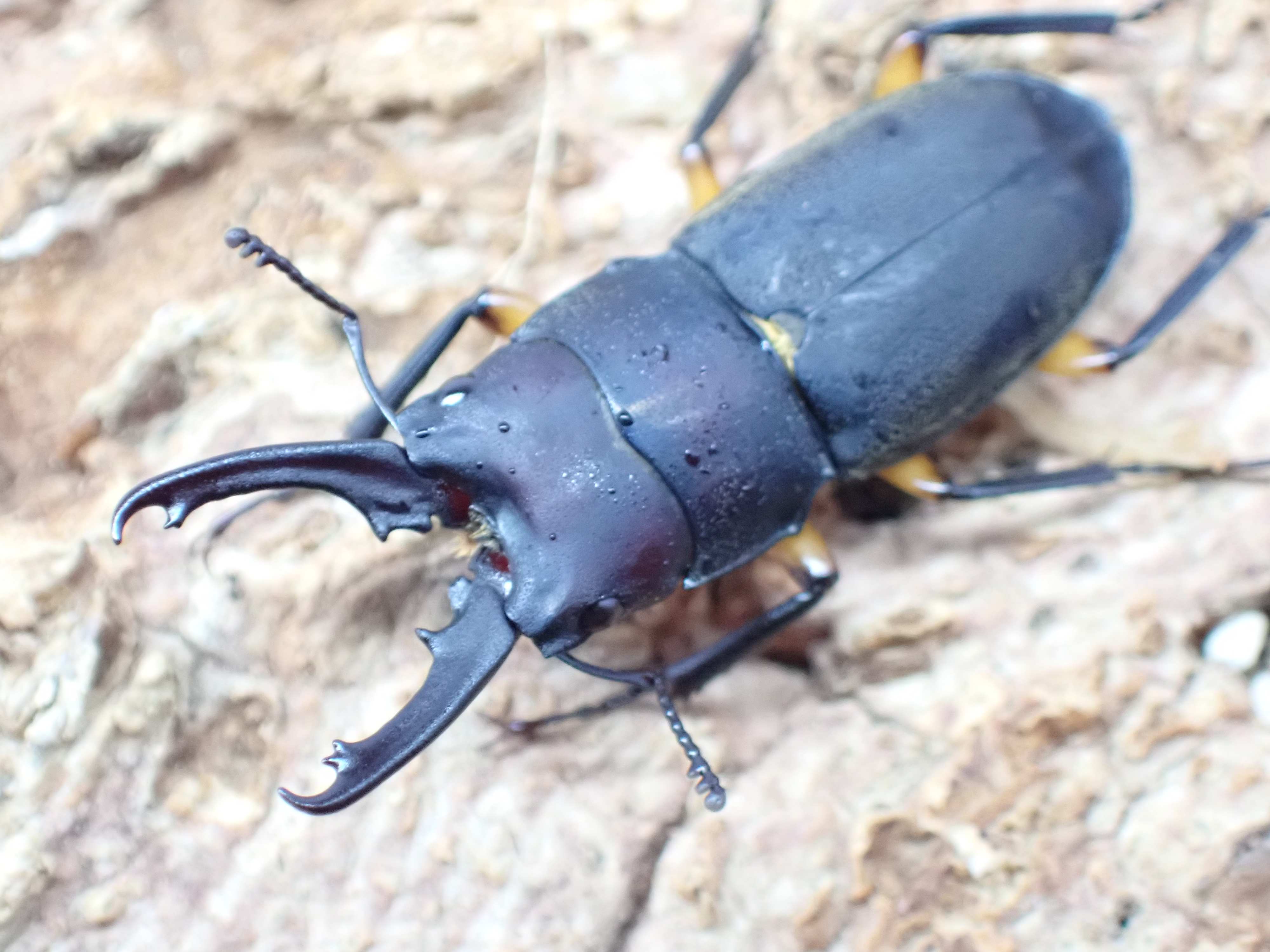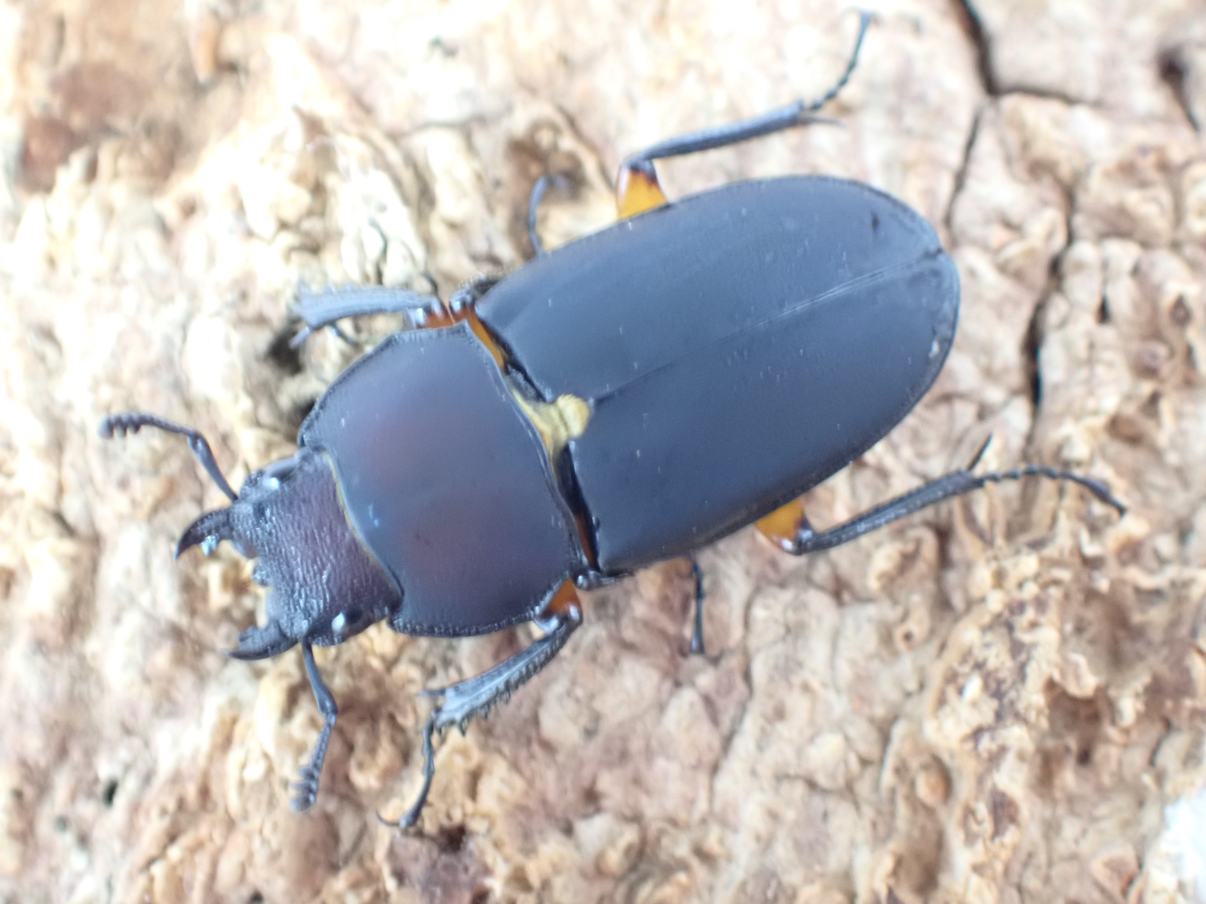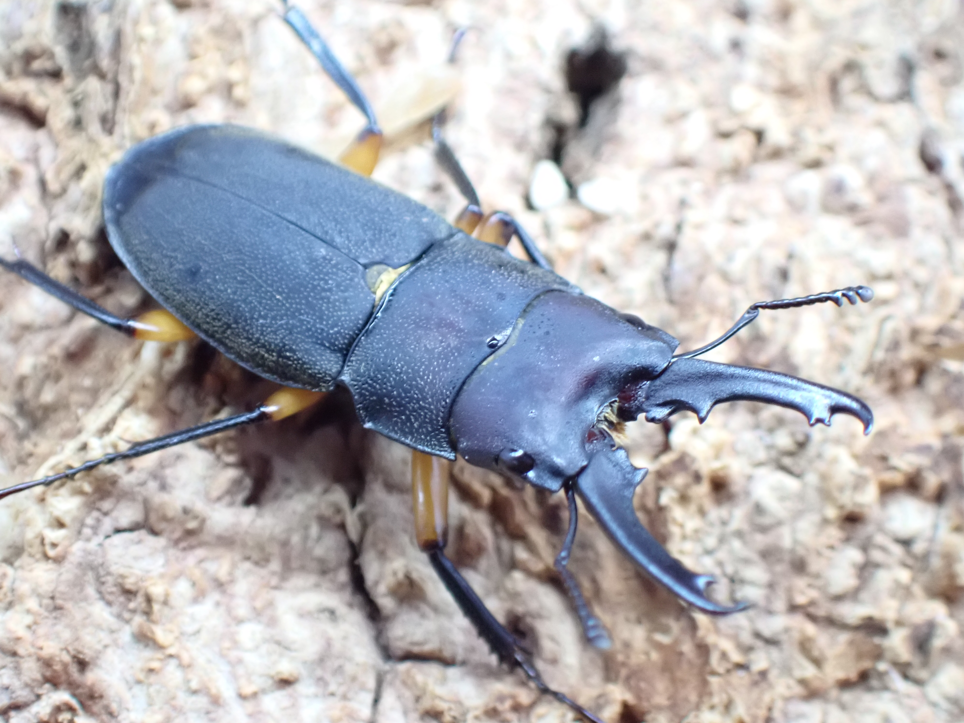 ティビアリスホソクワガタに似ていますが、体は細長く、ツヤ消し状の黒褐色で腿節のみが黄褐色をしています。