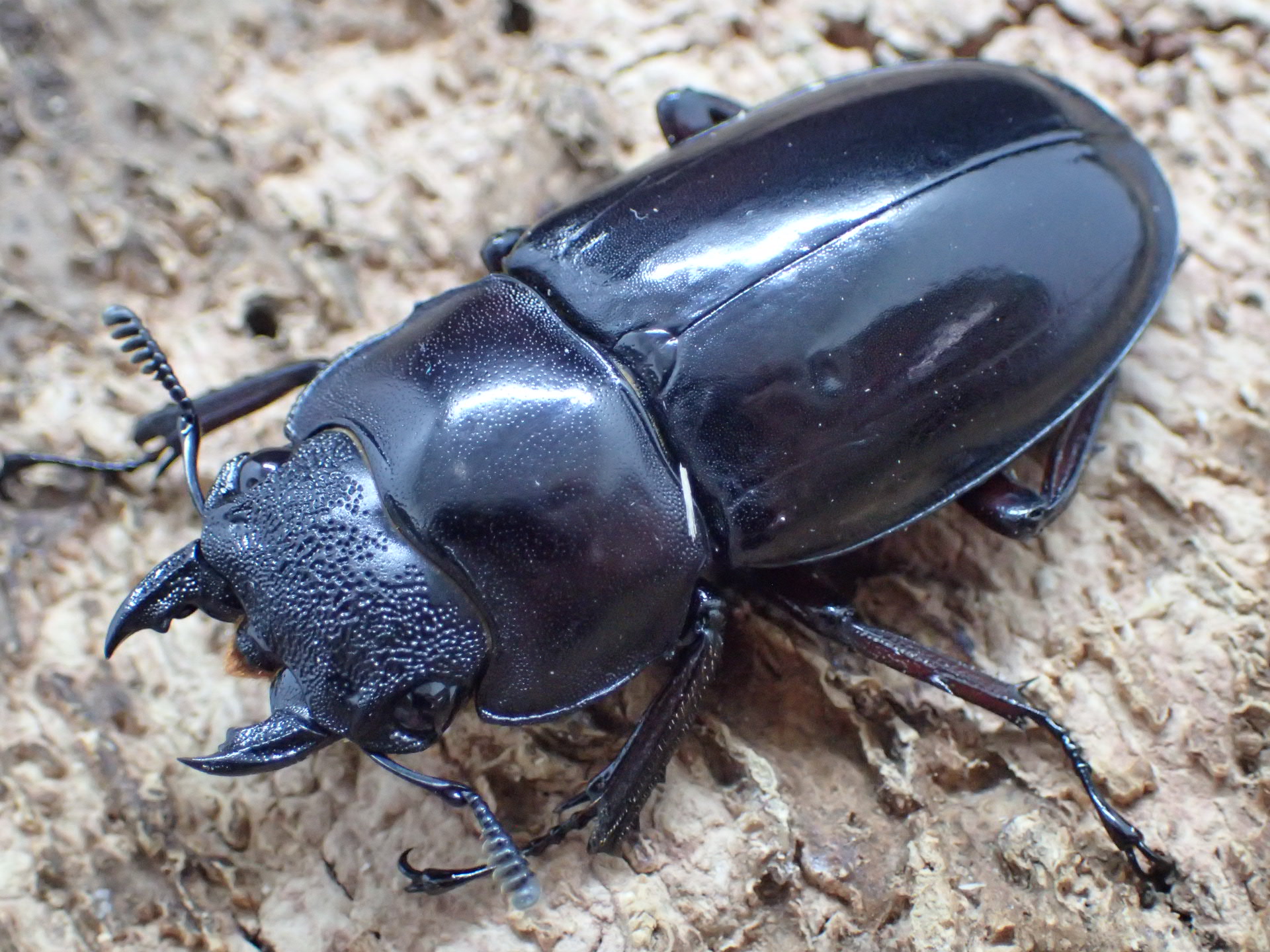 頭部中央が一対の大きなコブ状に隆起して、大アゴは太く、前方で強く湾曲して先端で大きく上下の二又に分かれます。