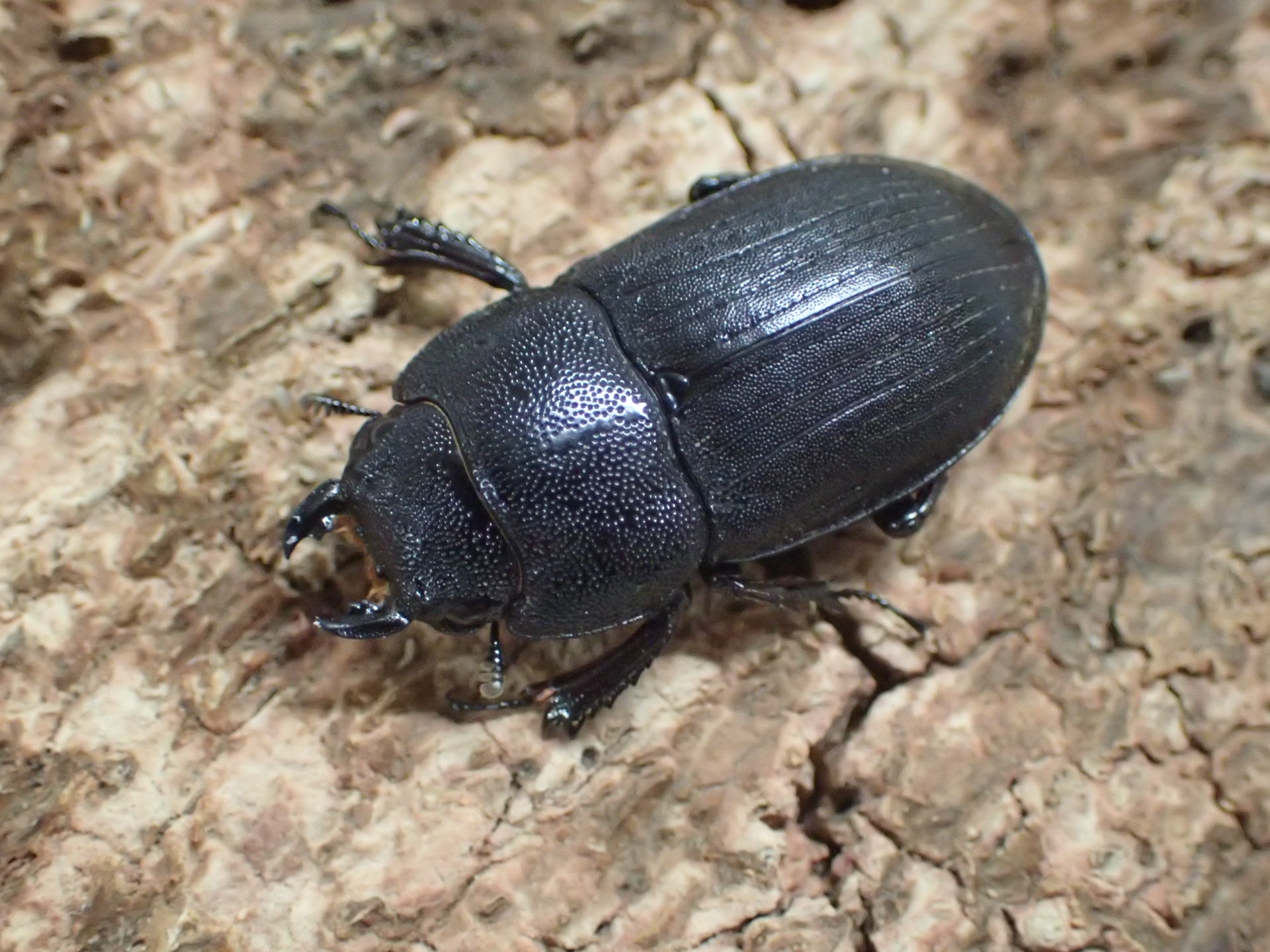 黒褐色で幅広いネブトクワガタで、オスは上翅に光沢がありメスはツヤ消し状をしています。