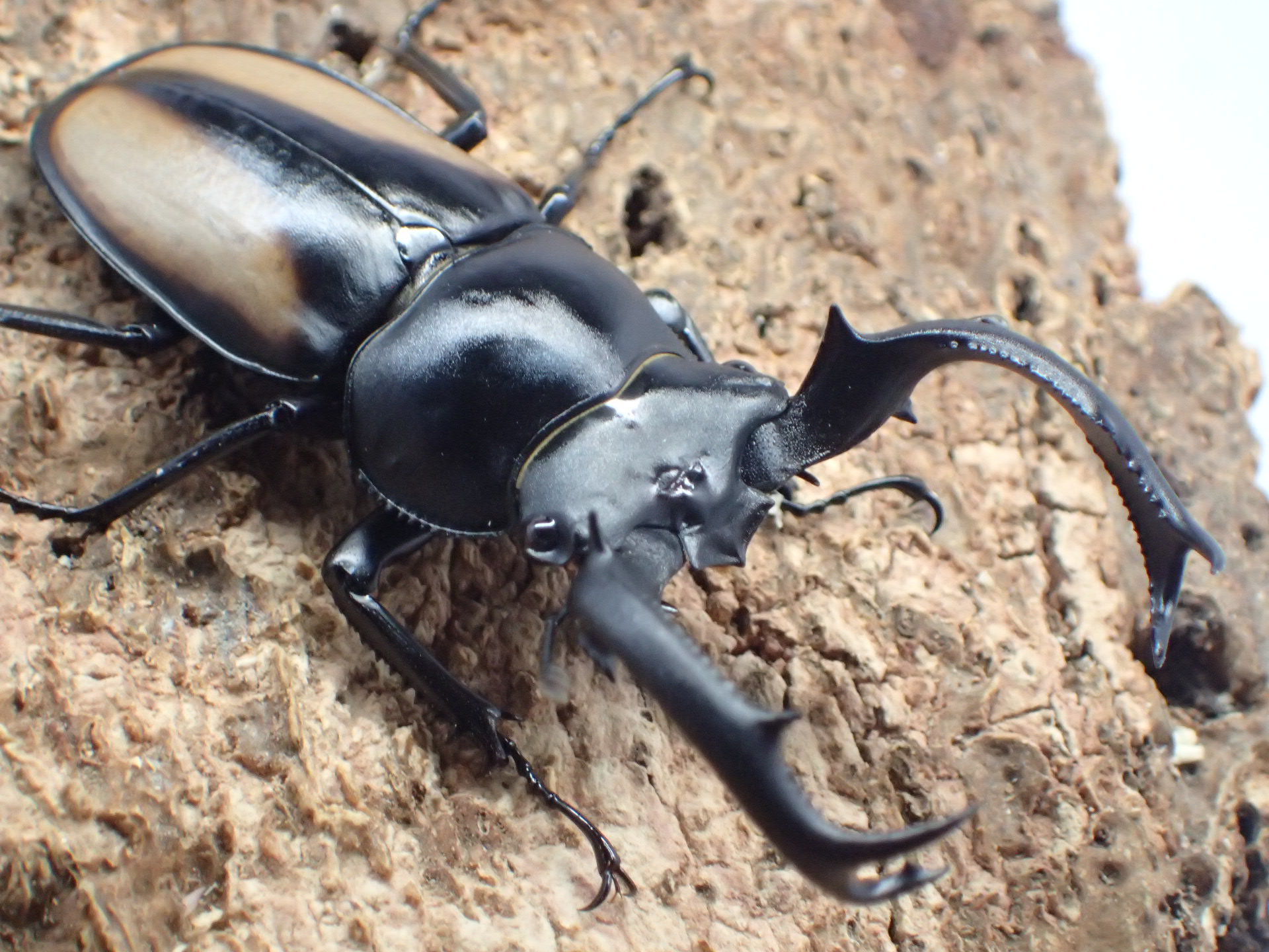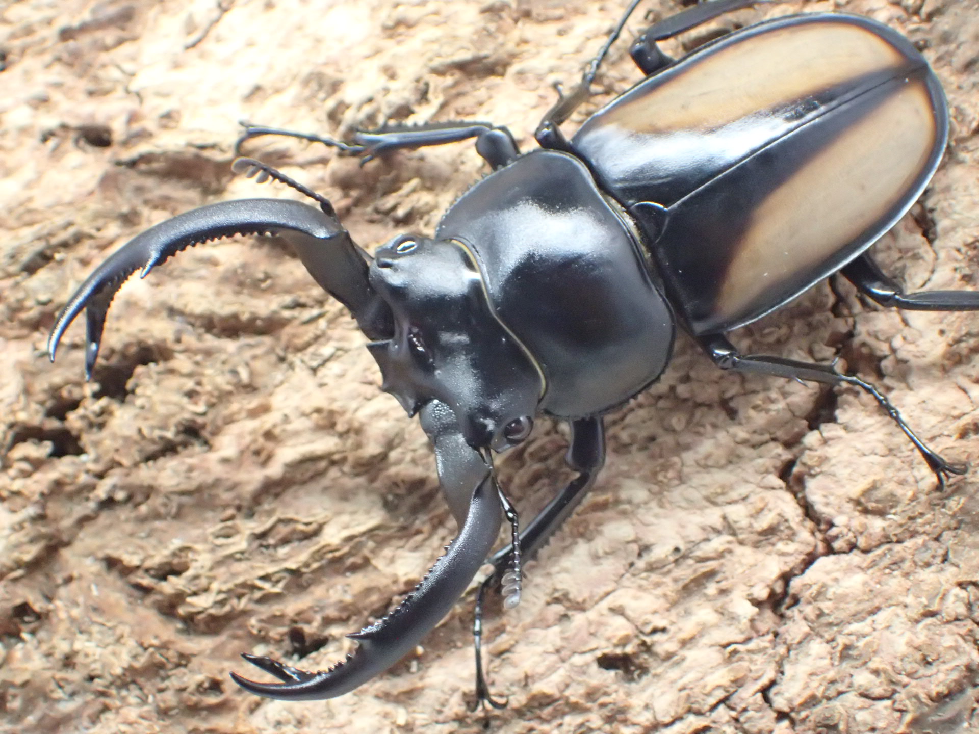 スペキオススシカクワガタに似ていますが、頭部と前胸背板が黒く、カワノシカクワガタにもよく似ていますが、大アゴと体がやや長く、前胸側縁の鋸歯が大きく、上翅の黒色部と褐色部の境界も明瞭になります。