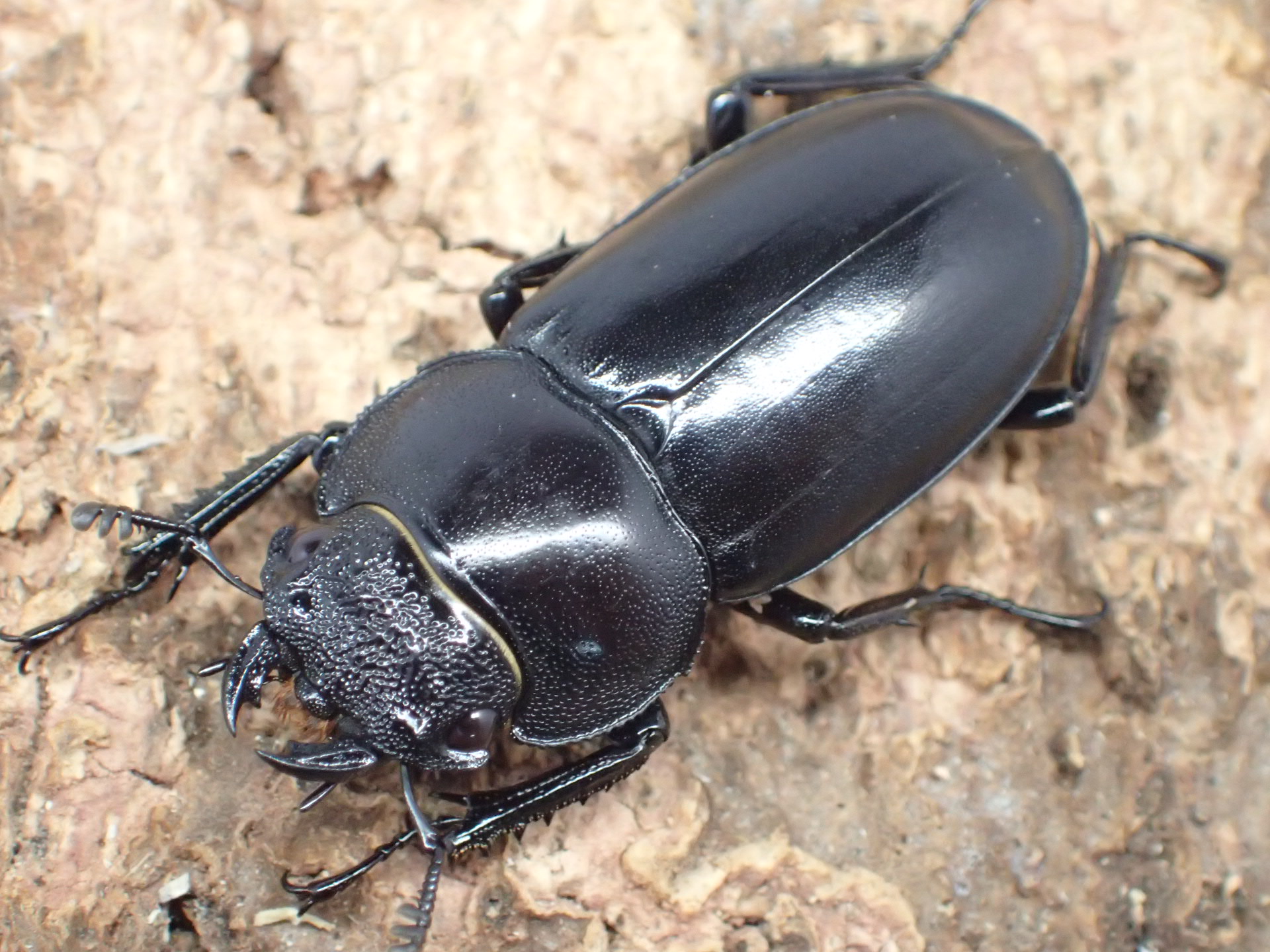 スペキオススシカクワガタに似ていますが、頭部と前胸背板が黒く、カワノシカクワガタにもよく似ていますが、大アゴと体がやや長く、前胸側縁の鋸歯が大きく、上翅の黒色部と褐色部の境界も明瞭になります。