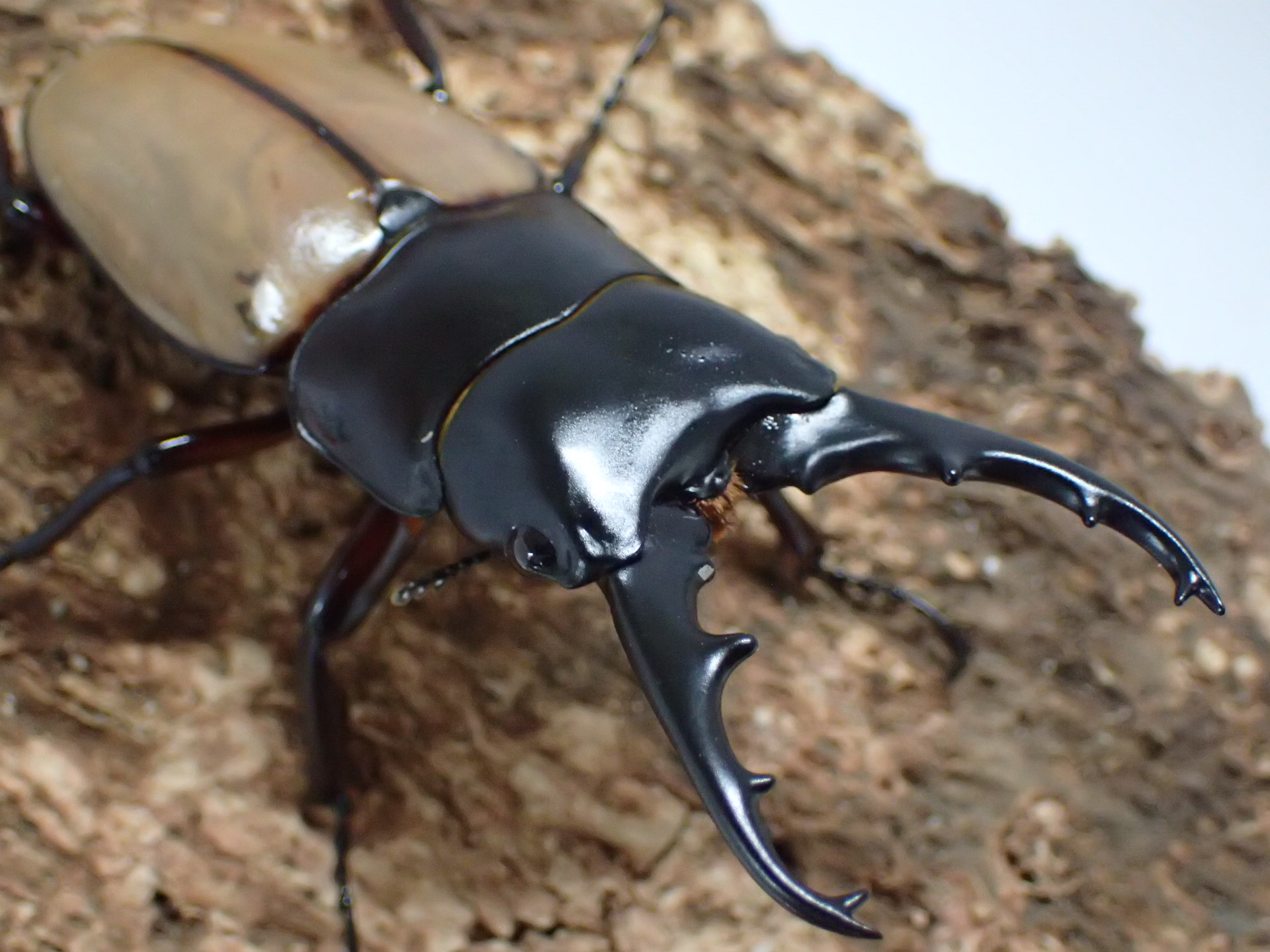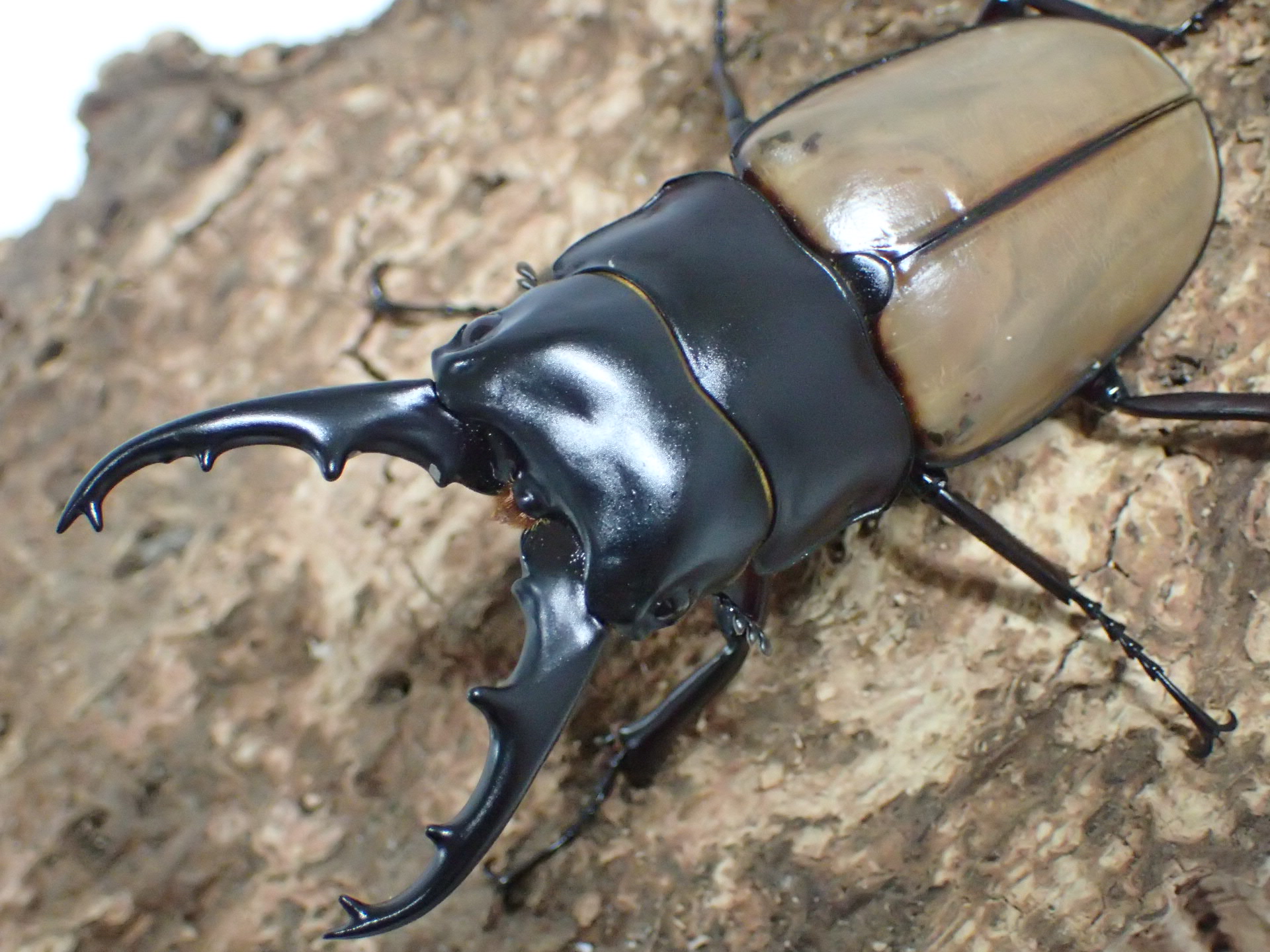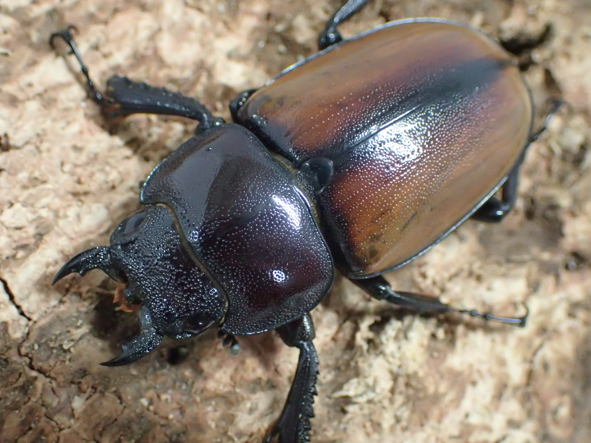 大アゴ・頭部・前胸背板・脚は黒色で、上翅は黄色味がかった明るい褐色で、会合部で細い帯状に黒化して、境界部でぼやける美しい色味をしています。