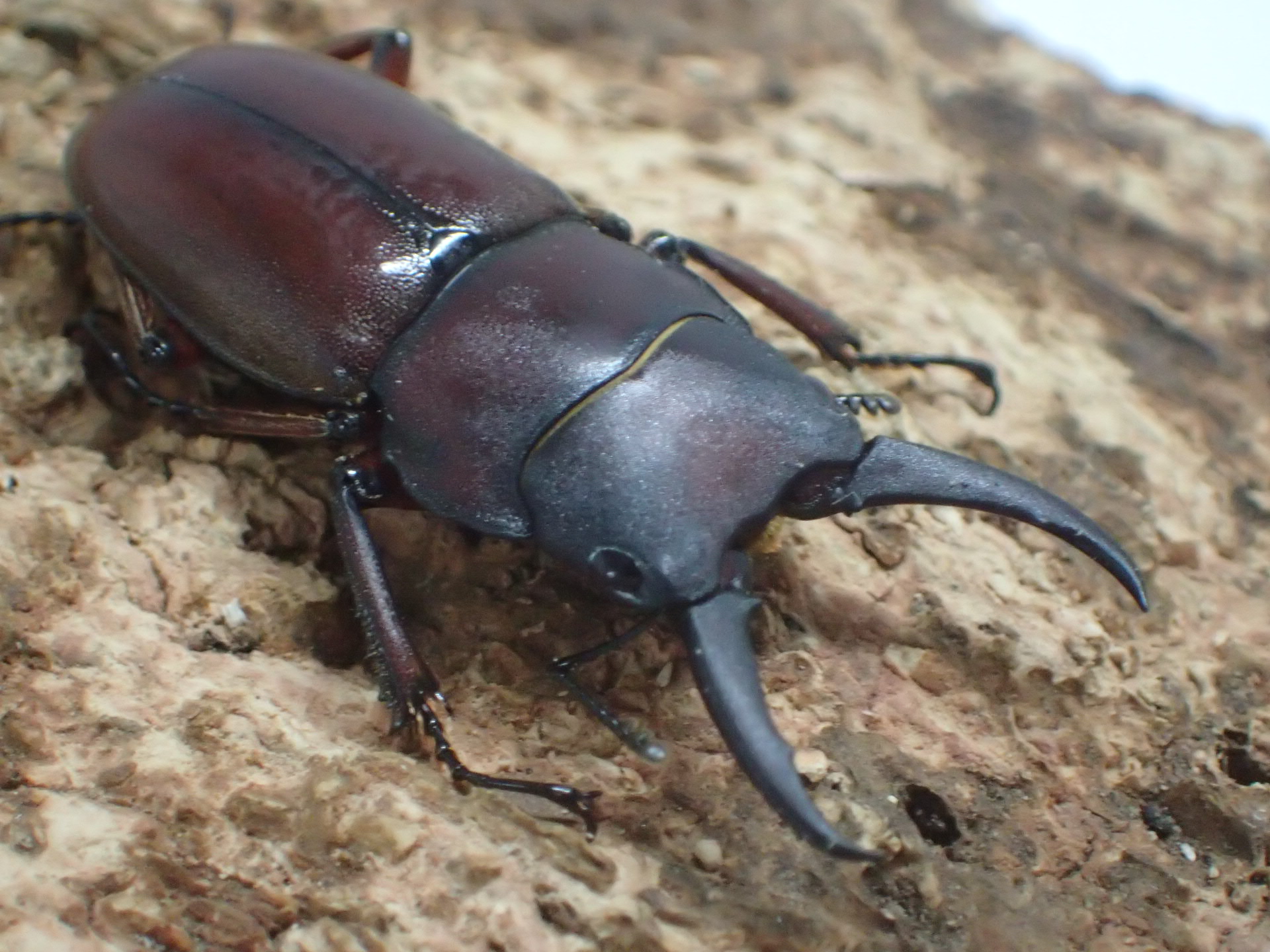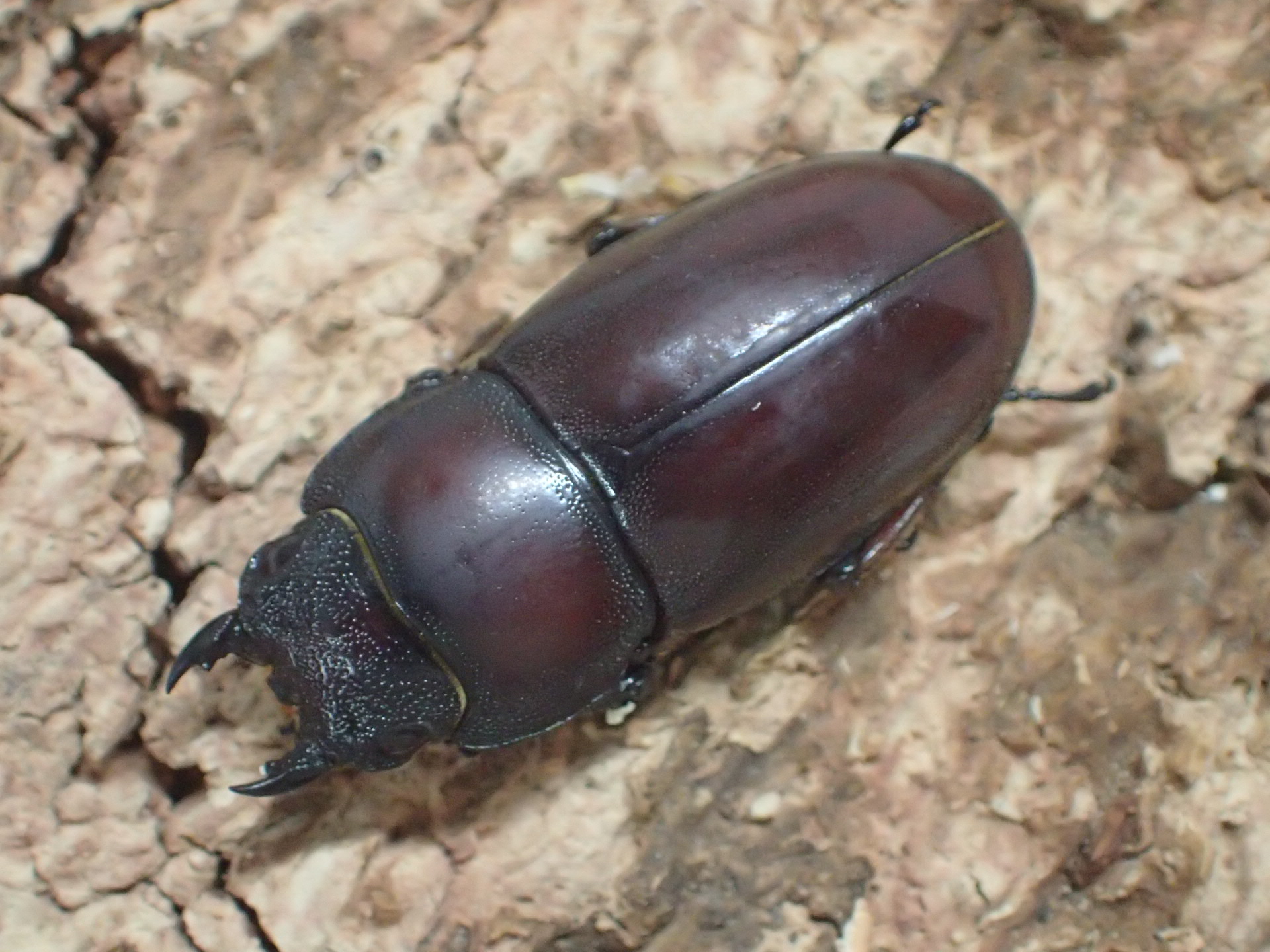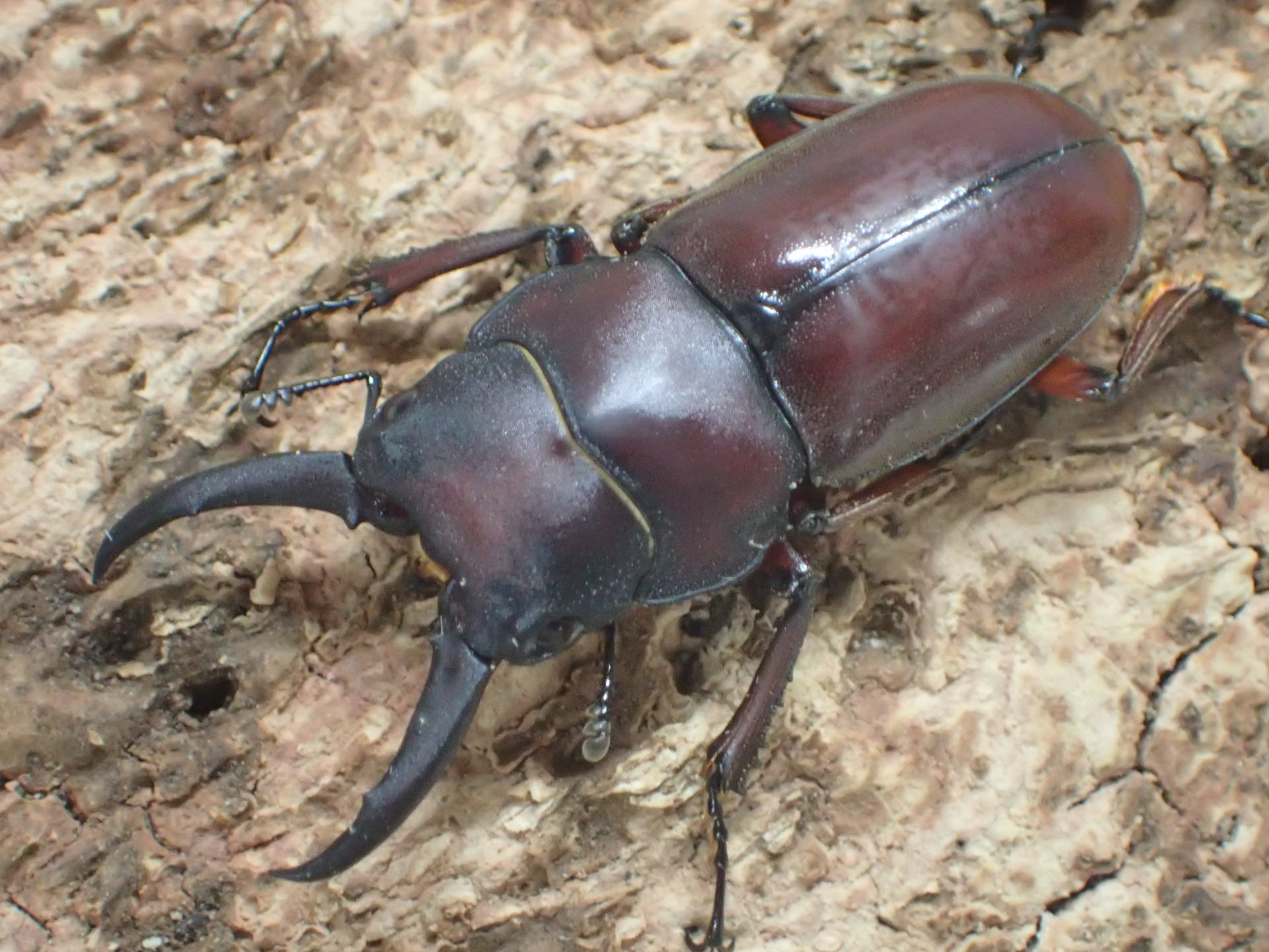 ロメオノコギリクワガタに似ていますが、オスの体はやや光沢があり全身が暗褐色をしています。