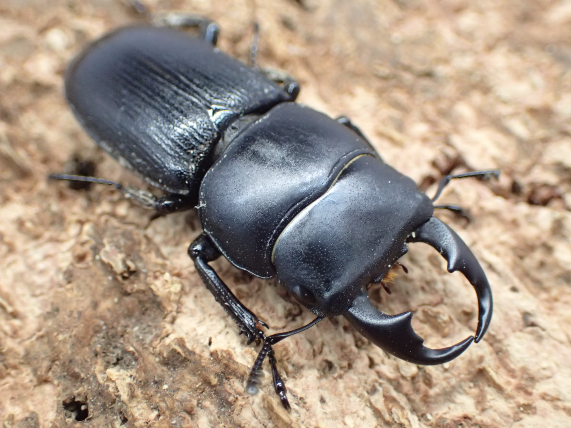 ライヒヒラタよりややツヤ消しで、ハンステインヒラタクワガタに比べ光沢が強く、大アゴはライヒヒラタに比べて直線的で、先端はライヒヒラタより強く内側に湾曲します。
