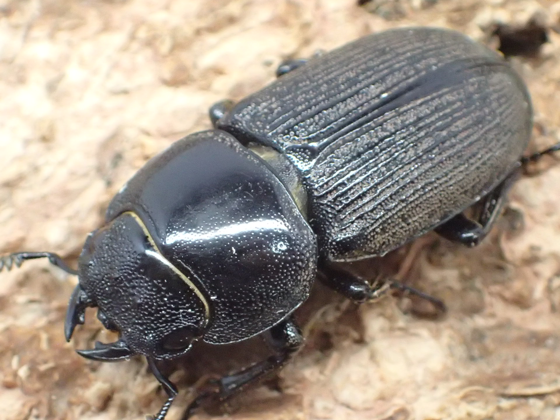 ライヒヒラタよりややツヤ消しで、ハンステインヒラタクワガタに比べ光沢が強く、大アゴはライヒヒラタに比べて直線的で、先端はライヒヒラタより強く内側に湾曲します。